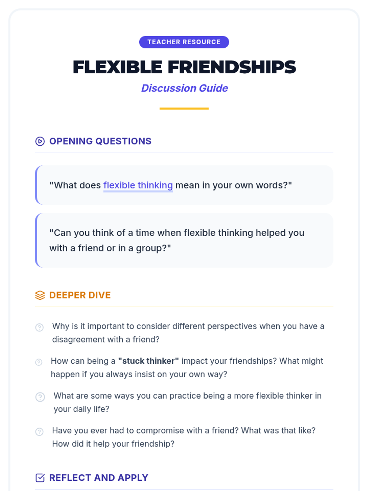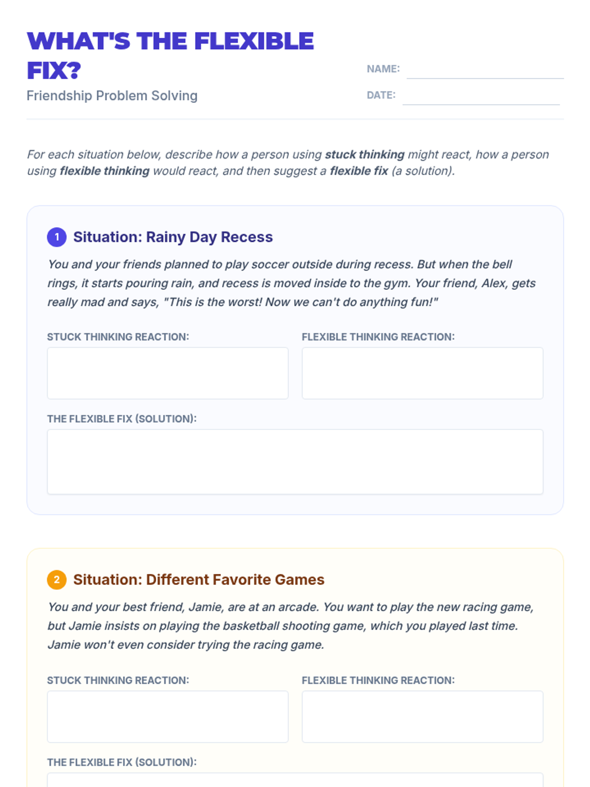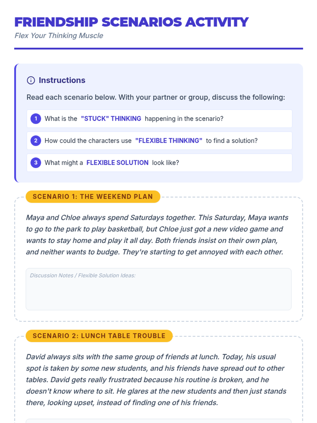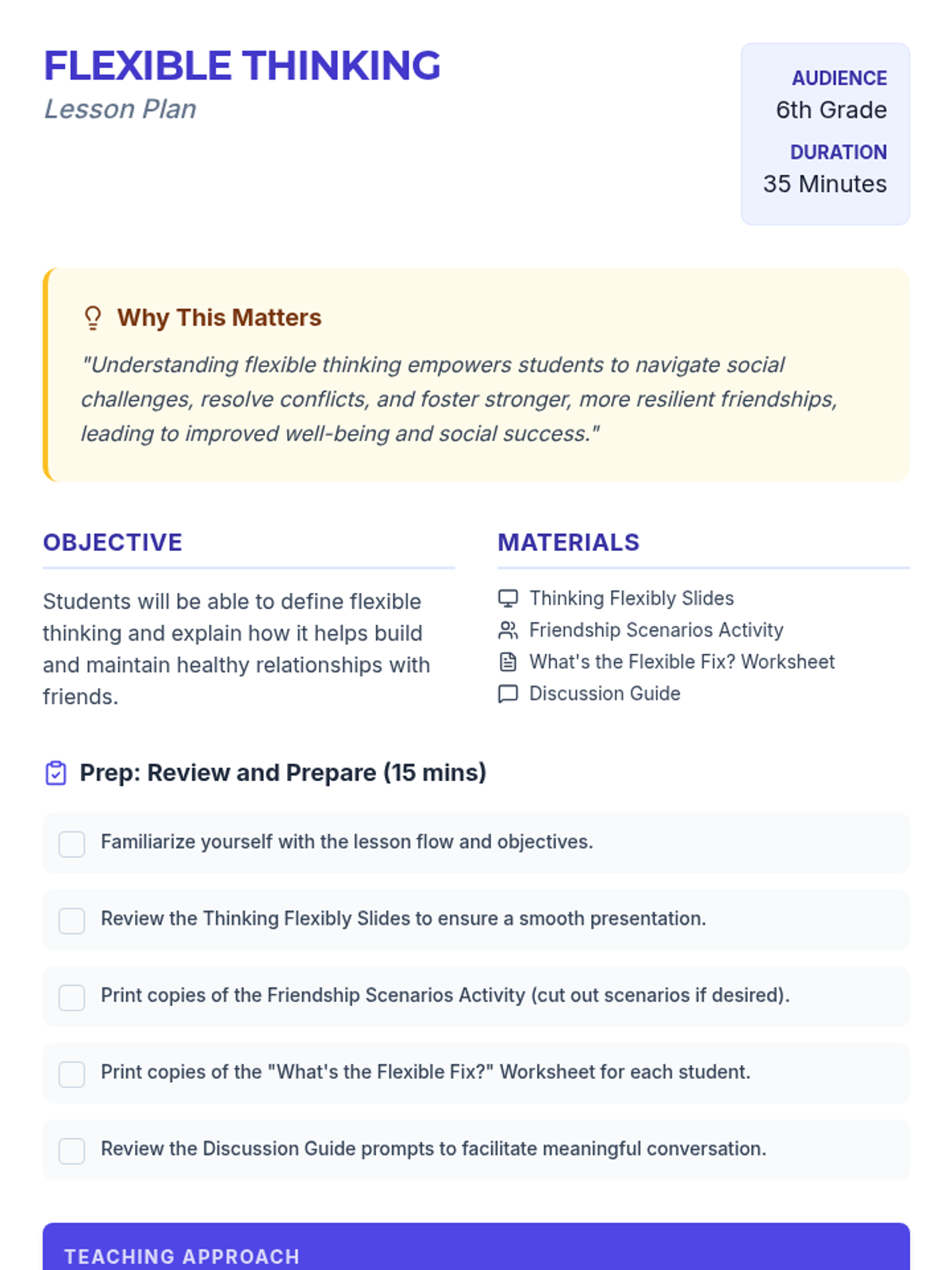 A 35-minute social-emotional learning lesson for 6th graders that defines flexible thinking and applies it to building resilient friendships through scenarios and role-play.