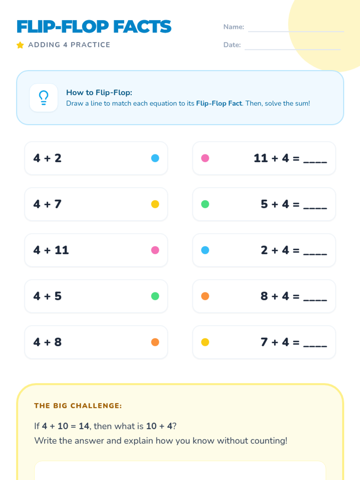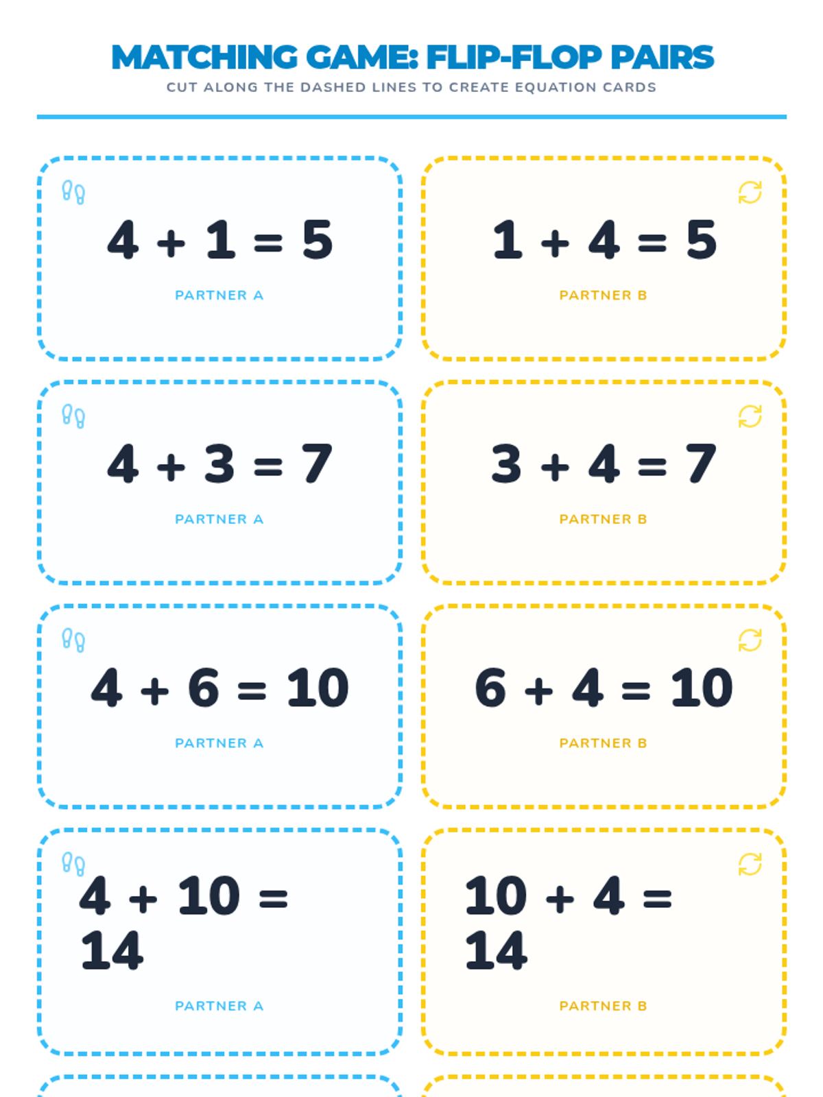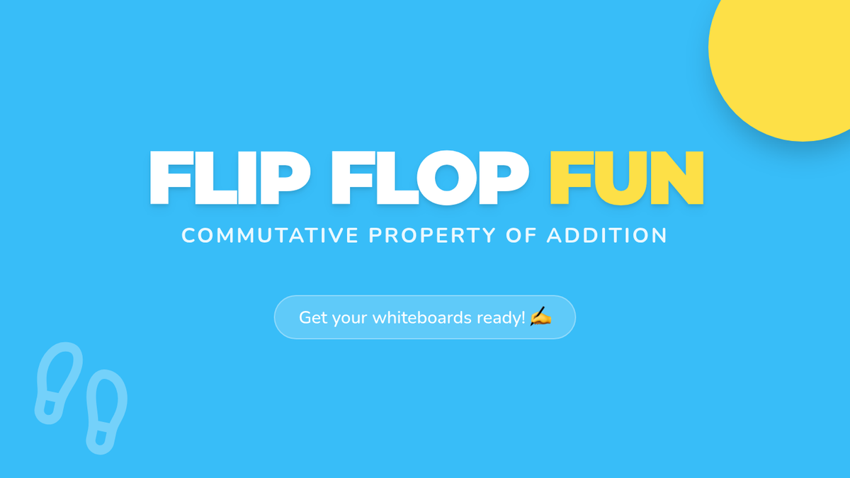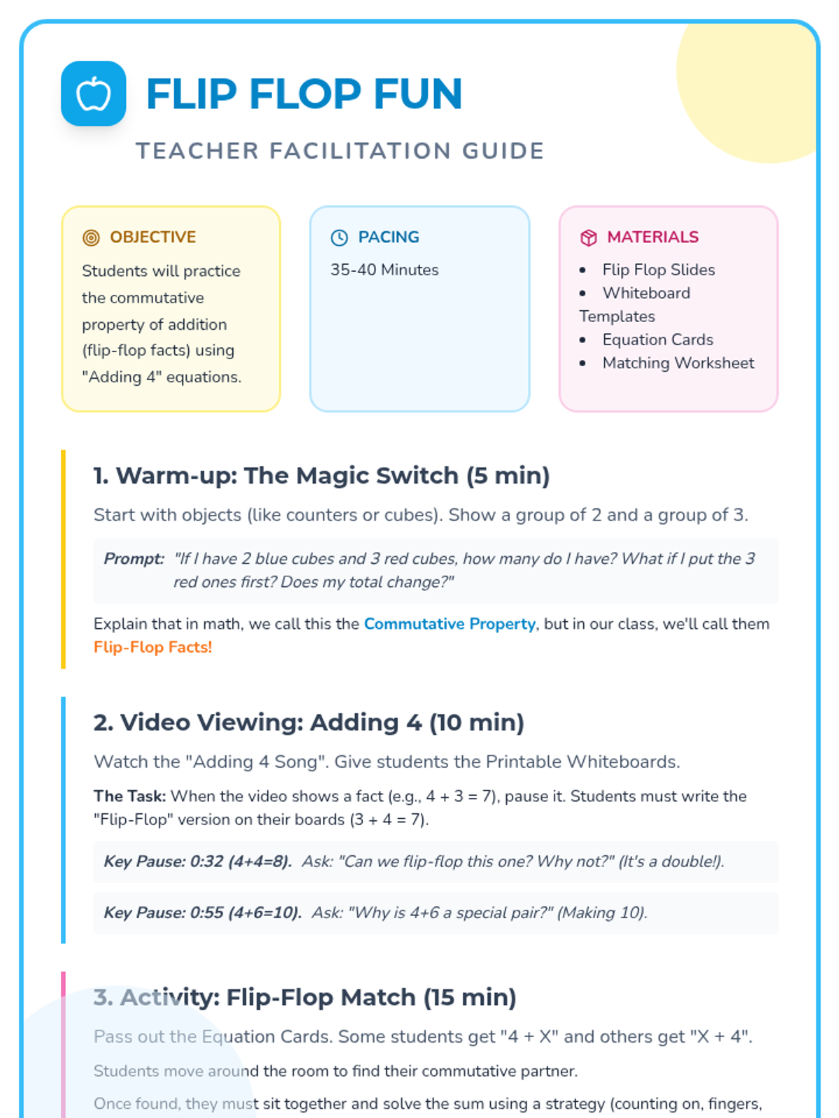 A vibrant 1st-grade lesson introducing the commutative property of addition through the 'Adding 4' song and interactive flip-flop matching activities.