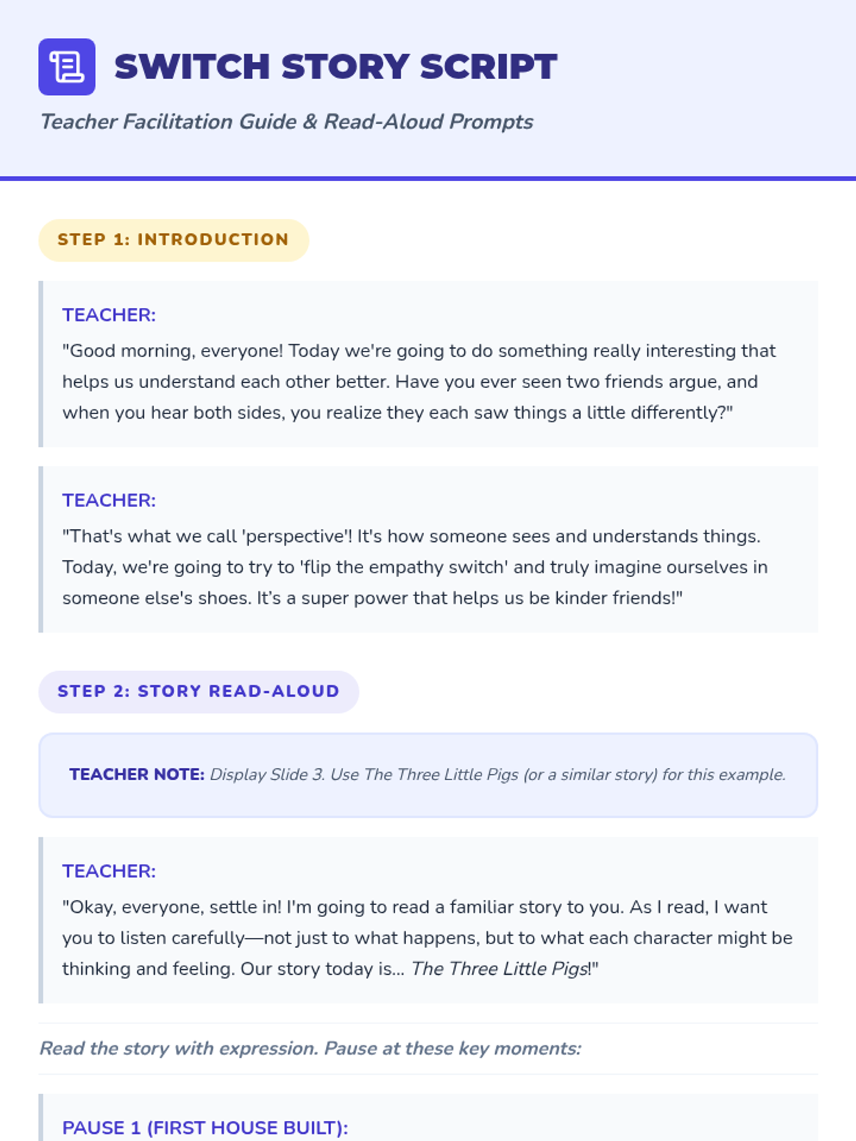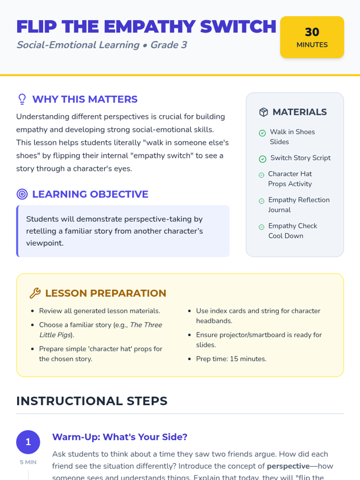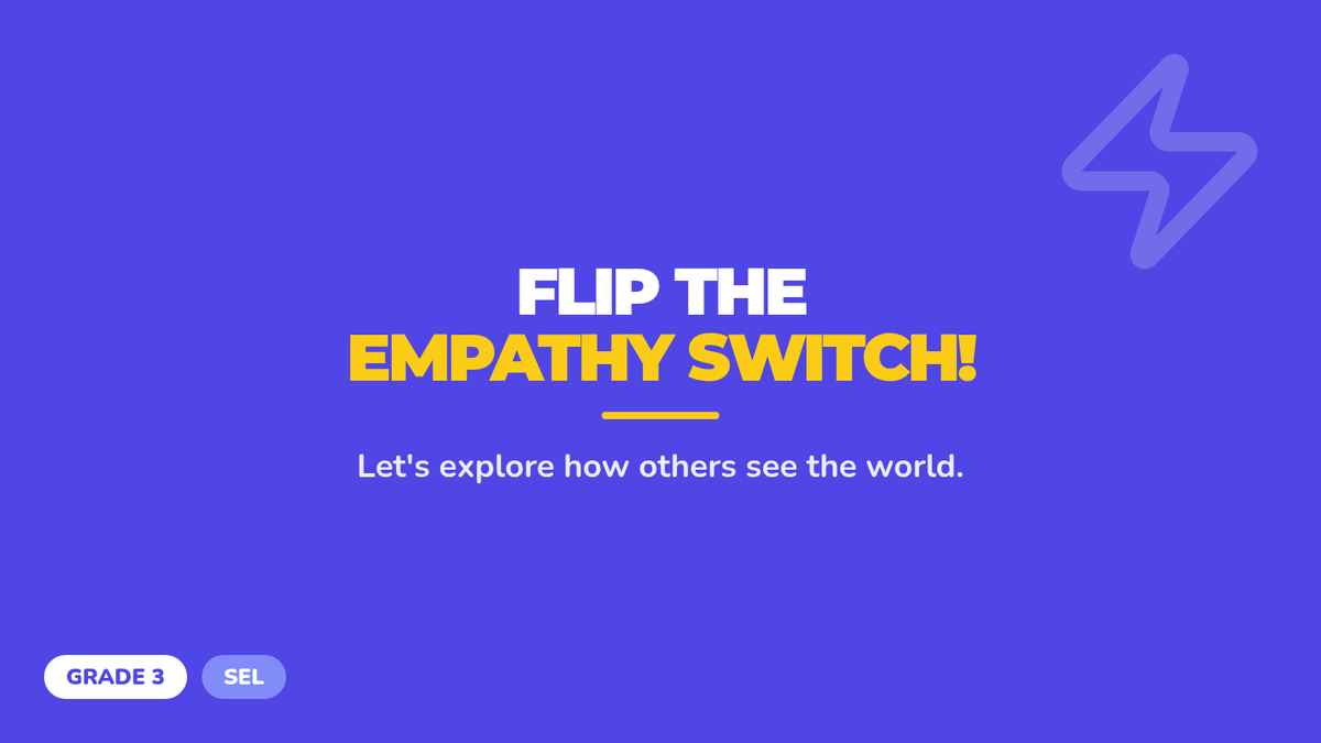 A 30-minute 3rd-grade lesson that helps students practice empathy by retelling familiar stories from different characters' perspectives. Students learn to 'flip the empathy switch' to understand diverse viewpoints.