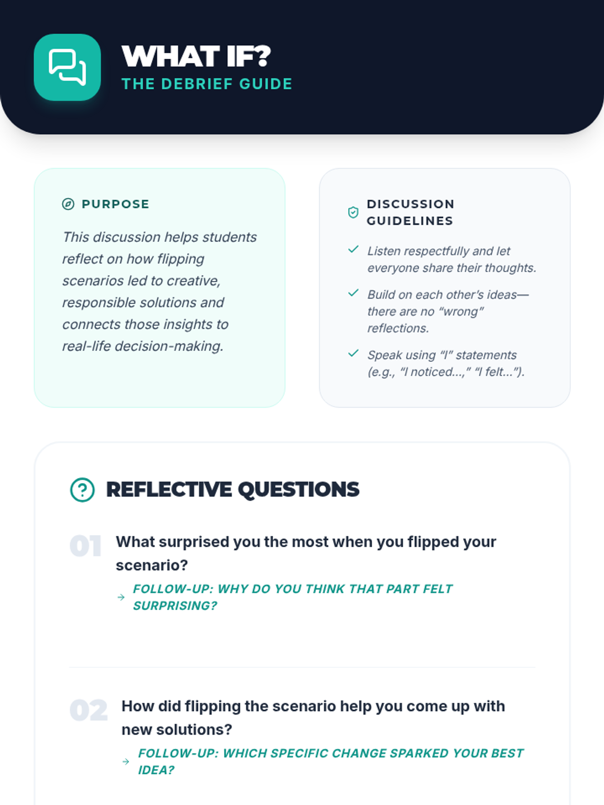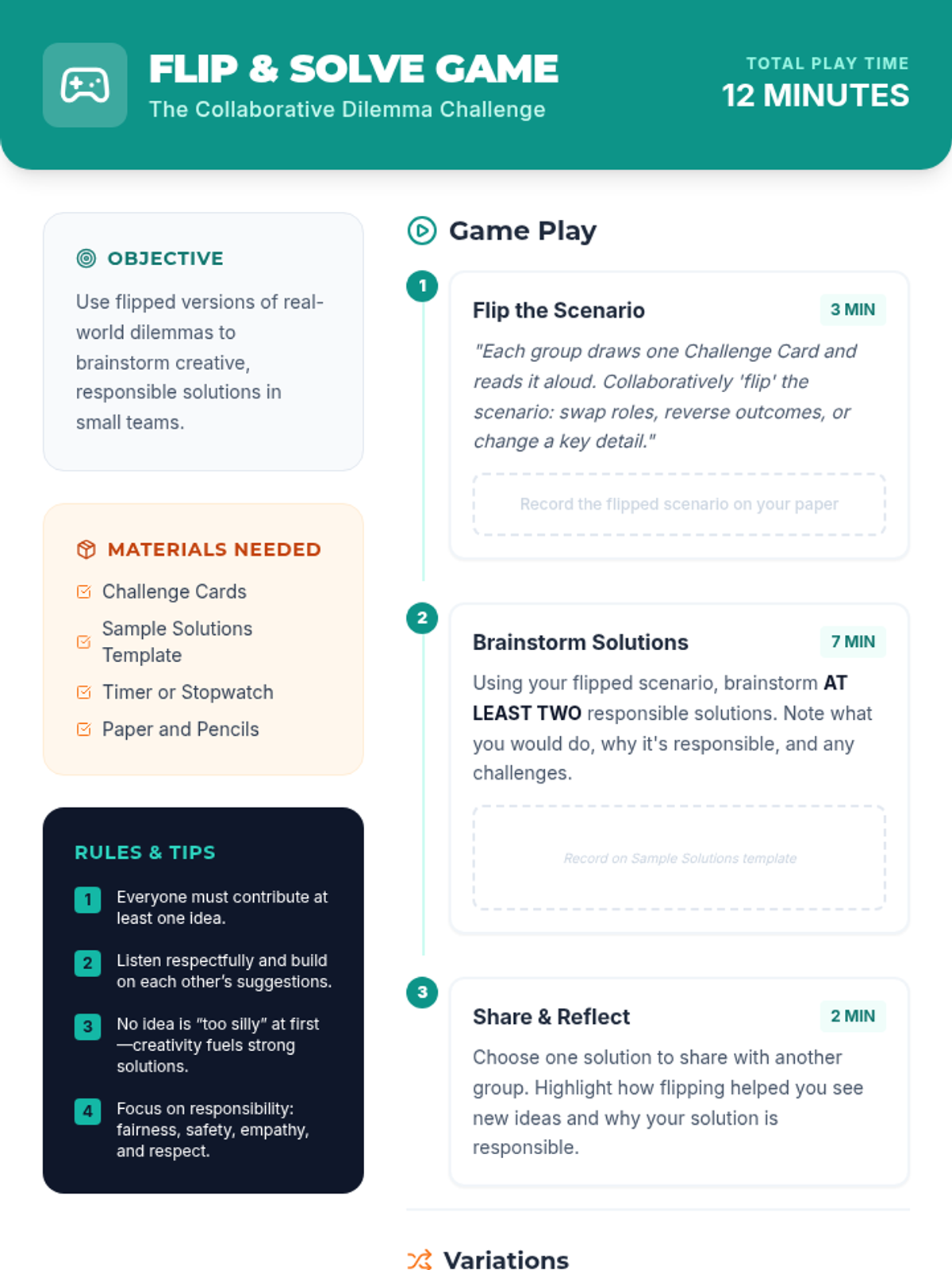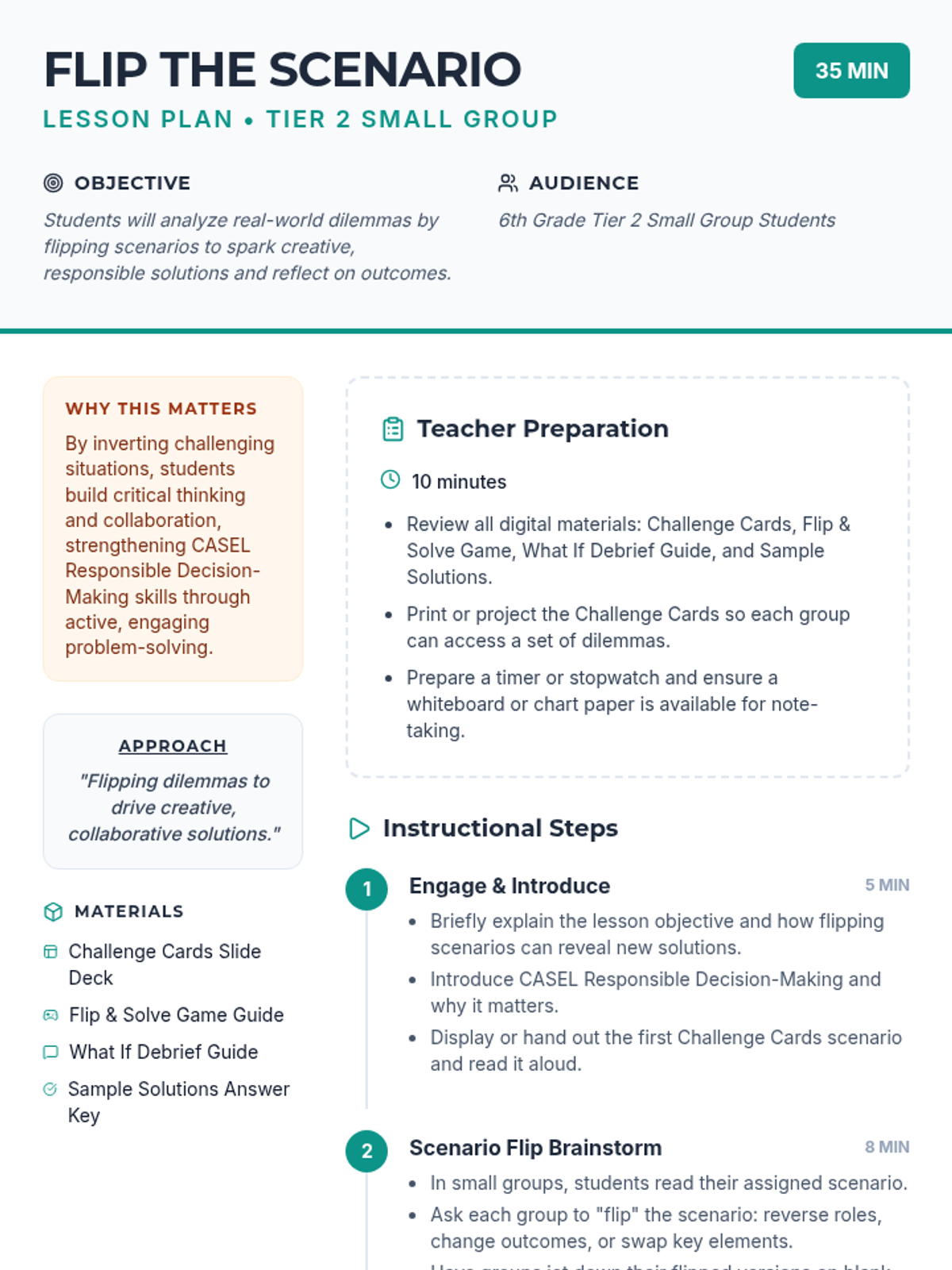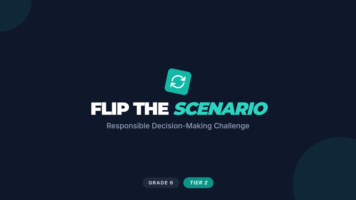 In this 35-minute, Tier 2 small-group game for 6th graders, students turn challenging dilemmas upside down to encourage creative and responsible decision-making. This lesson builds CASEL Responsible Decision-Making skills through scenario analysis, collaborative problem-solving, and reflective discussion.