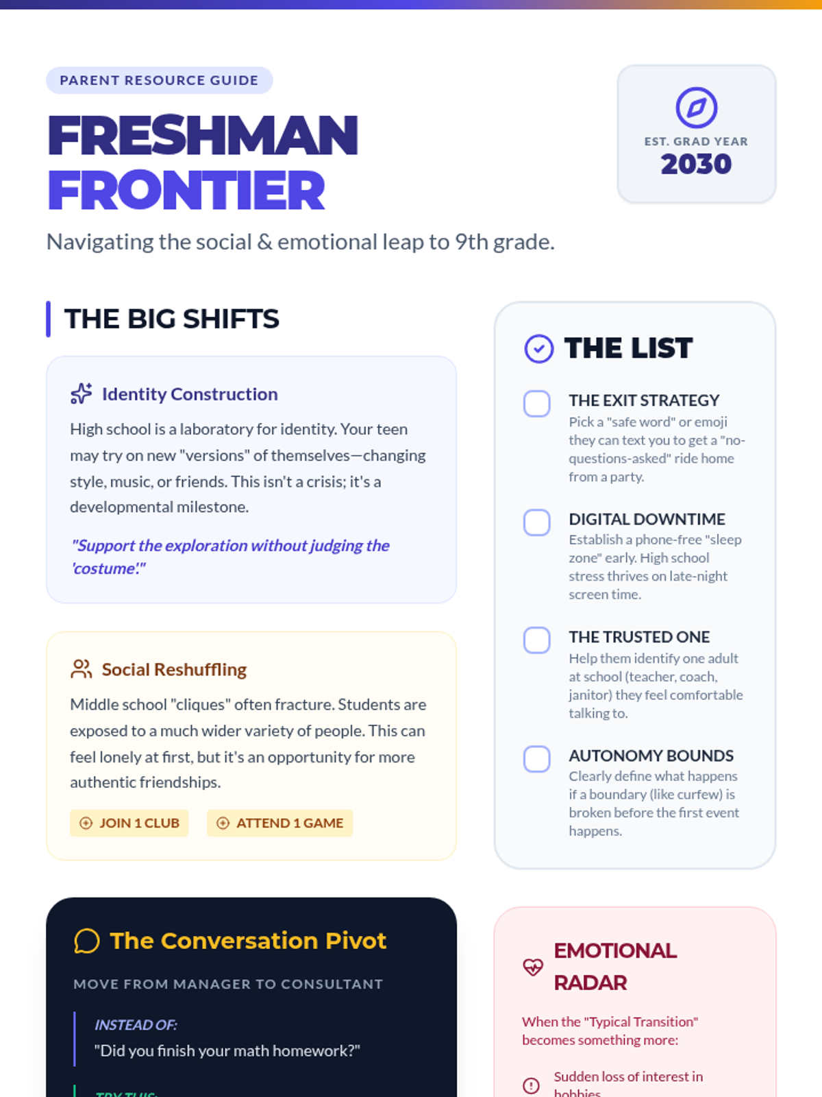 Resources for parents of rising 9th graders focusing on the social and emotional aspects of the high school transition.