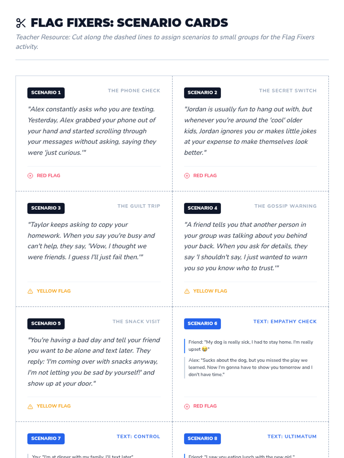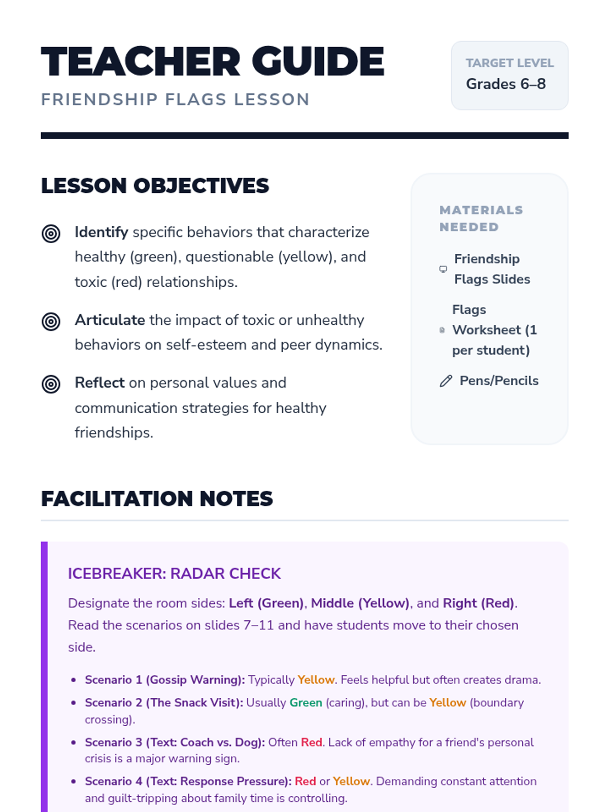 A lesson designed to help middle school students identify healthy and unhealthy behaviors in friendships using the 'flag' system and practice setting boundaries through scripts.