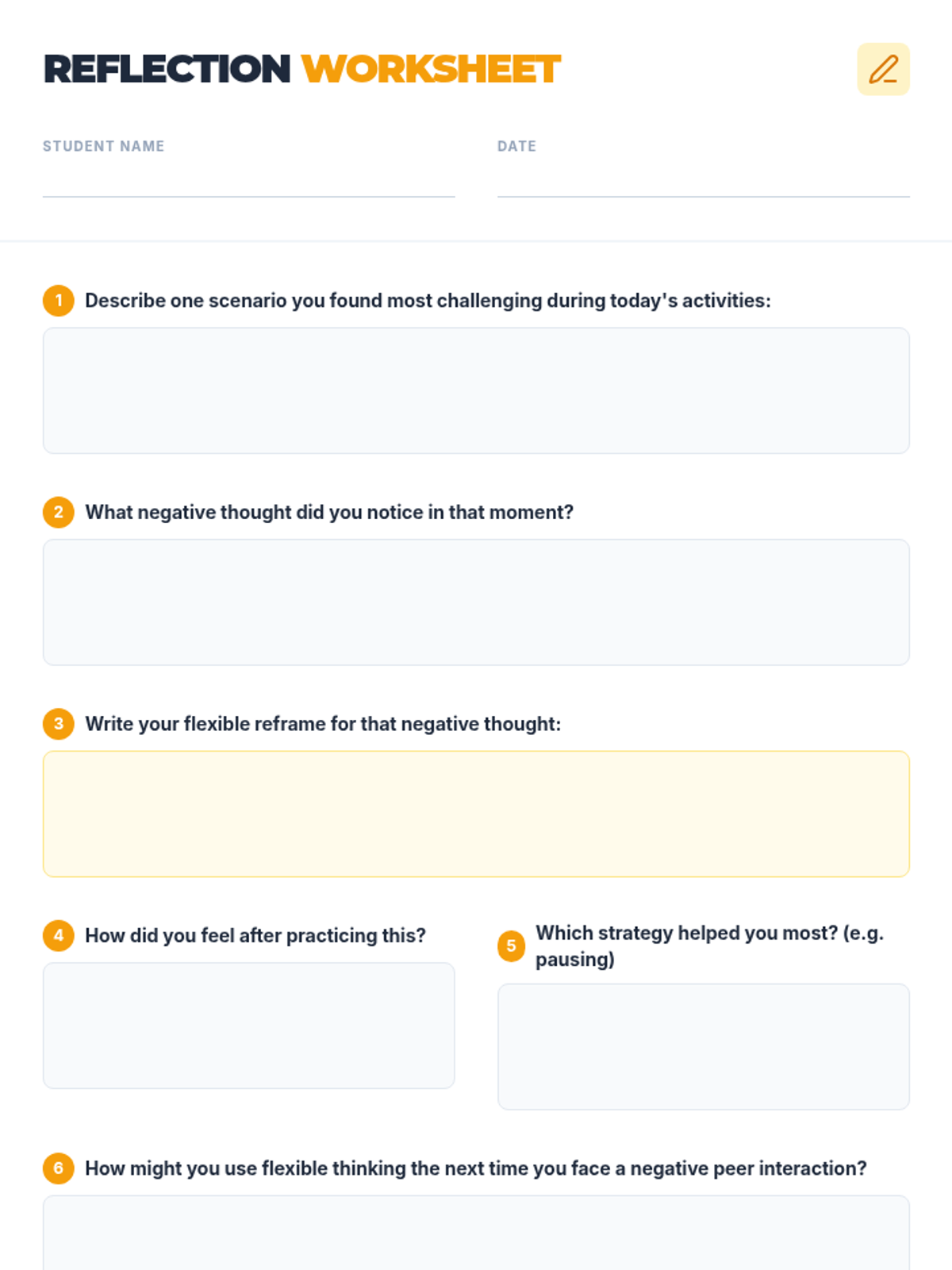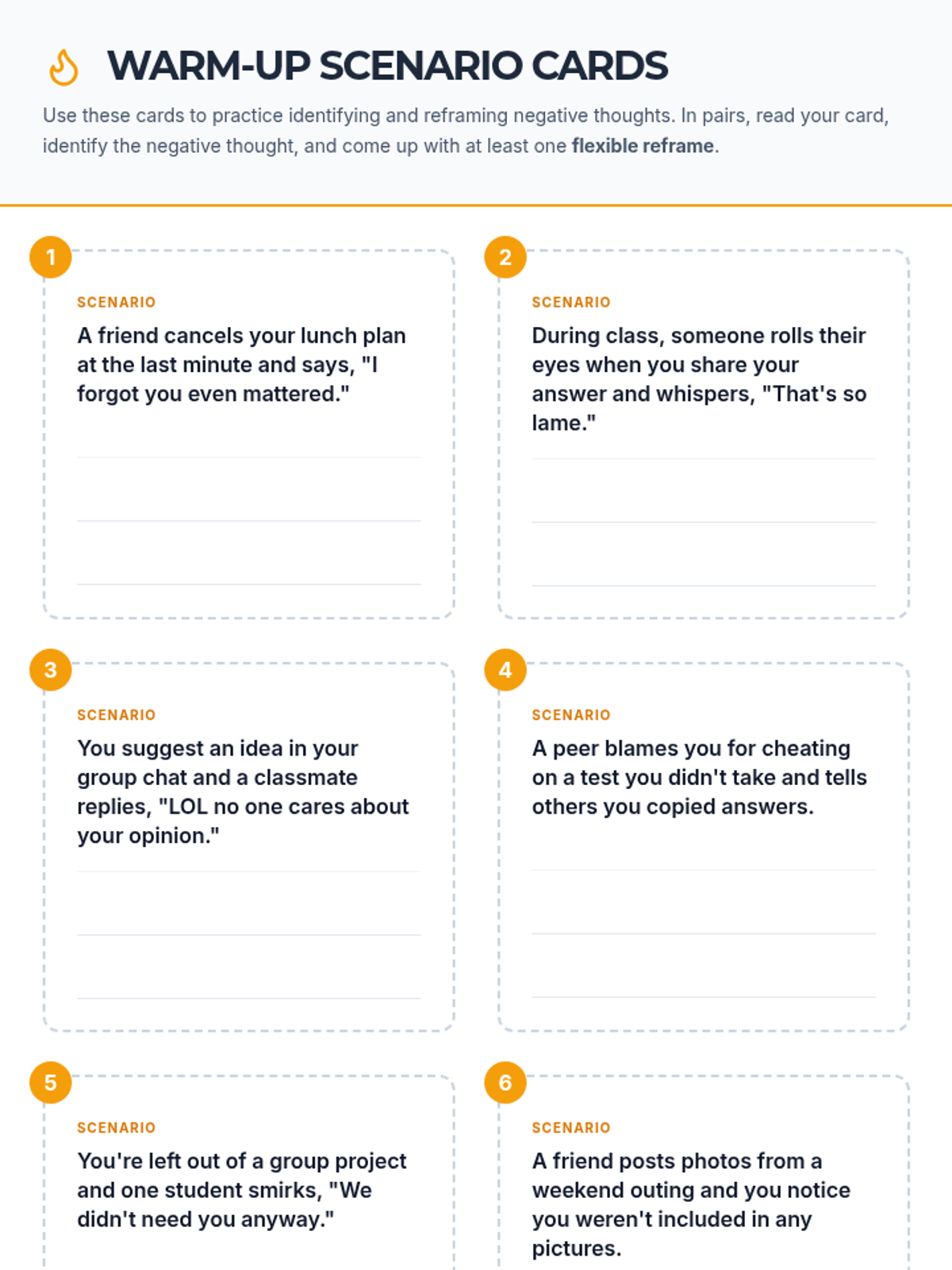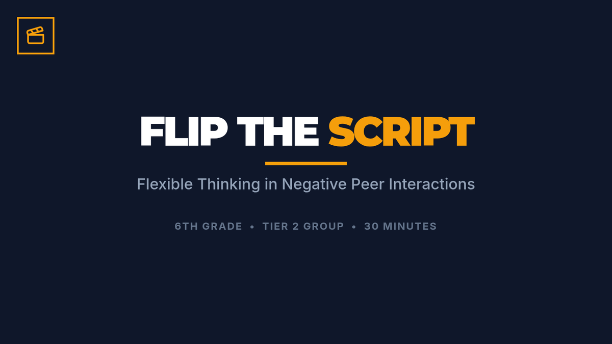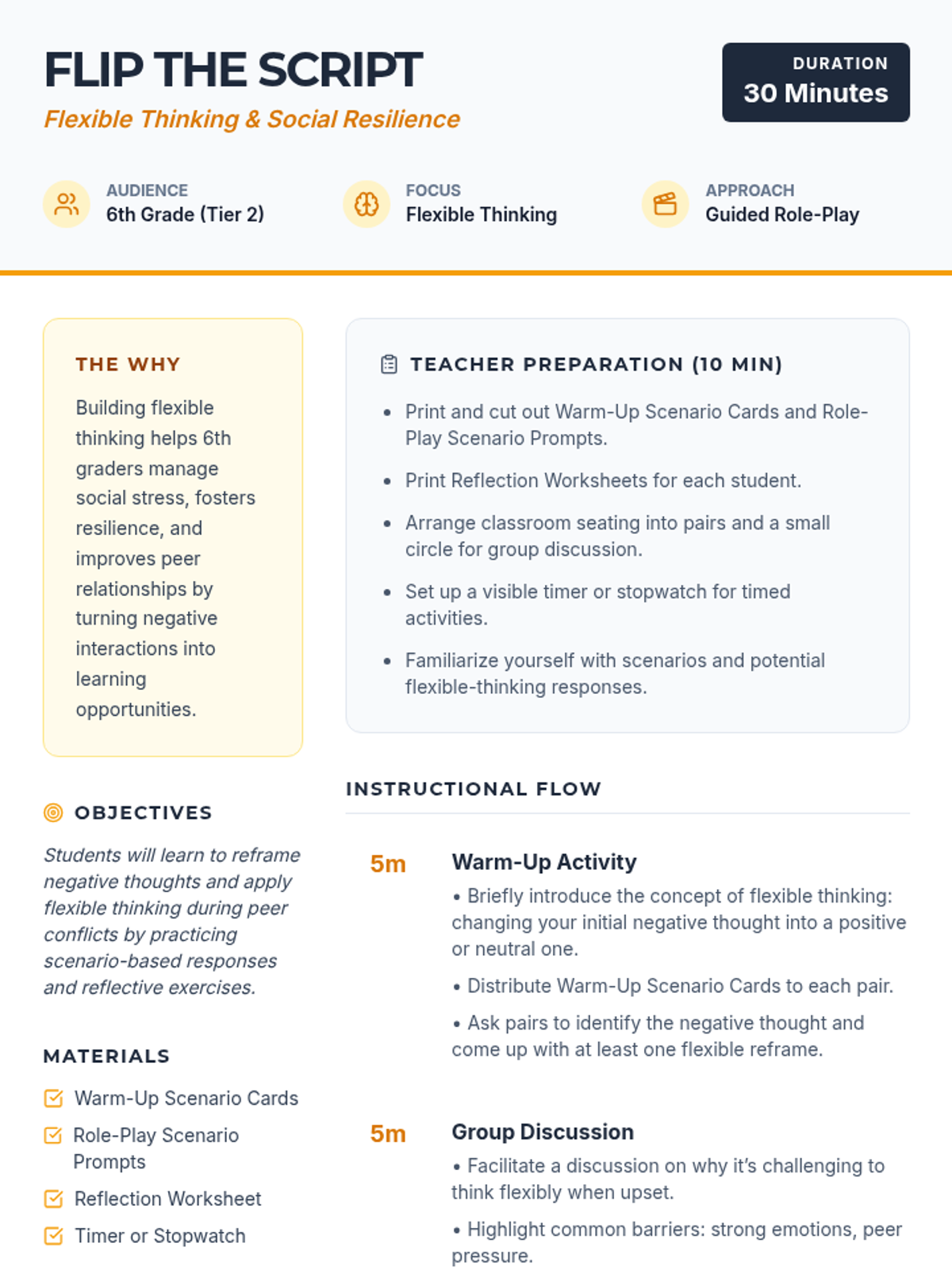 A 30-minute Tier 2 lesson for 6th graders focused on using flexible thinking to reframe negative peer interactions and build social resilience.