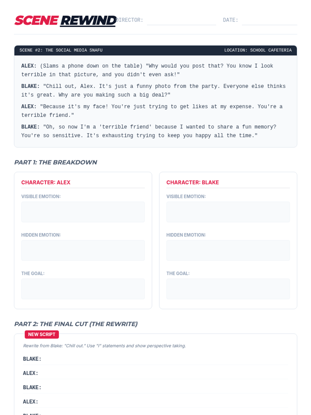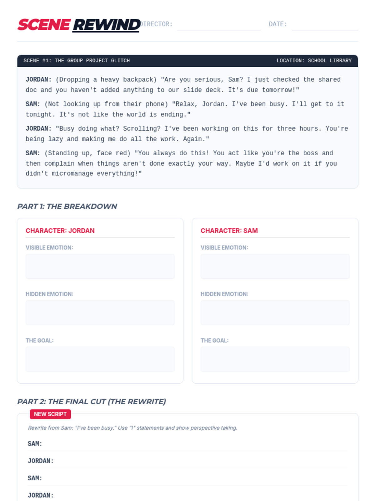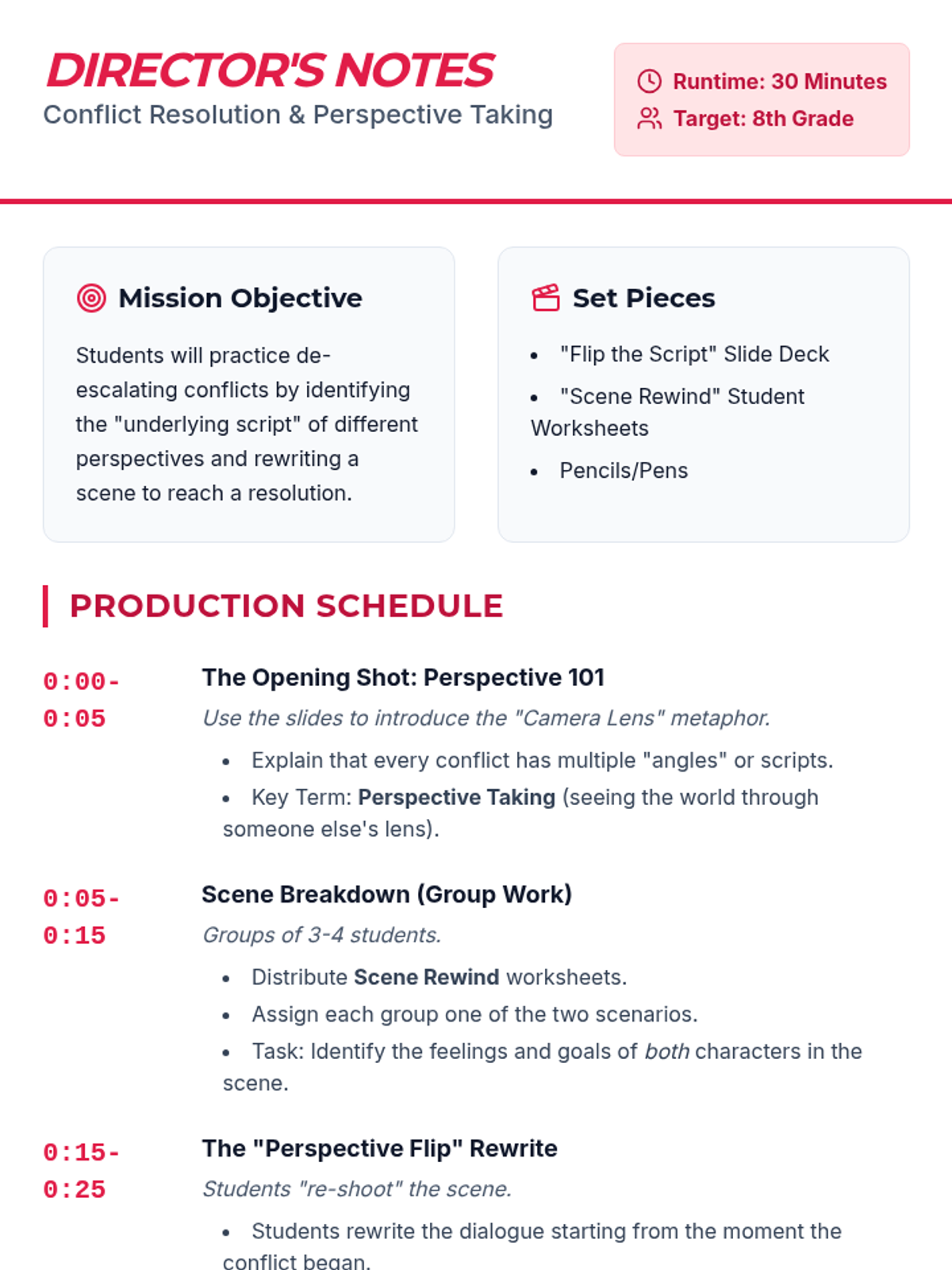A 30-minute interactive group activity focused on conflict resolution and perspective taking for 8th graders, themed around movie production and scriptwriting.