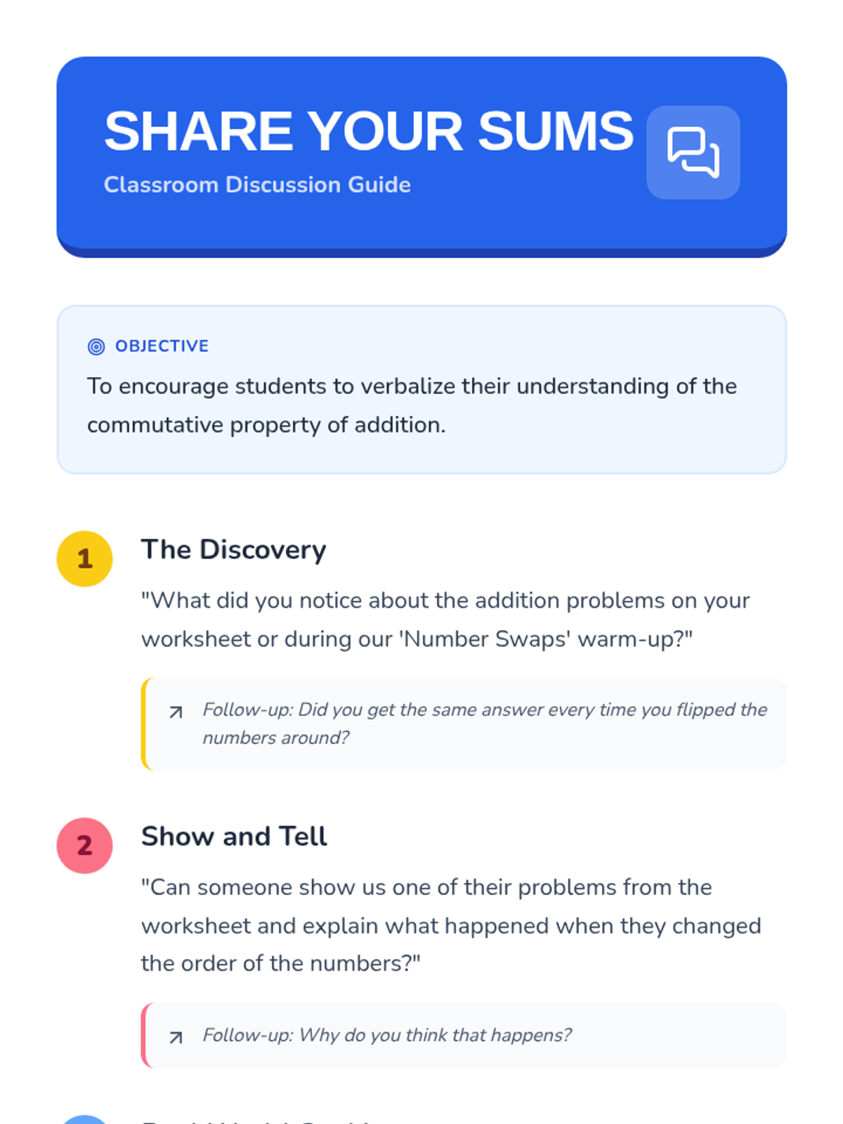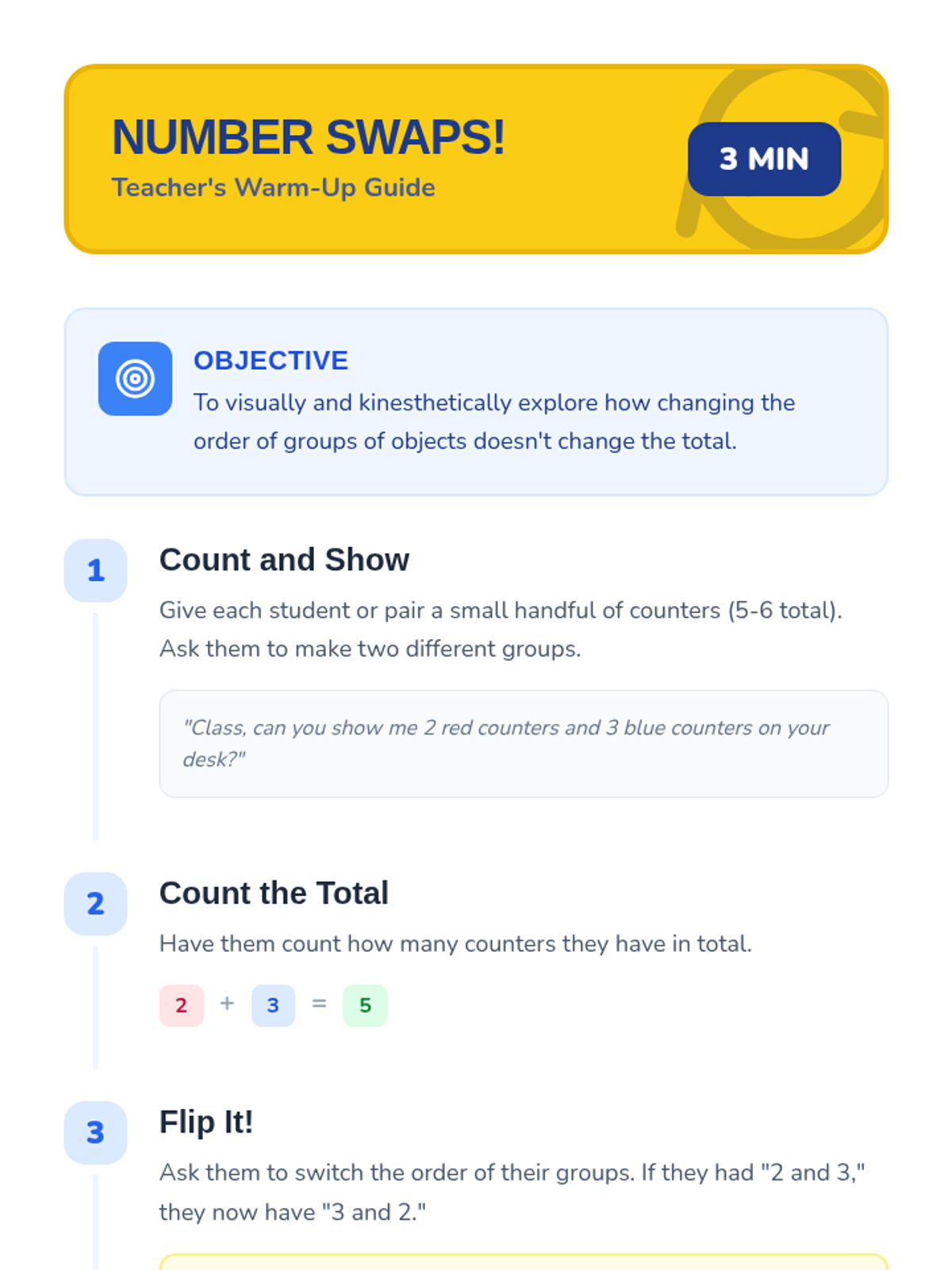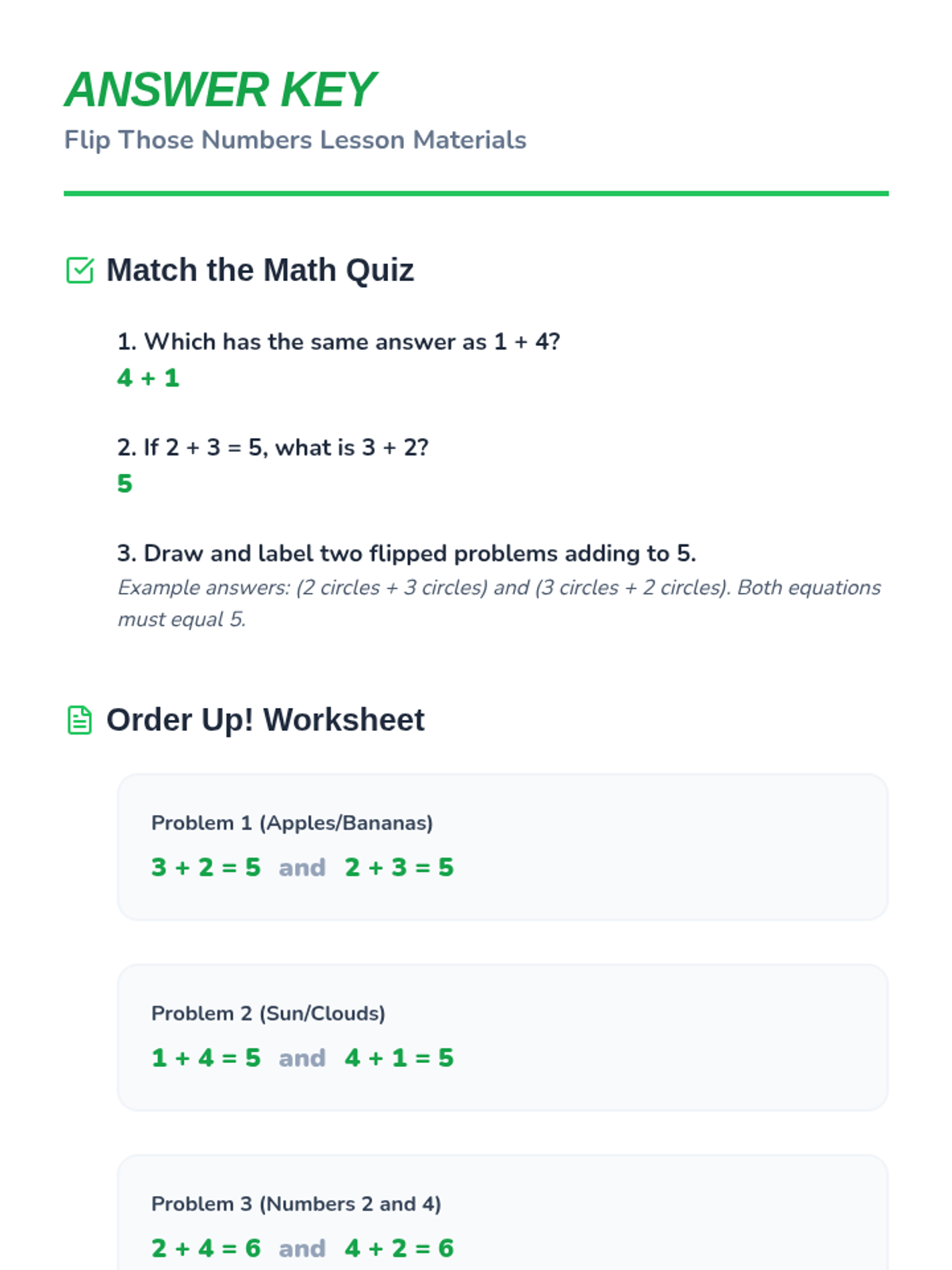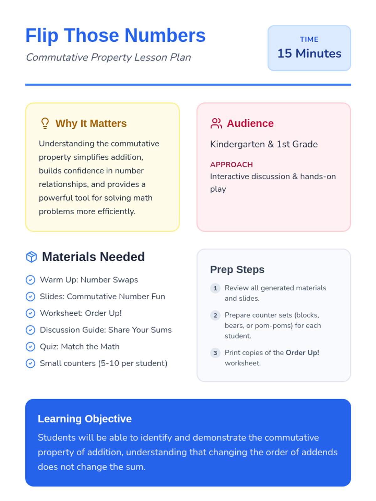 This interactive lesson introduces Kindergarten and first-grade students to the commutative property of addition using 'number flip-flops' to show that changing the order of addends doesn't change the sum.