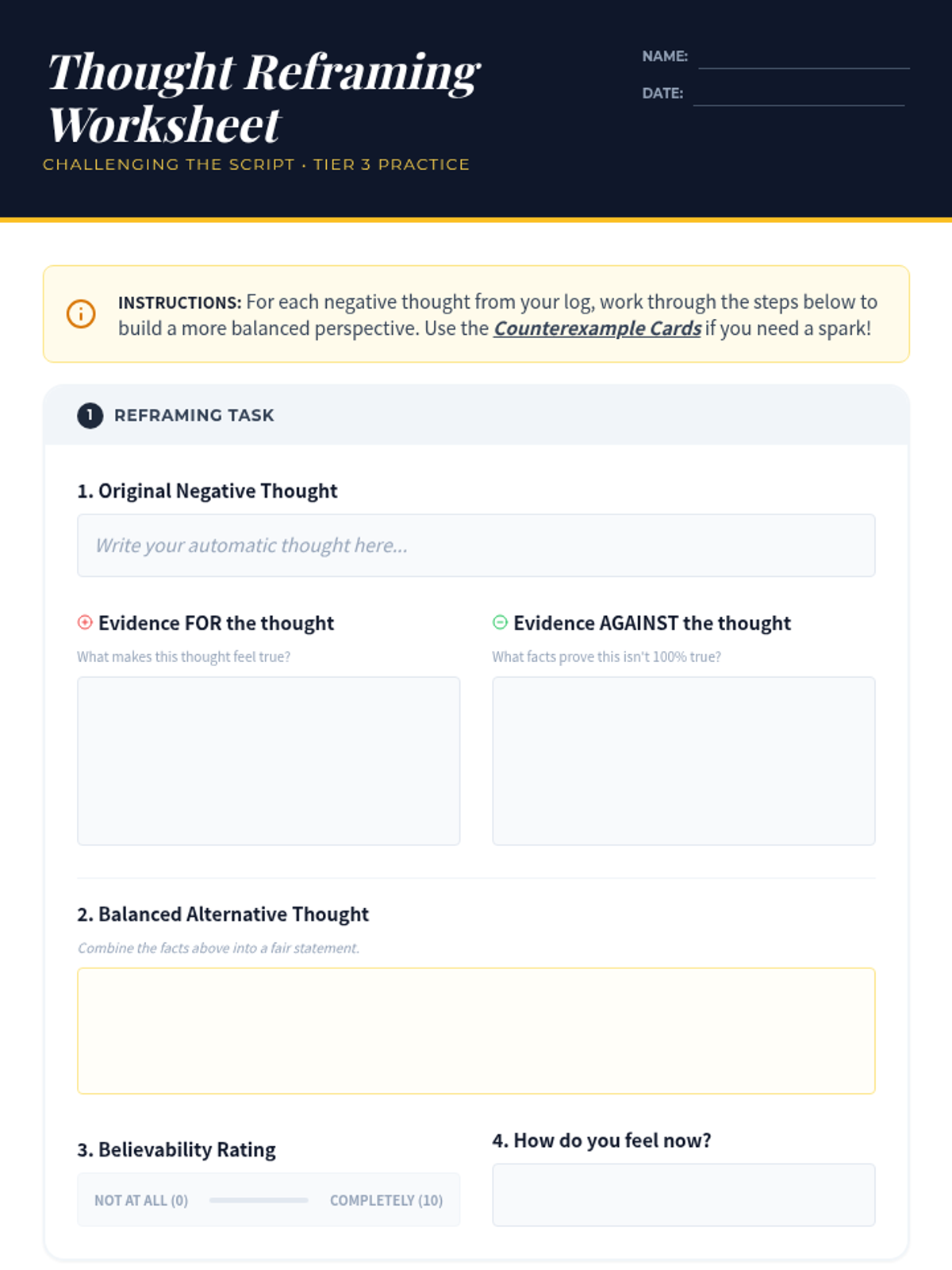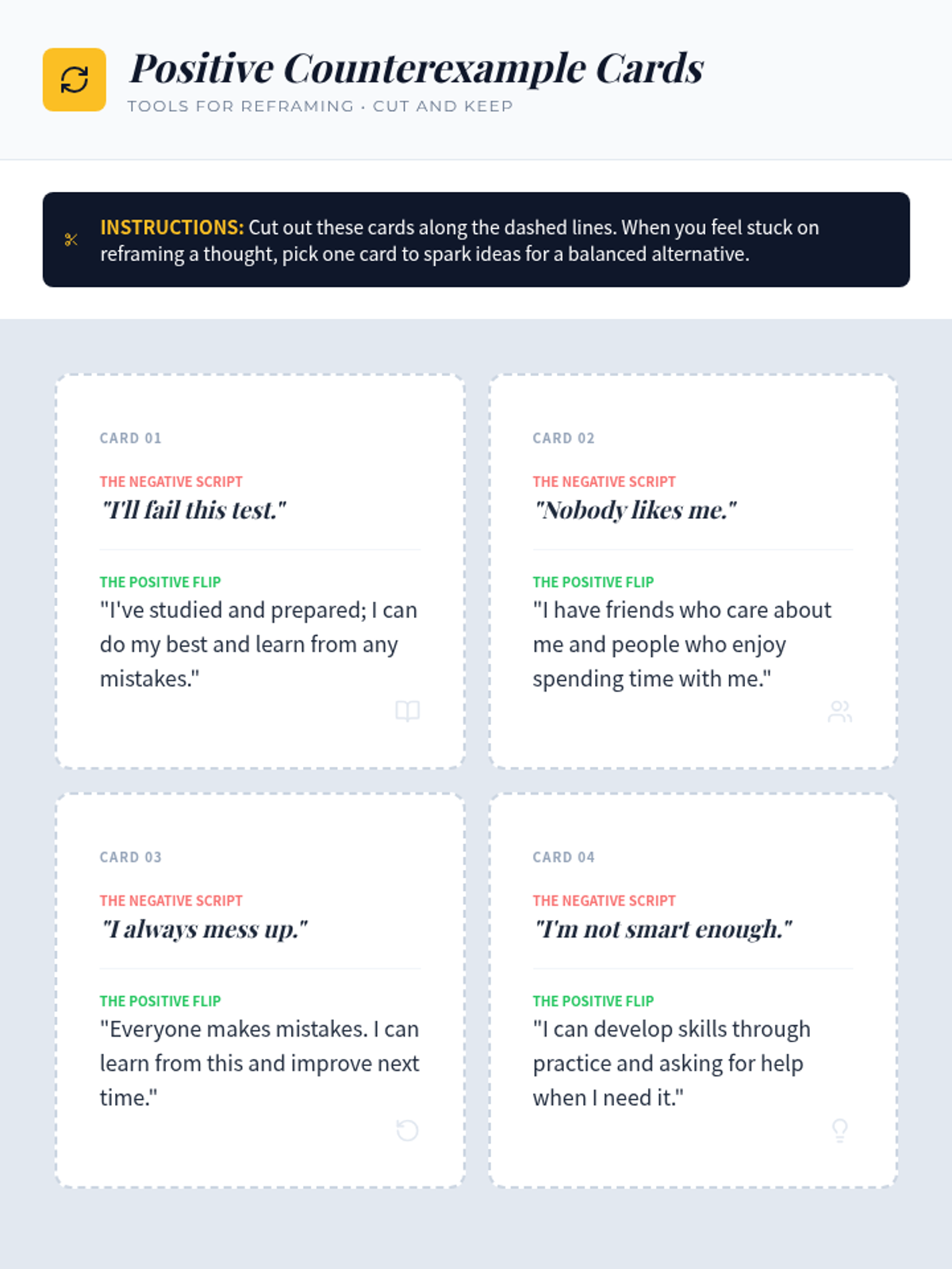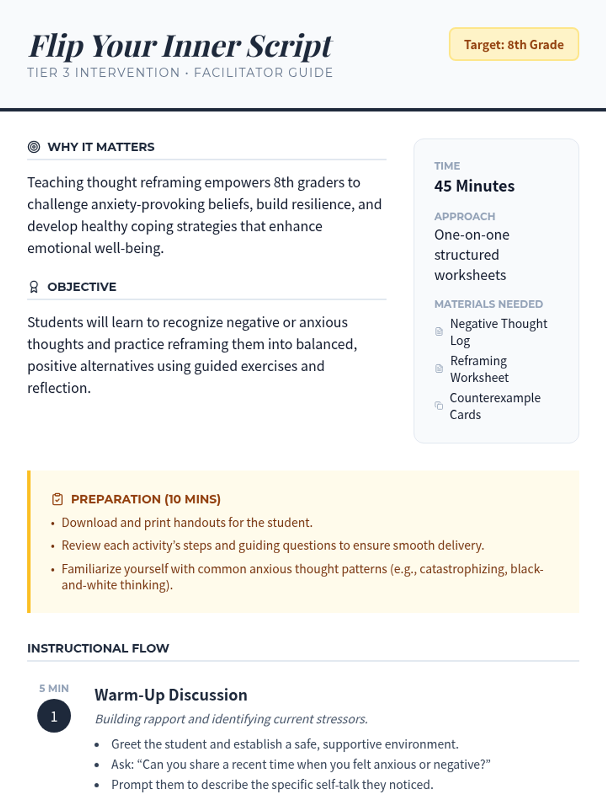 A 45-minute Tier 3 session for 8th graders to identify and reframe negative thoughts using evidence-based strategies to build resilience and emotional well-being.