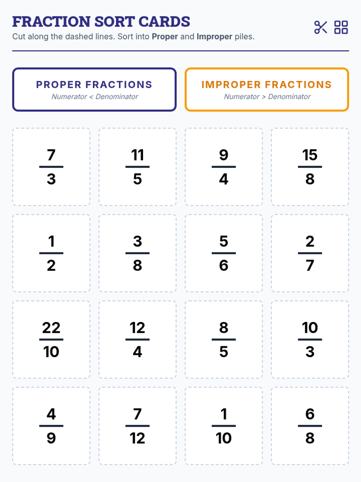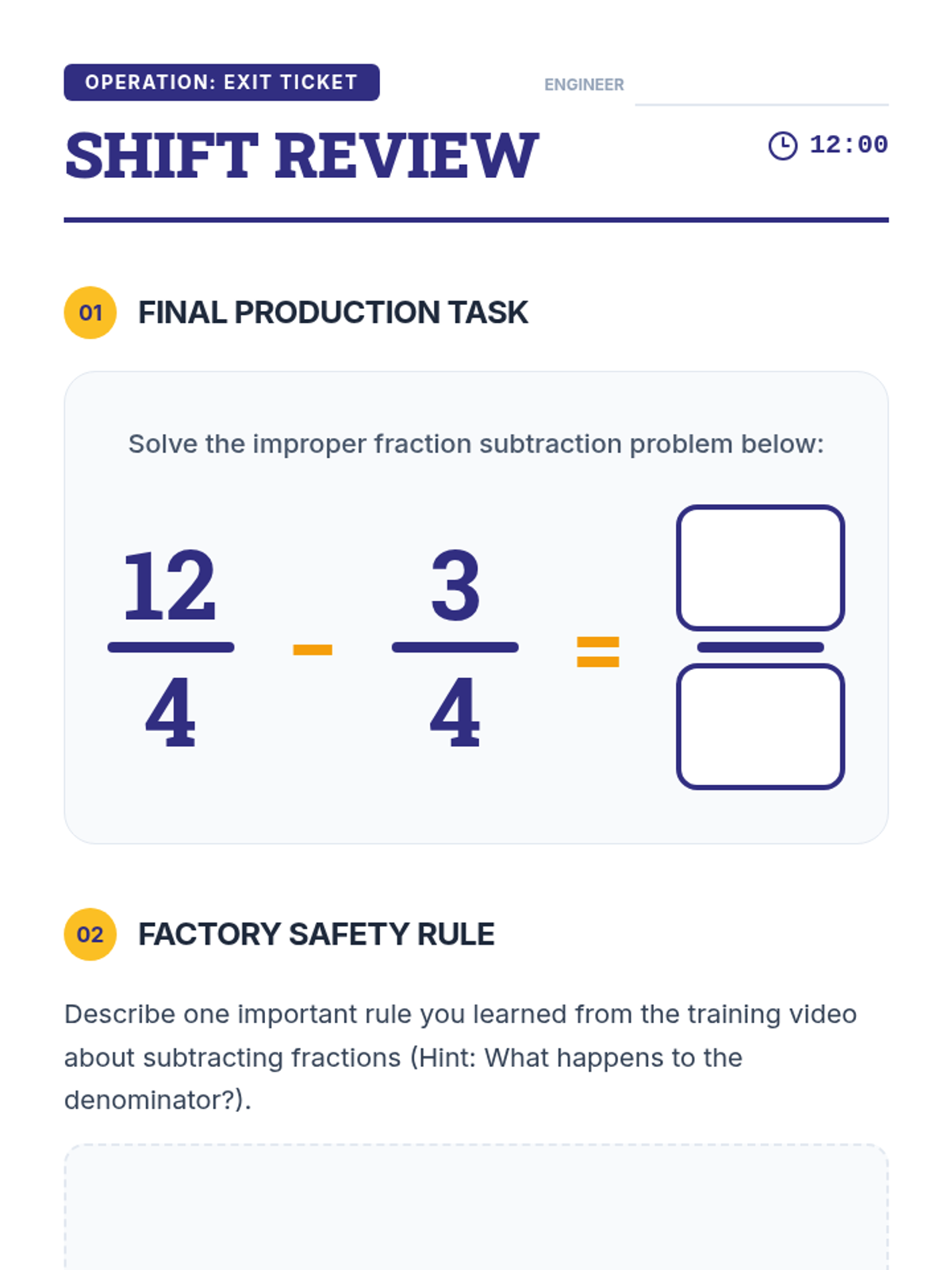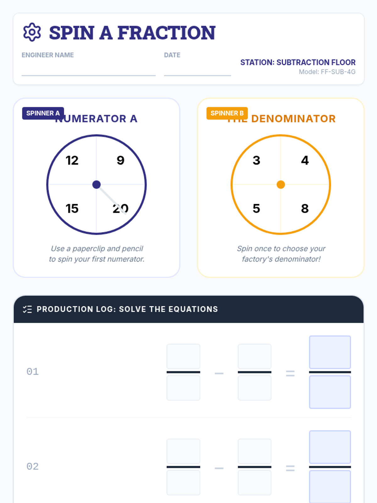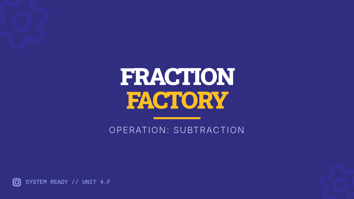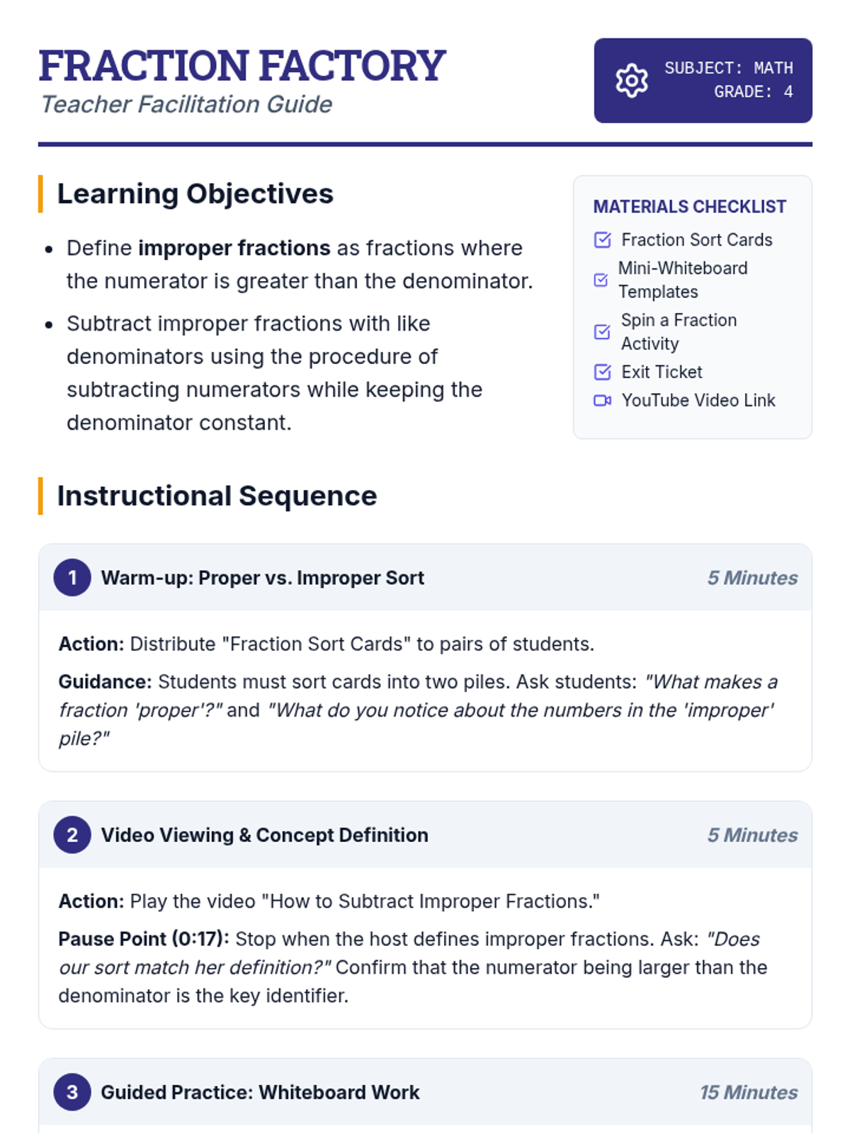 A 4th-grade lesson on defining improper fractions and subtracting them with like denominators using a robot-themed 'Fraction Factory' approach. Students will sort fractions, watch an instructional video with guided practice, and use spinners to generate and solve their own equations.