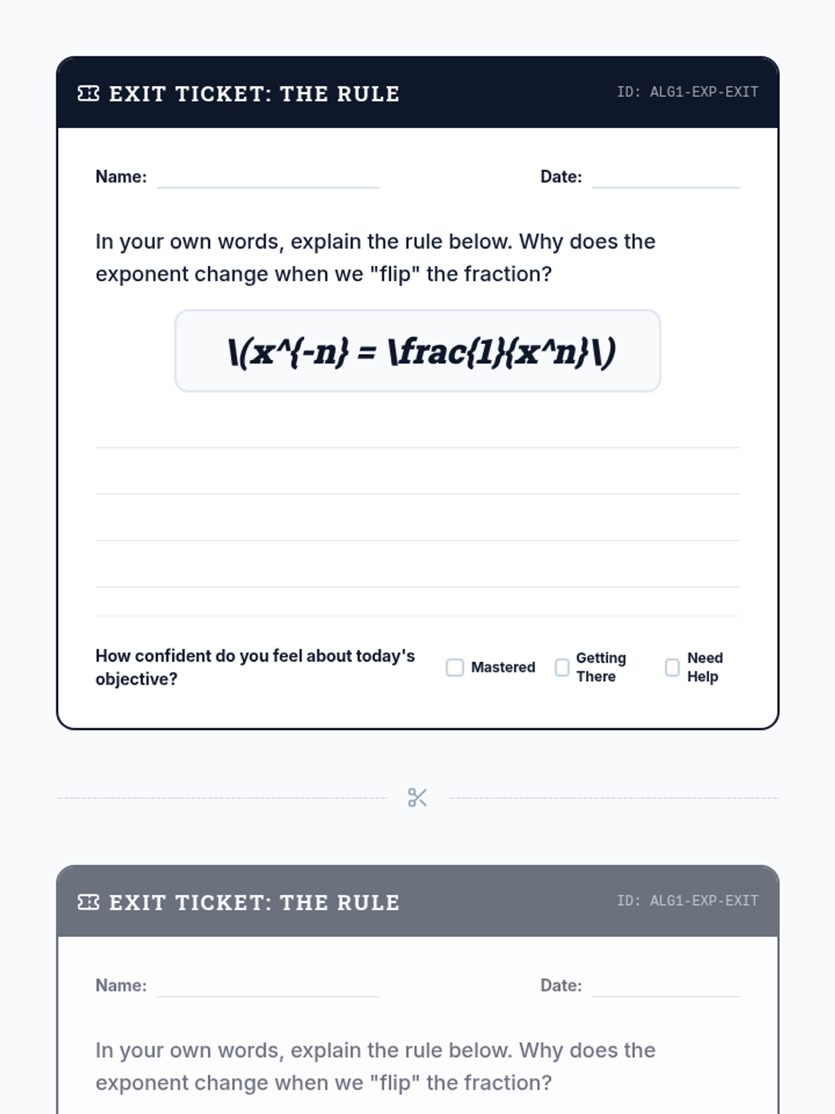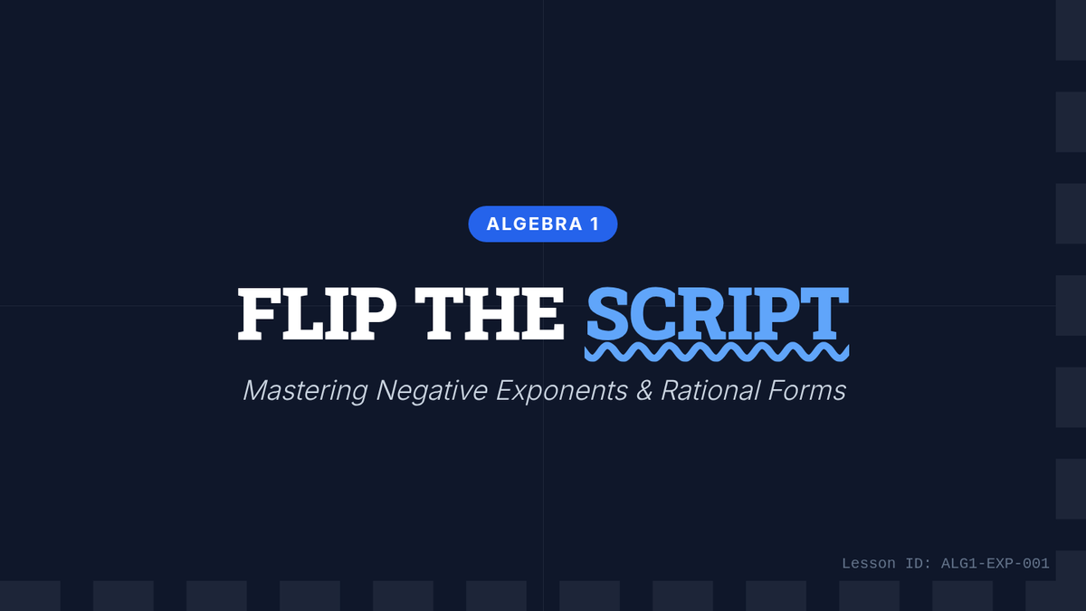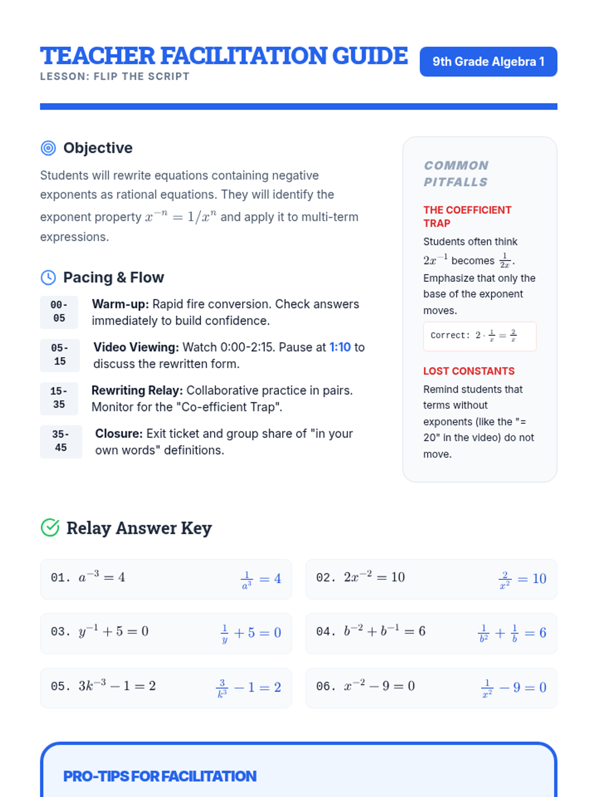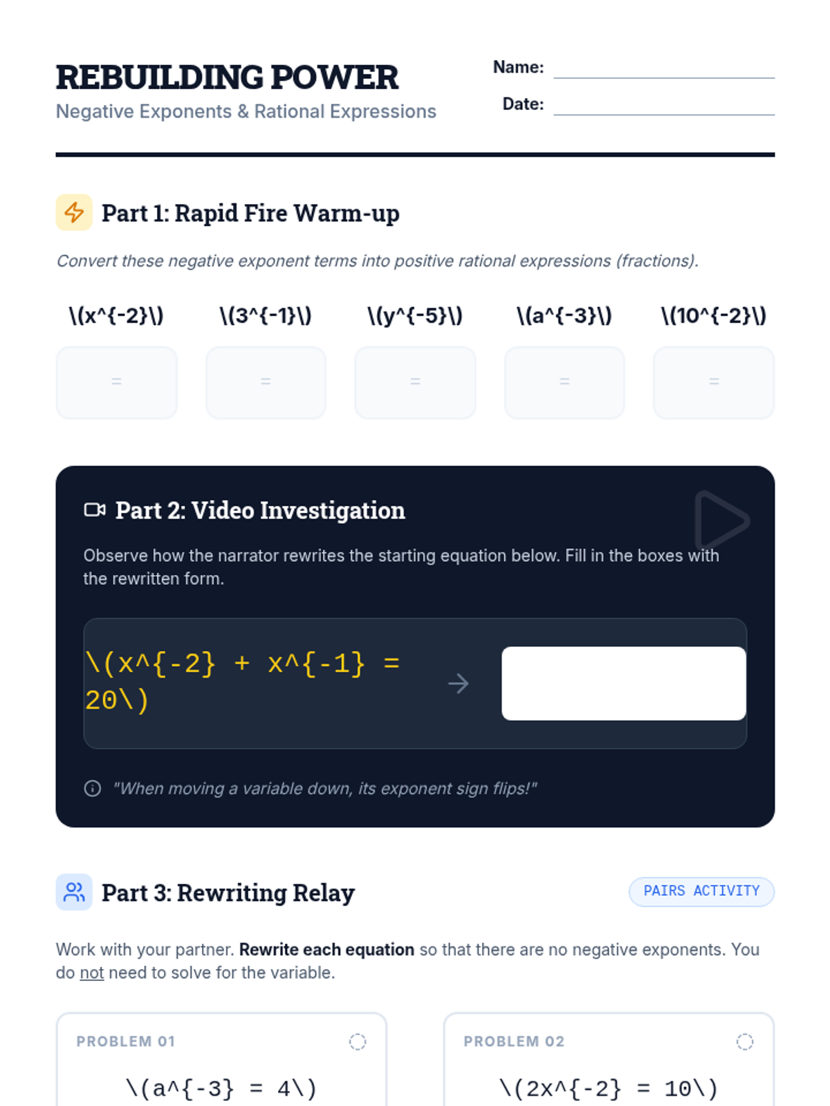 A lesson focused on converting expressions with negative exponents into rational expressions, featuring a video-based demonstration and a collaborative rewriting relay.