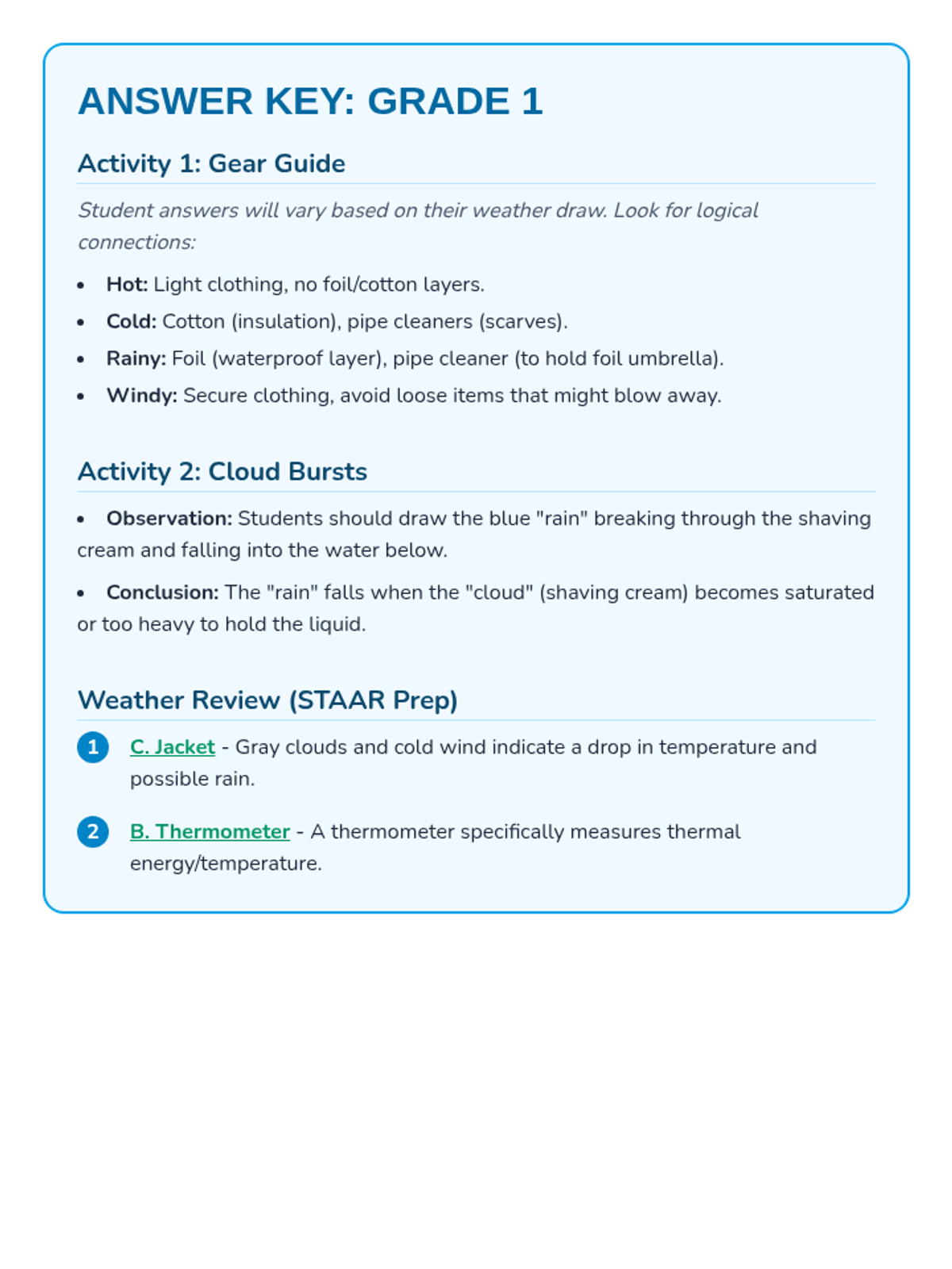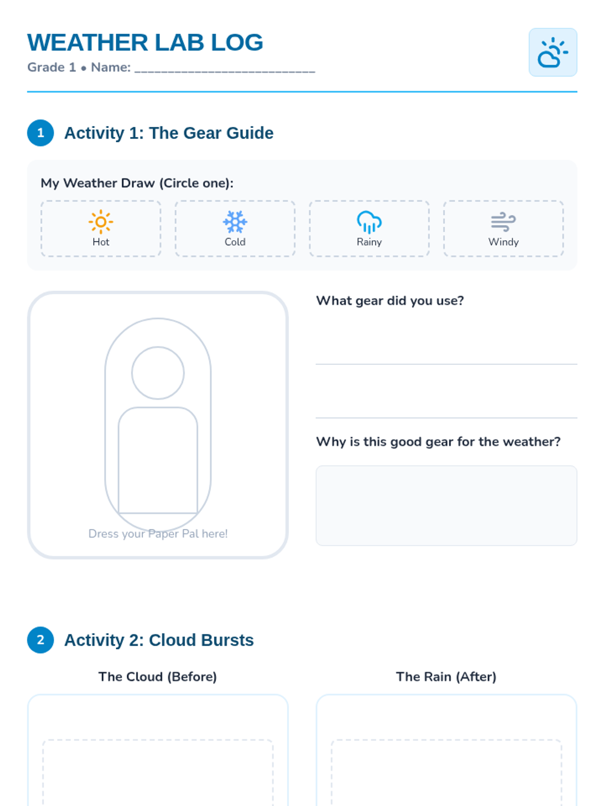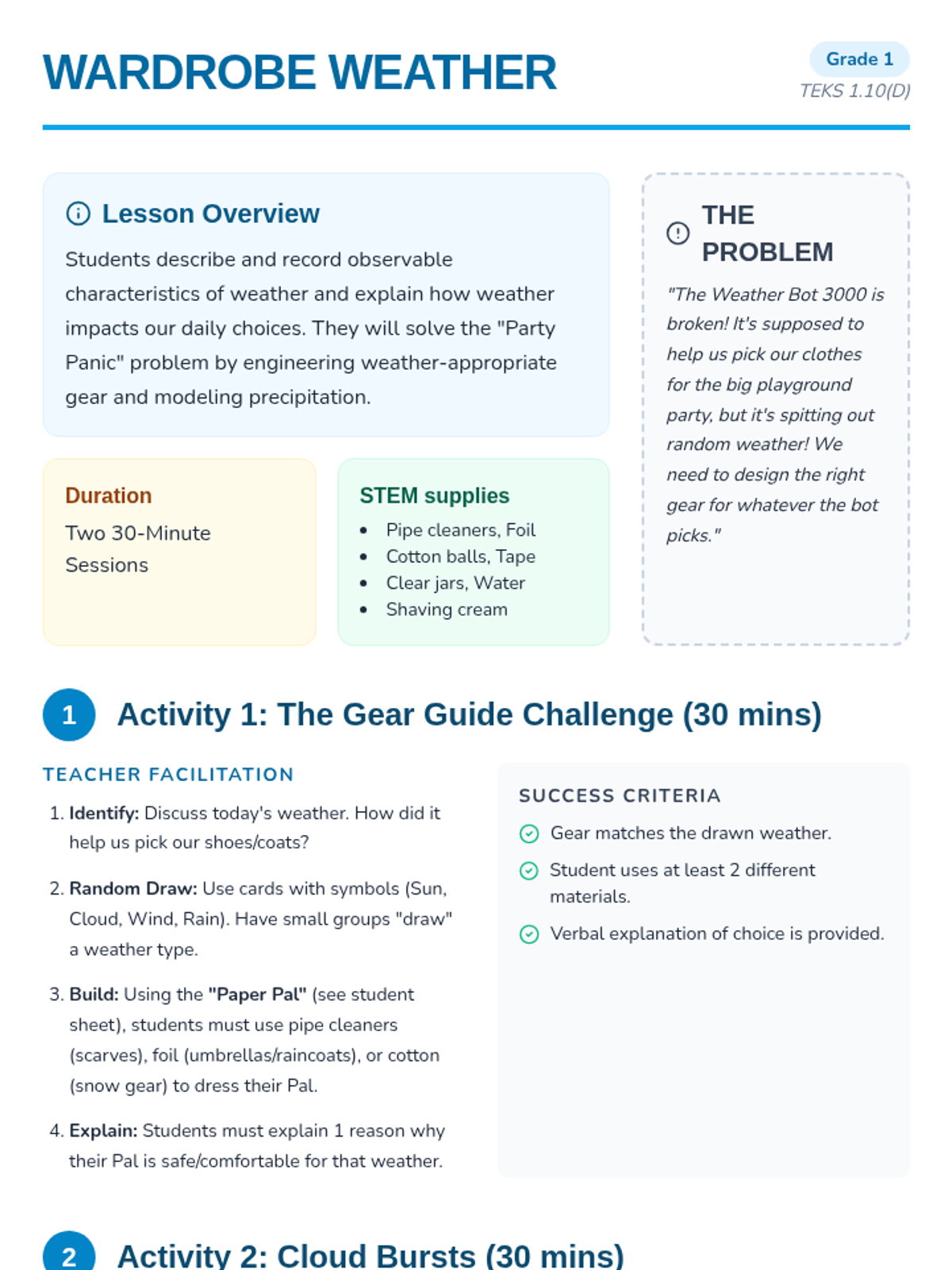 Students in 1st grade will explore observable weather characteristics and how they impact daily choices through an engineering outfit challenge and a rain model.