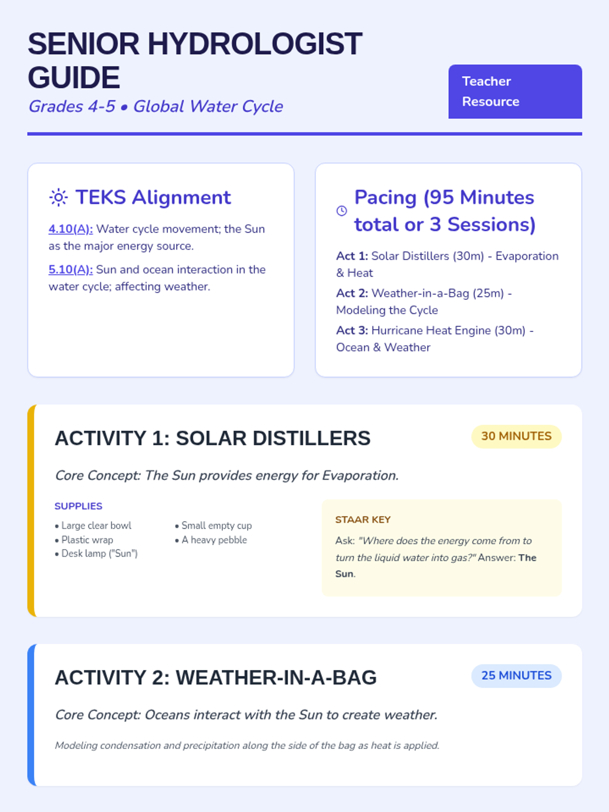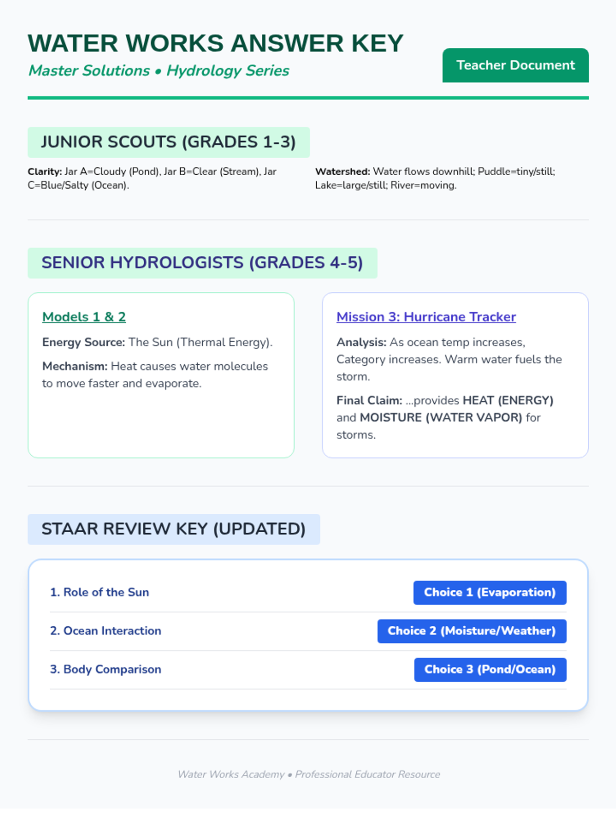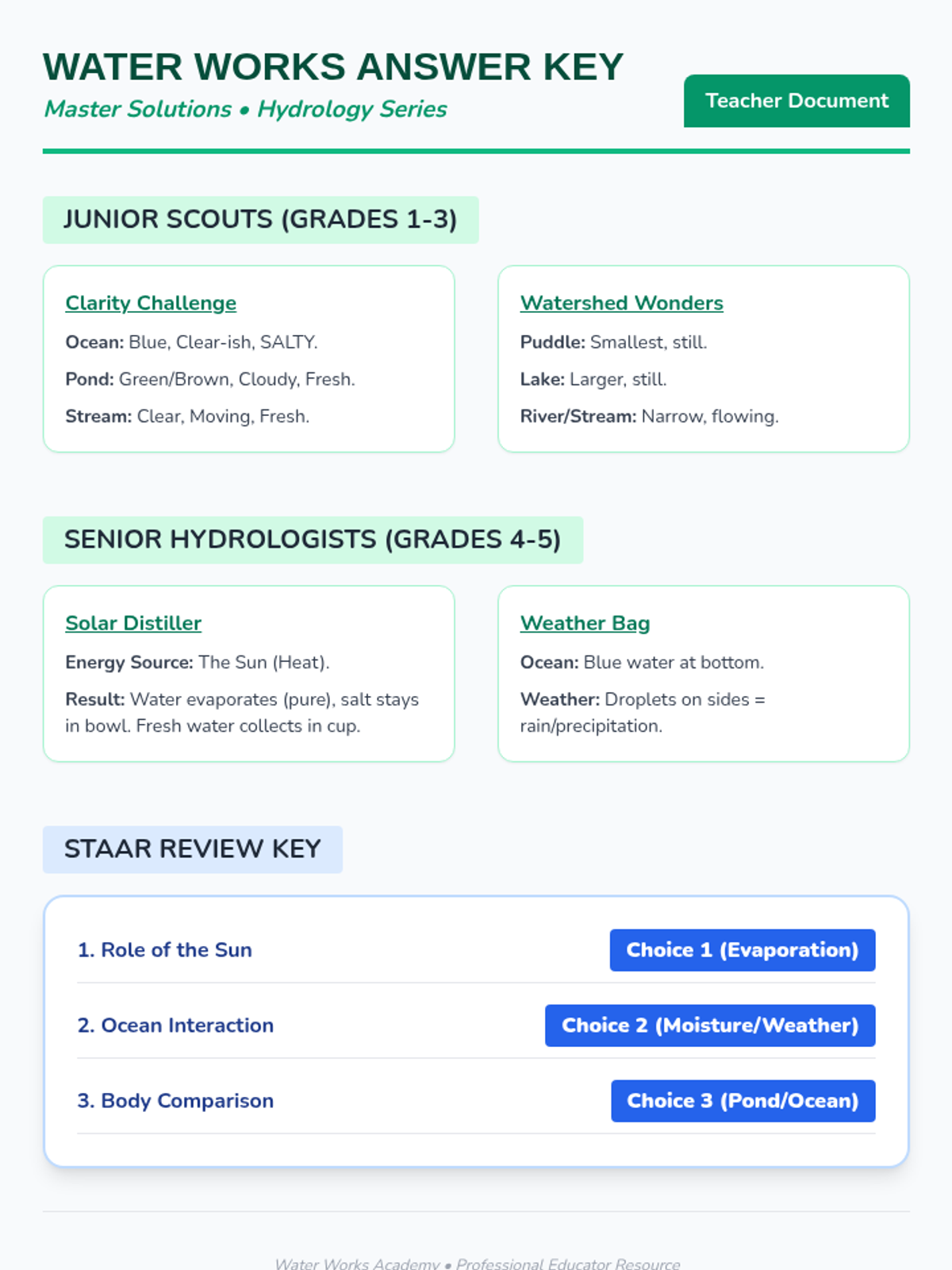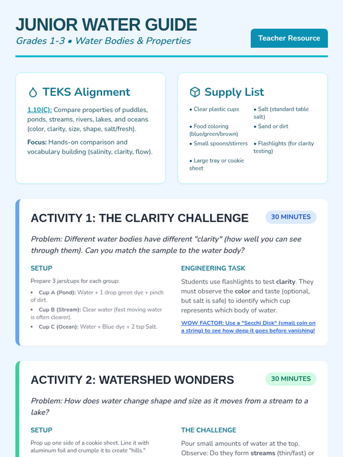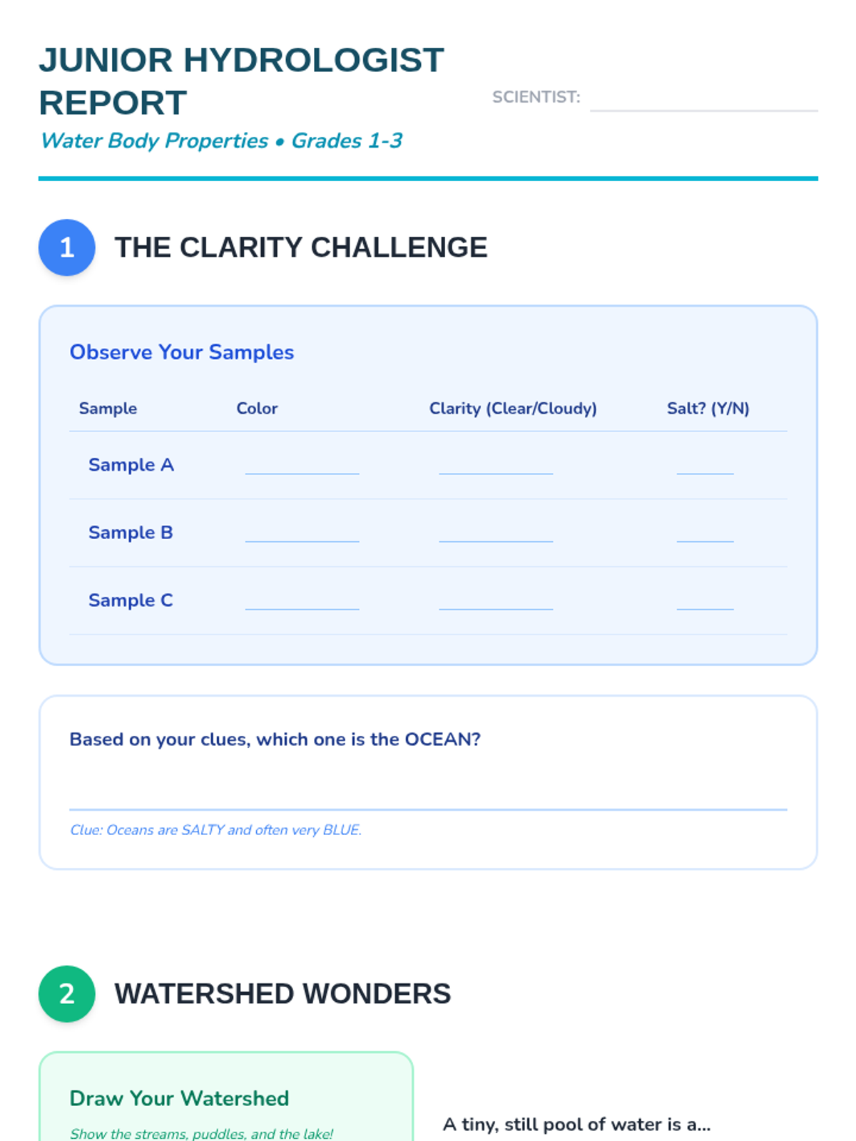 Junior scientists explore the diversity of Earth's water bodies, comparing ponds to oceans and investigating how water moves. Includes hands-on models of salinity and clarity.