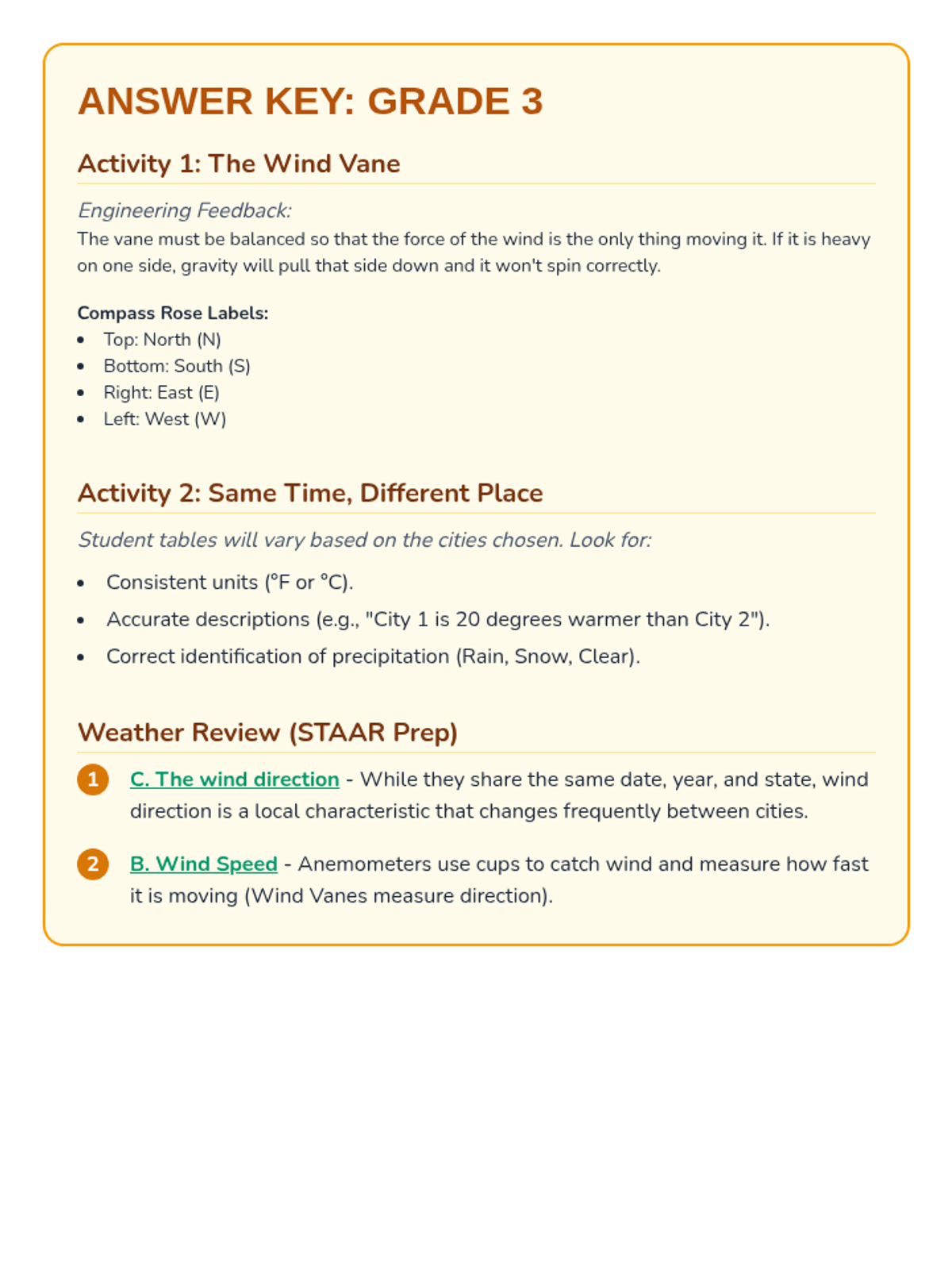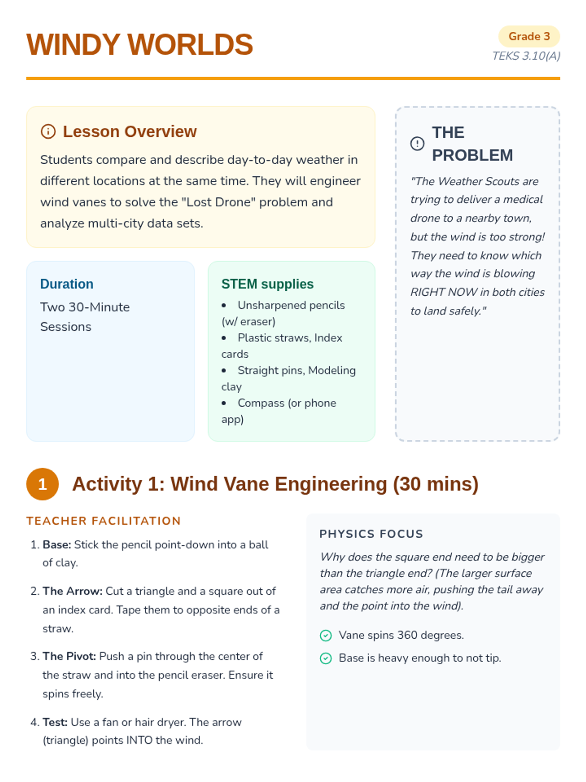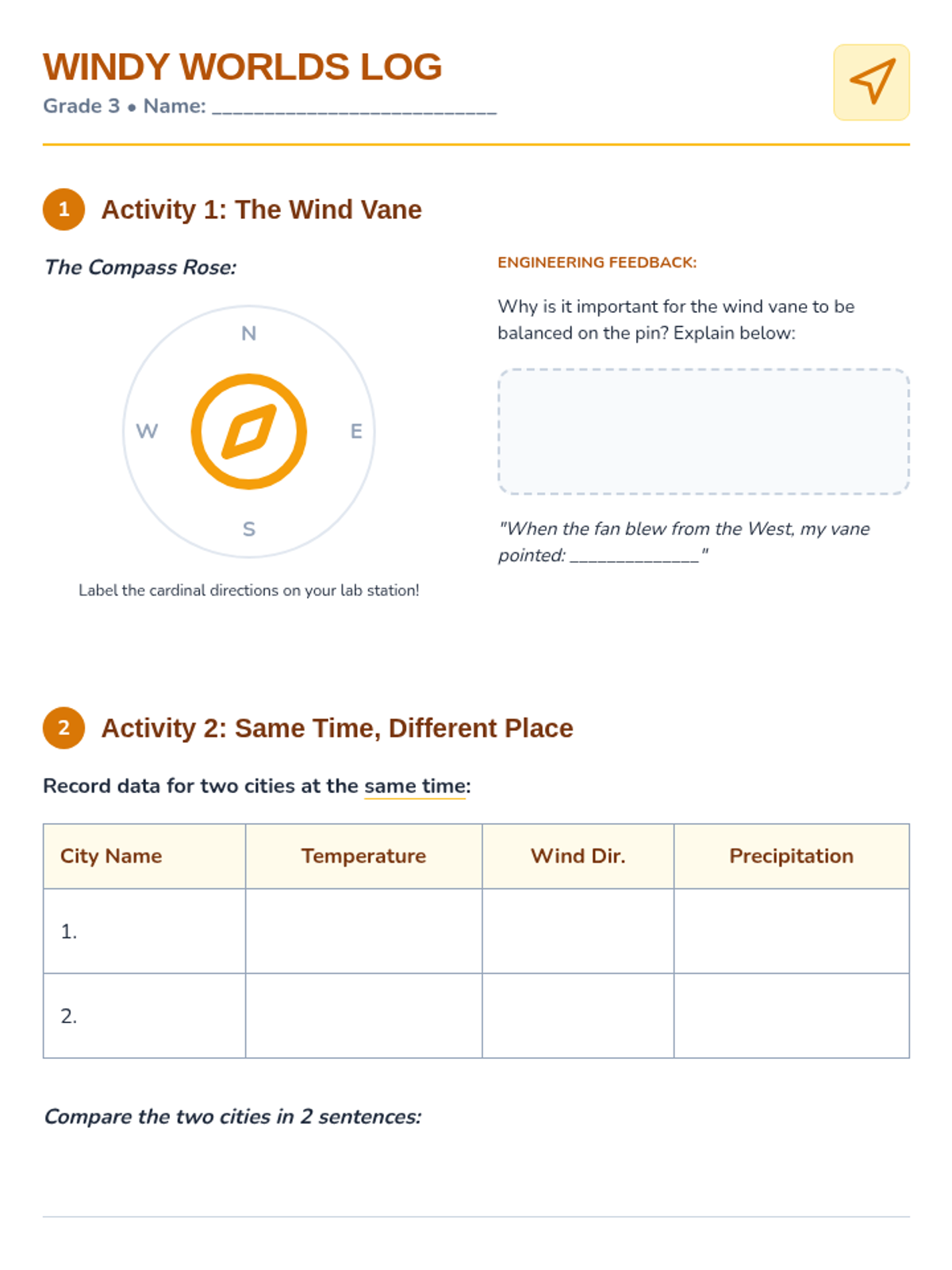 Students in 3rd grade will engineer tools to measure wind direction and compare weather data across different locations simultaneously.