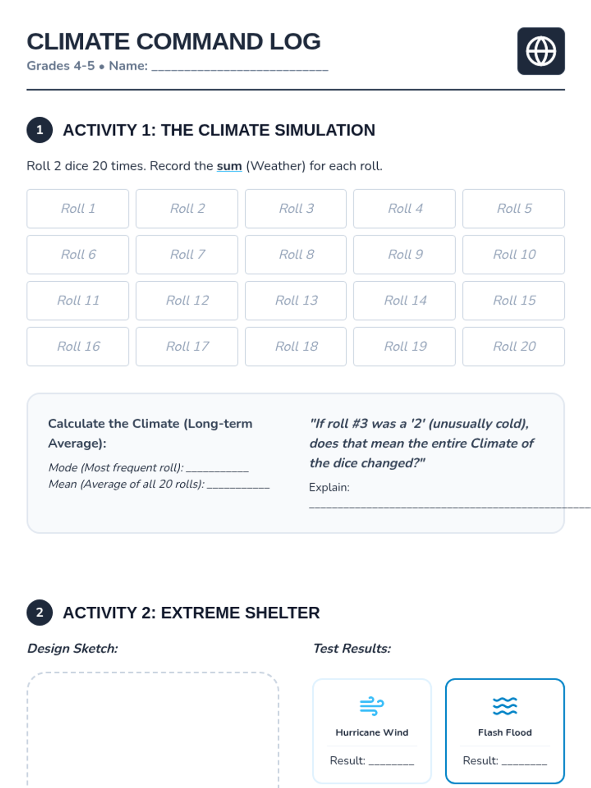 Upper elementary students will master the difference between weather and climate through a statistical dice simulation and a severe weather engineering challenge.