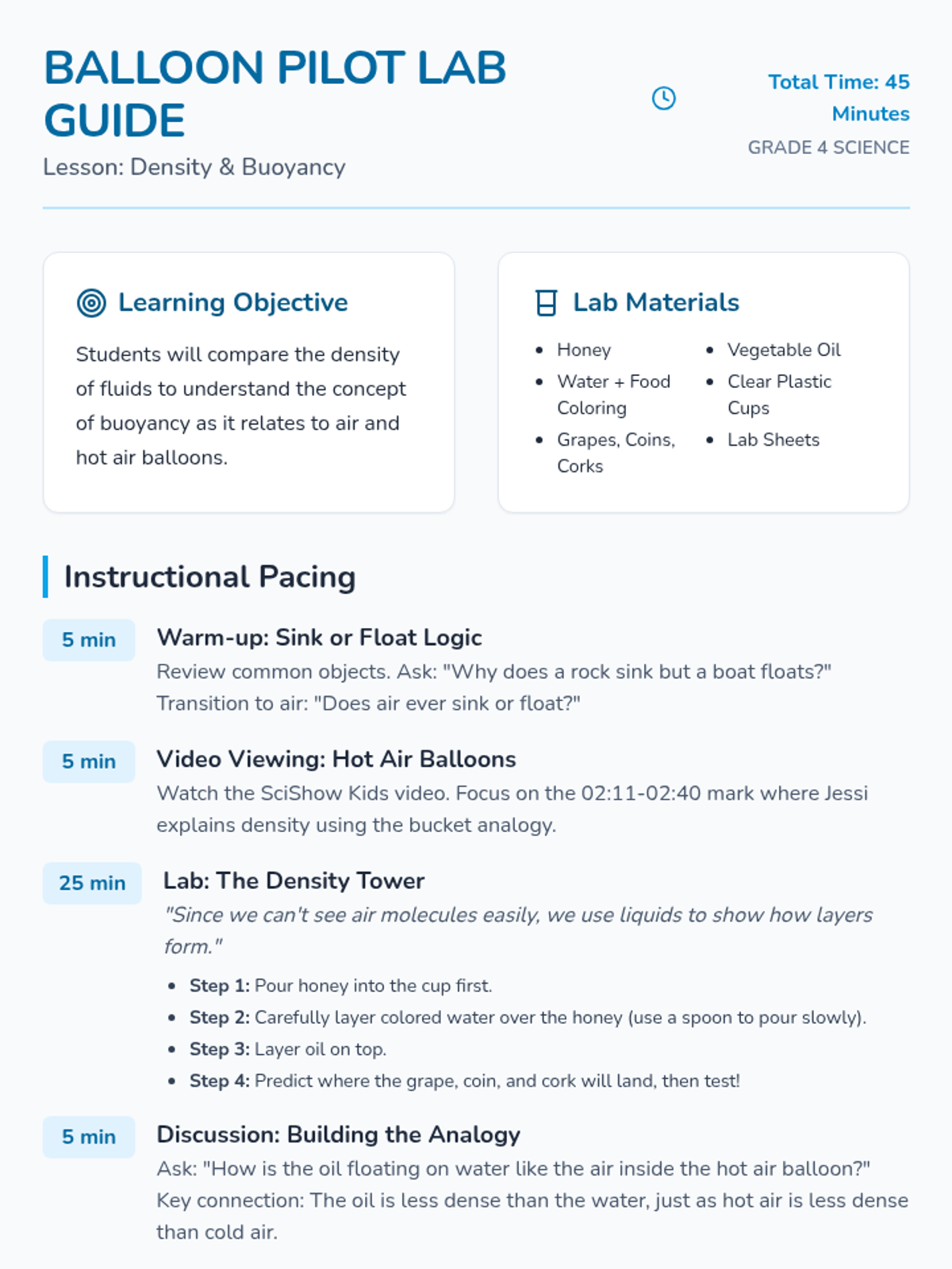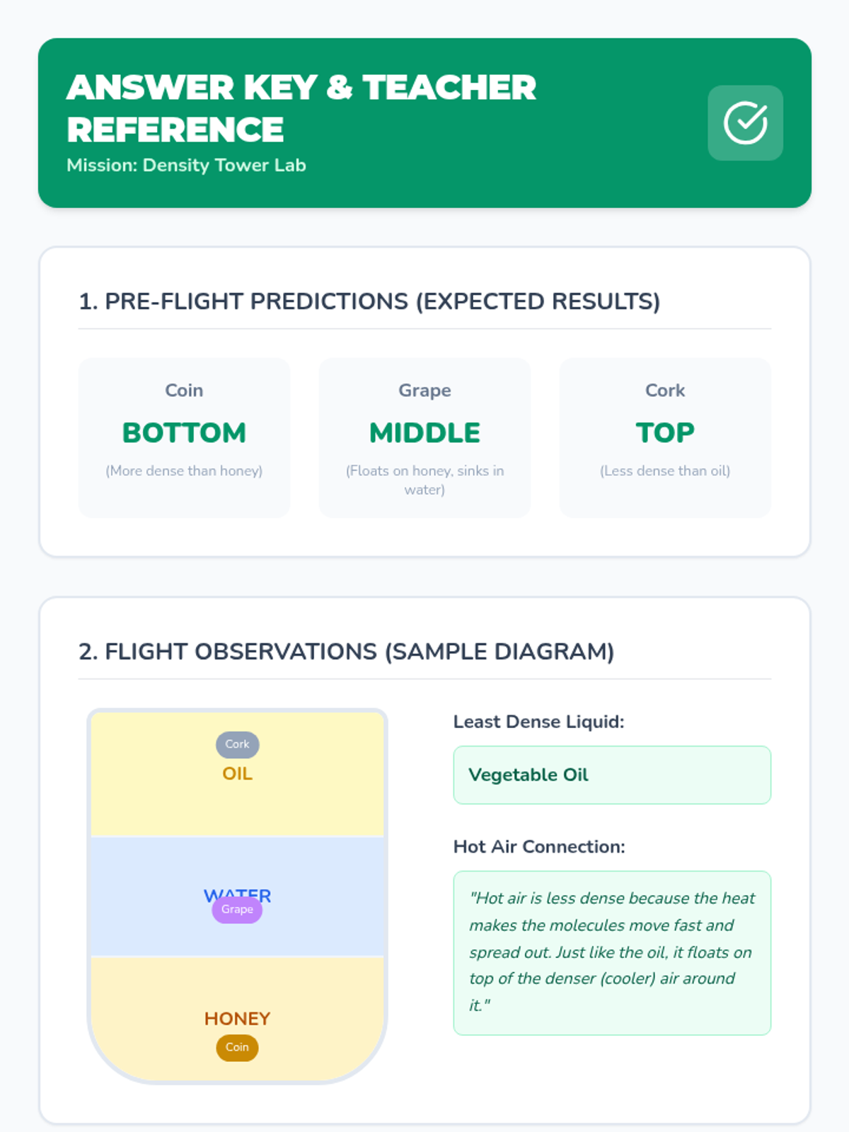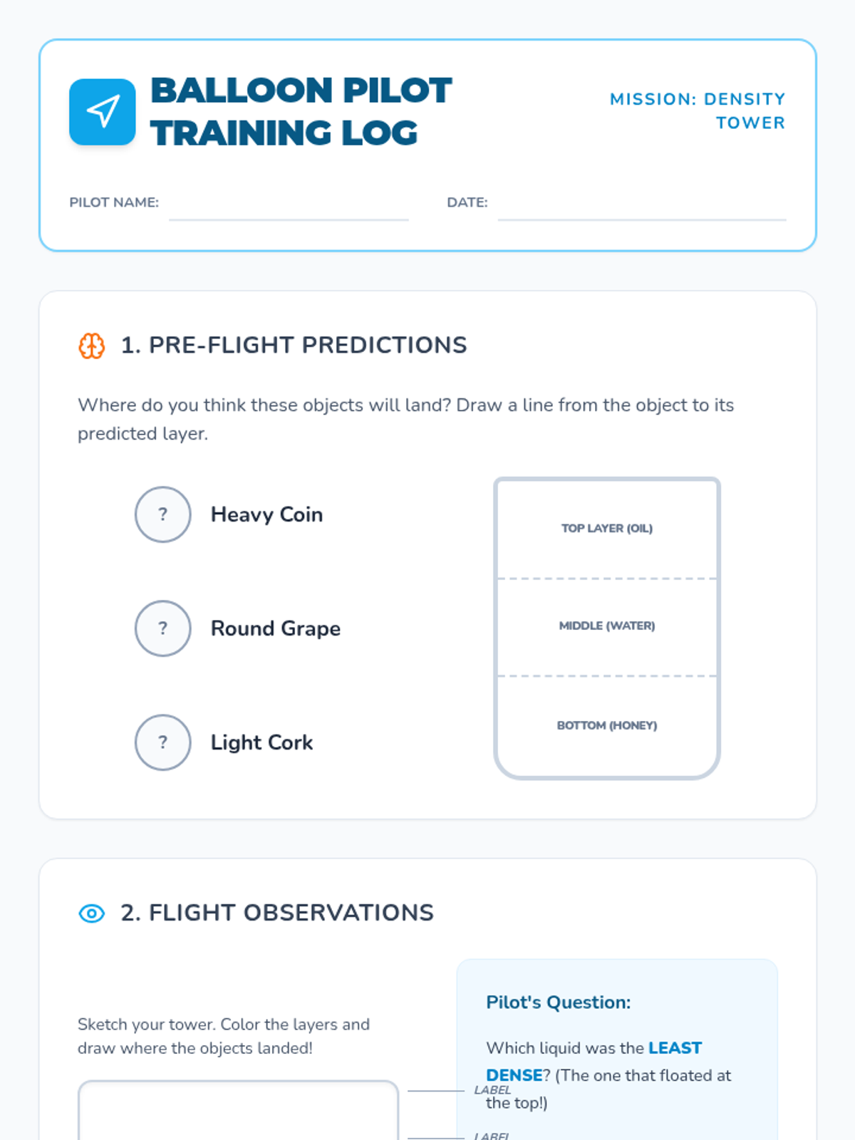 Students explore the science of density and buoyancy through a 'Density Tower' lab, connecting the behavior of liquids to how hot air balloons fly.