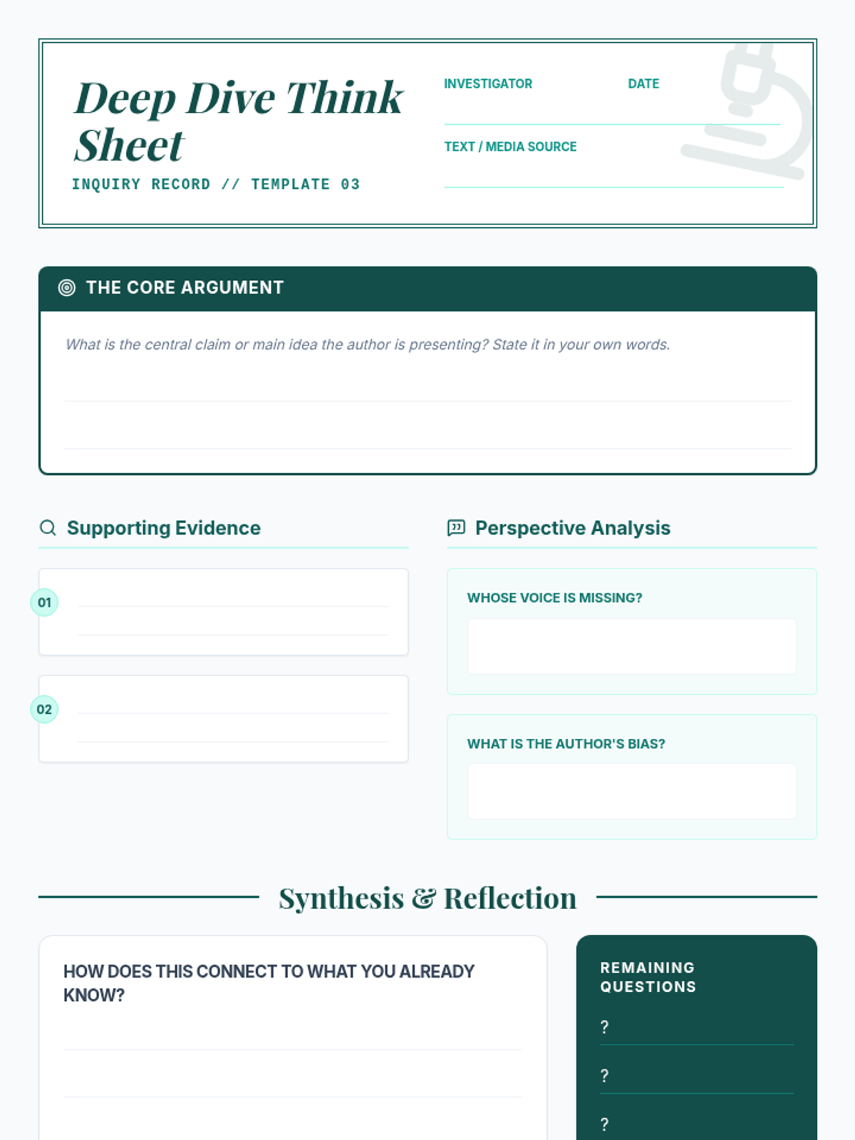 This lesson provides three distinct templates to help students process digital content. It includes a concept mapping tool for visual learners, a structured lab report outline for scientific inquiry, and a critical thinking think sheet for deep reading analysis.