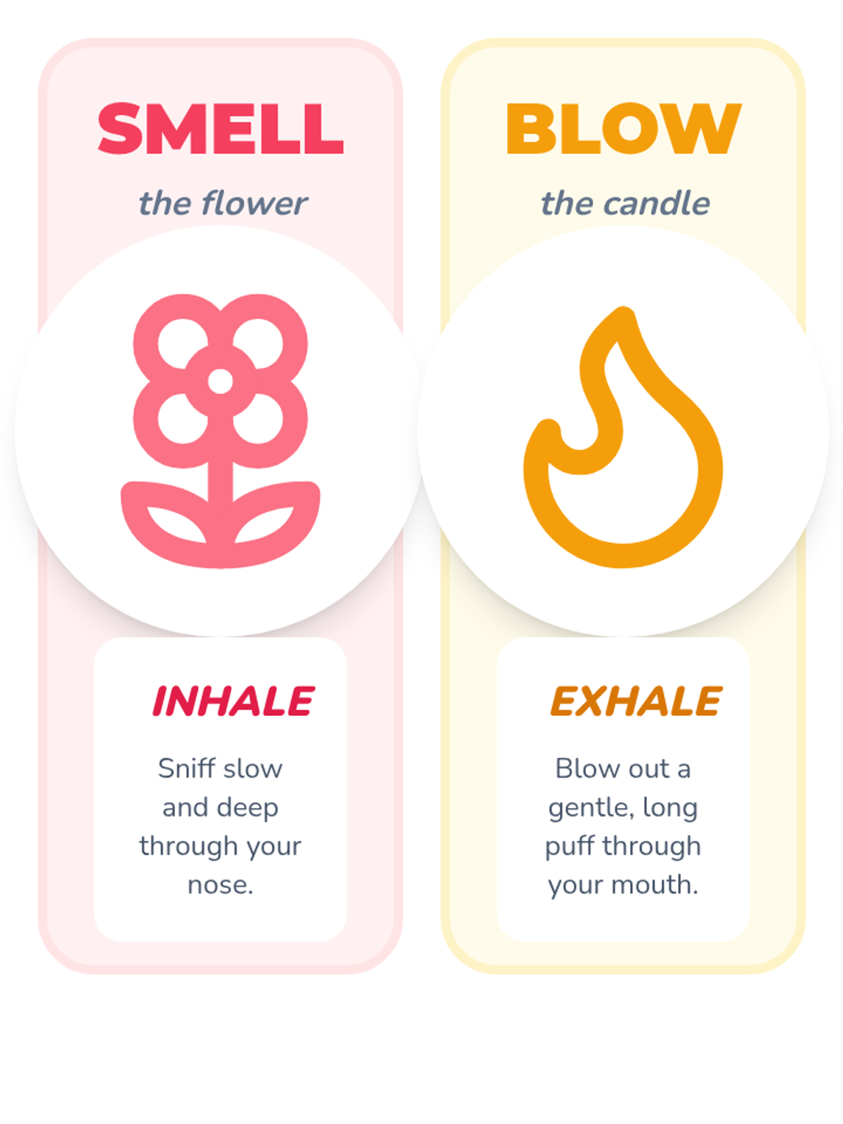 Students learn the 'smell the flower, blow the candle' technique to master controlled inhalation and exhalation.