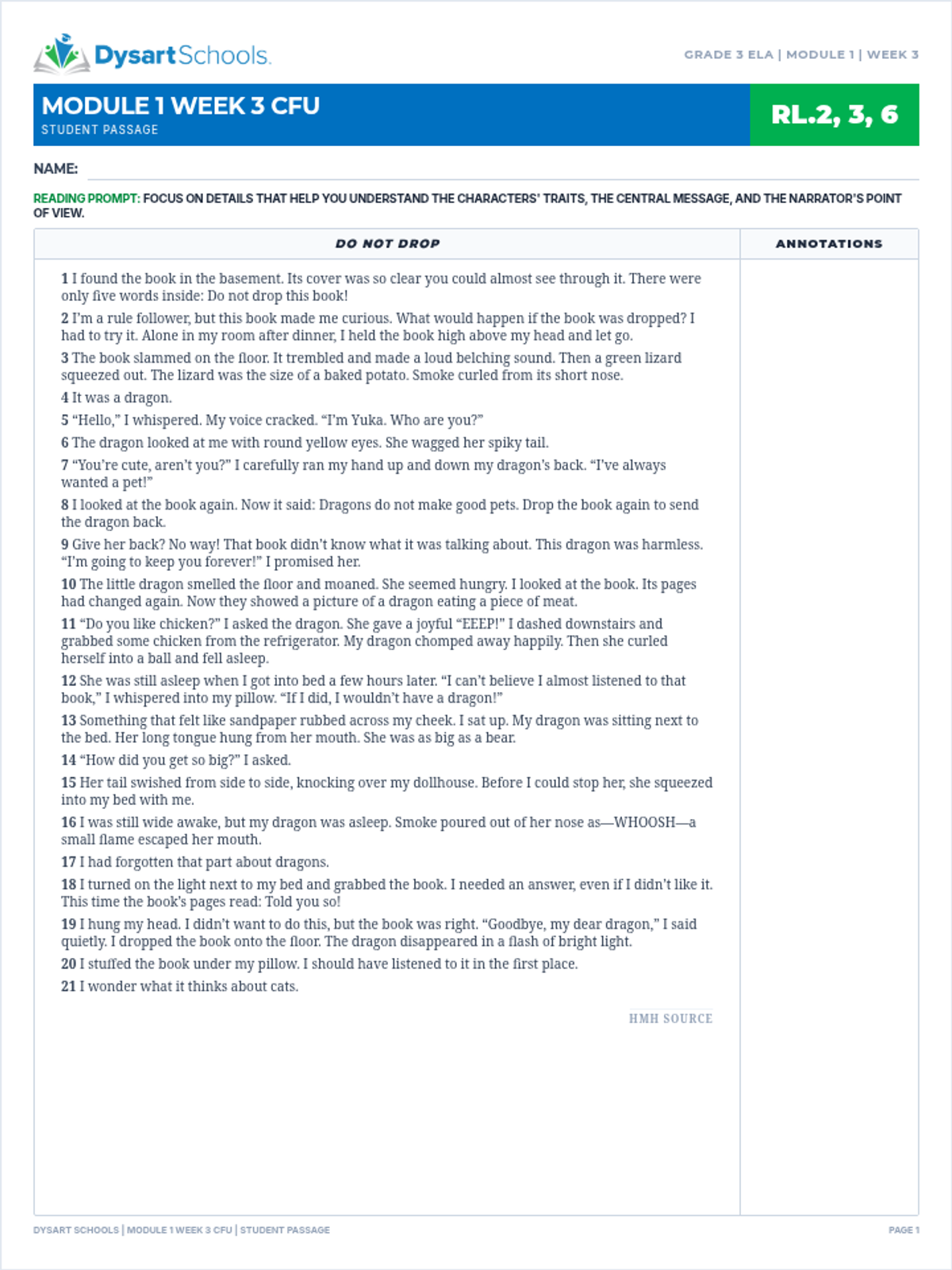 A lesson focused on analyzing character traits, determining central messages, and distinguishing points of view using the story 'A Little Help'. Students practice applying RL.2, RL.3, and RL.6 standards through standards-aligned multiple-choice questions.