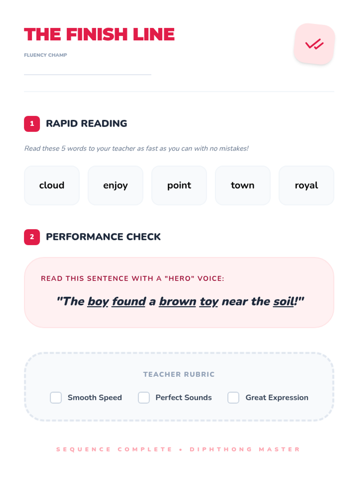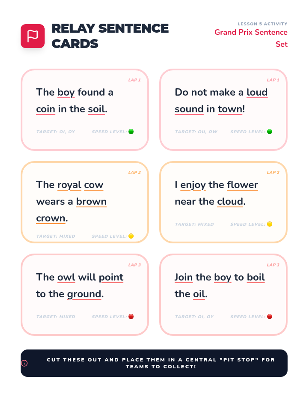 A culminating relay race activity where students demonstrate reading fluency, prosody, and speed with sentences containing all target diphthongs.