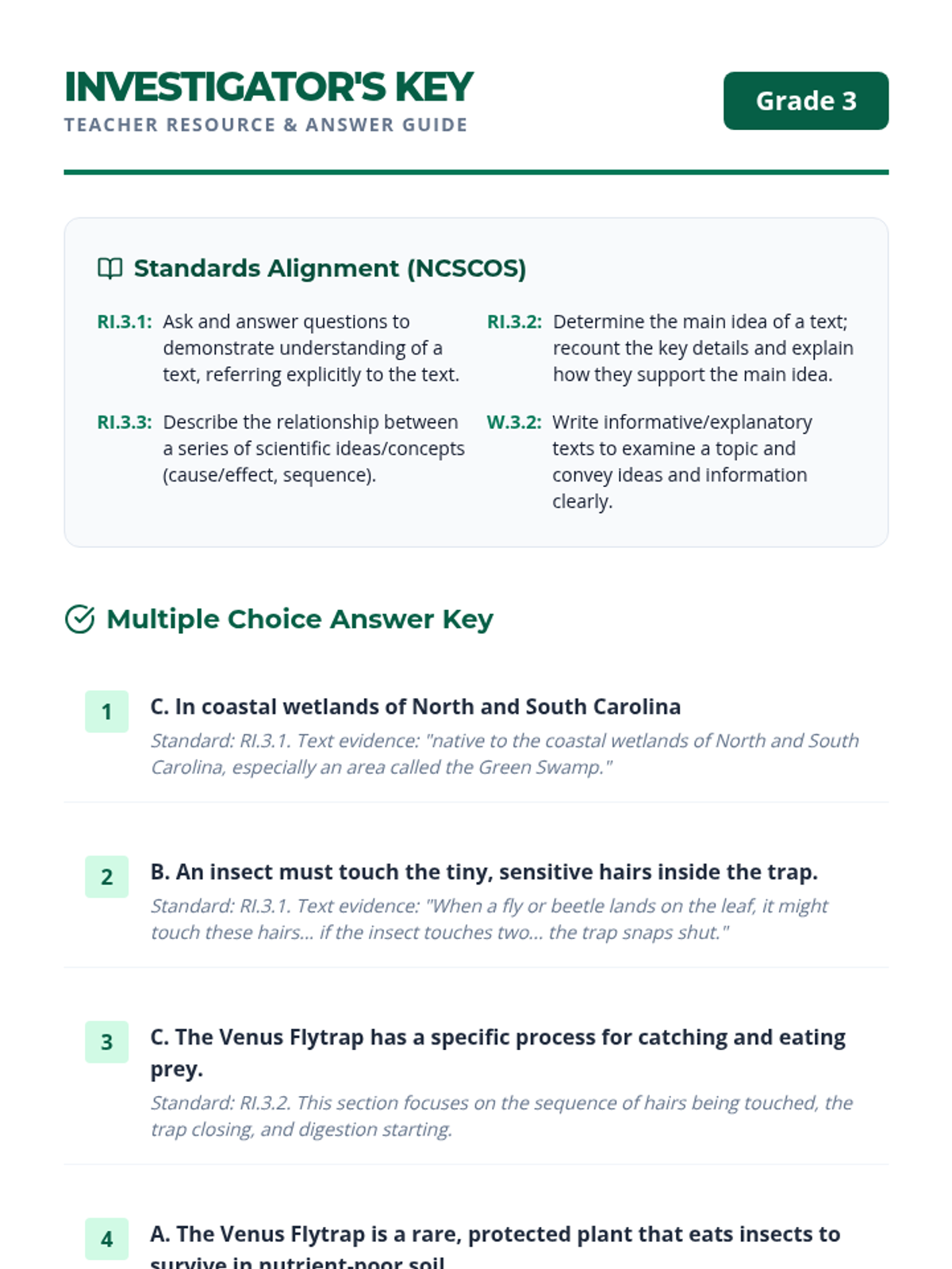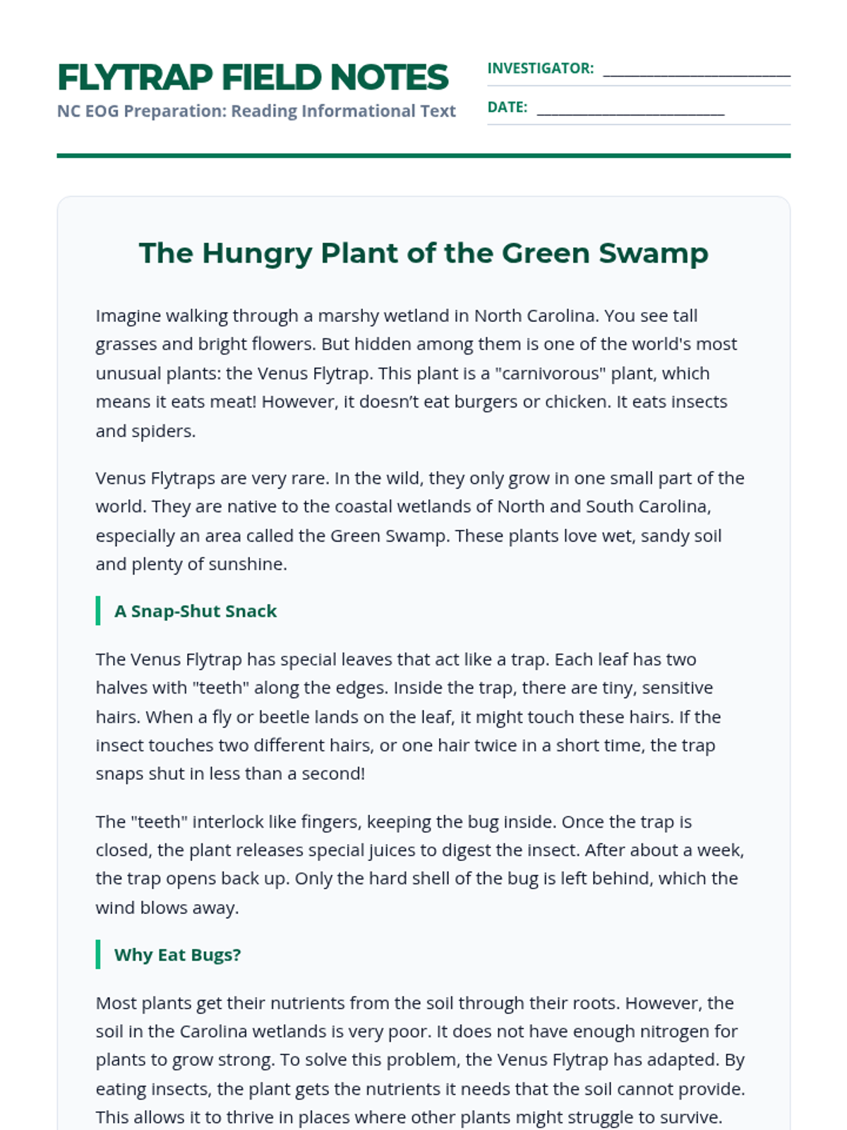 A comprehensive ELA lesson focused on North Carolina Standard Course of Study (NCSCOS) Reading Informational Text standards for 3rd grade. Students will practice asking/answering questions, identifying main ideas, and describing relationships within a text about the native Venus Flytrap.