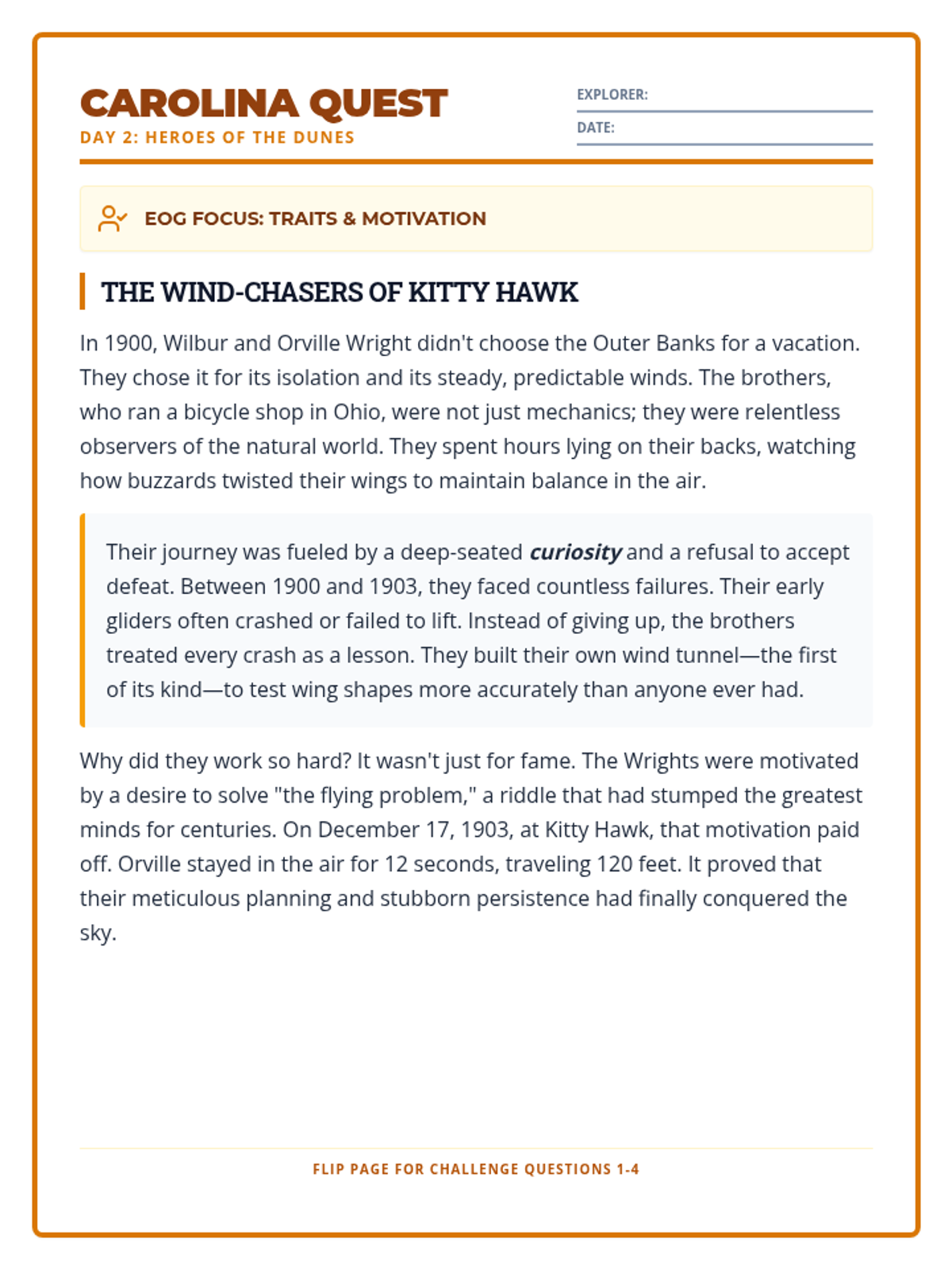 An analysis of the Wright Brothers' historical journey to Kitty Hawk, focusing on identifying character traits and motivations in an informational context.