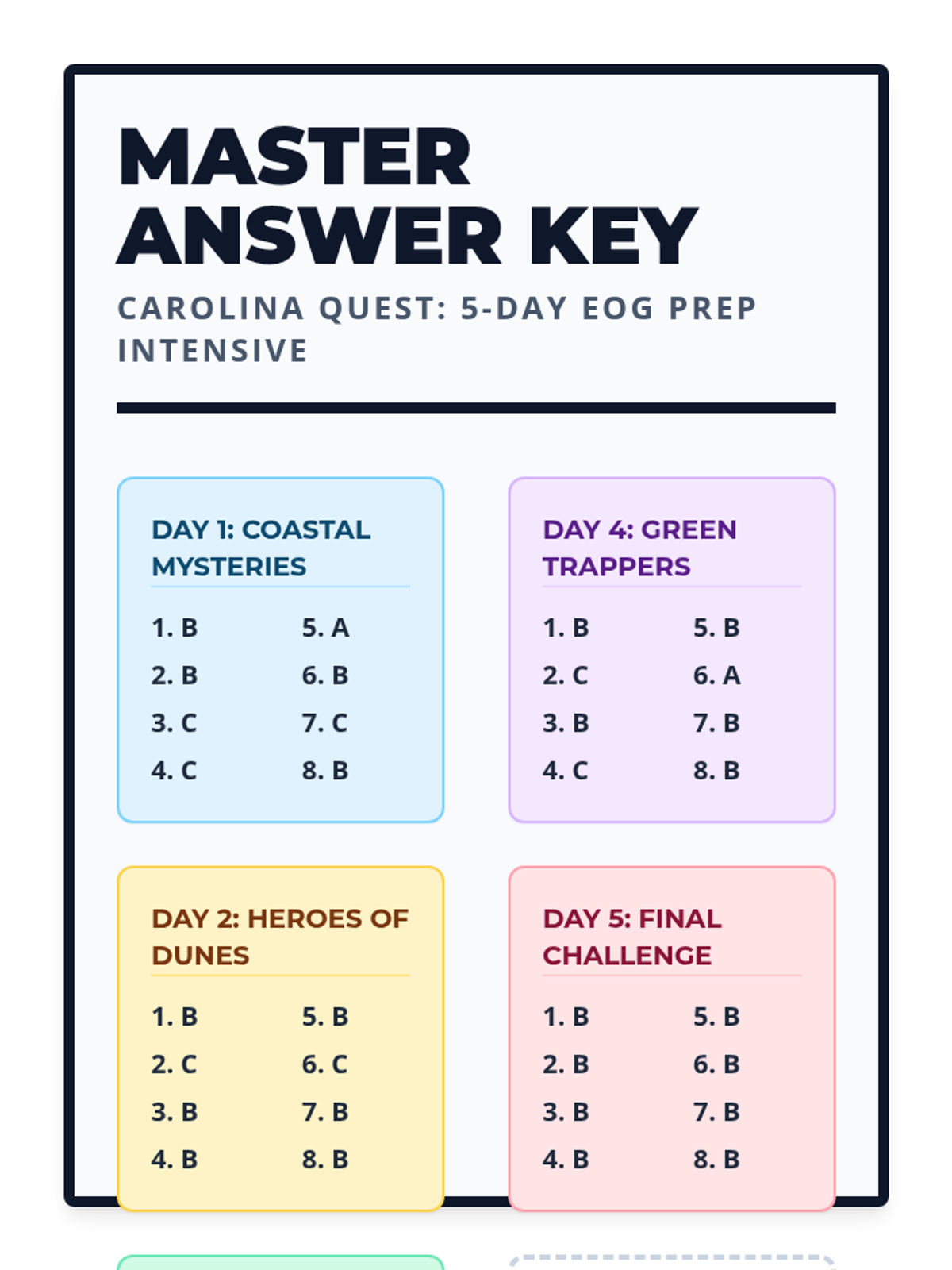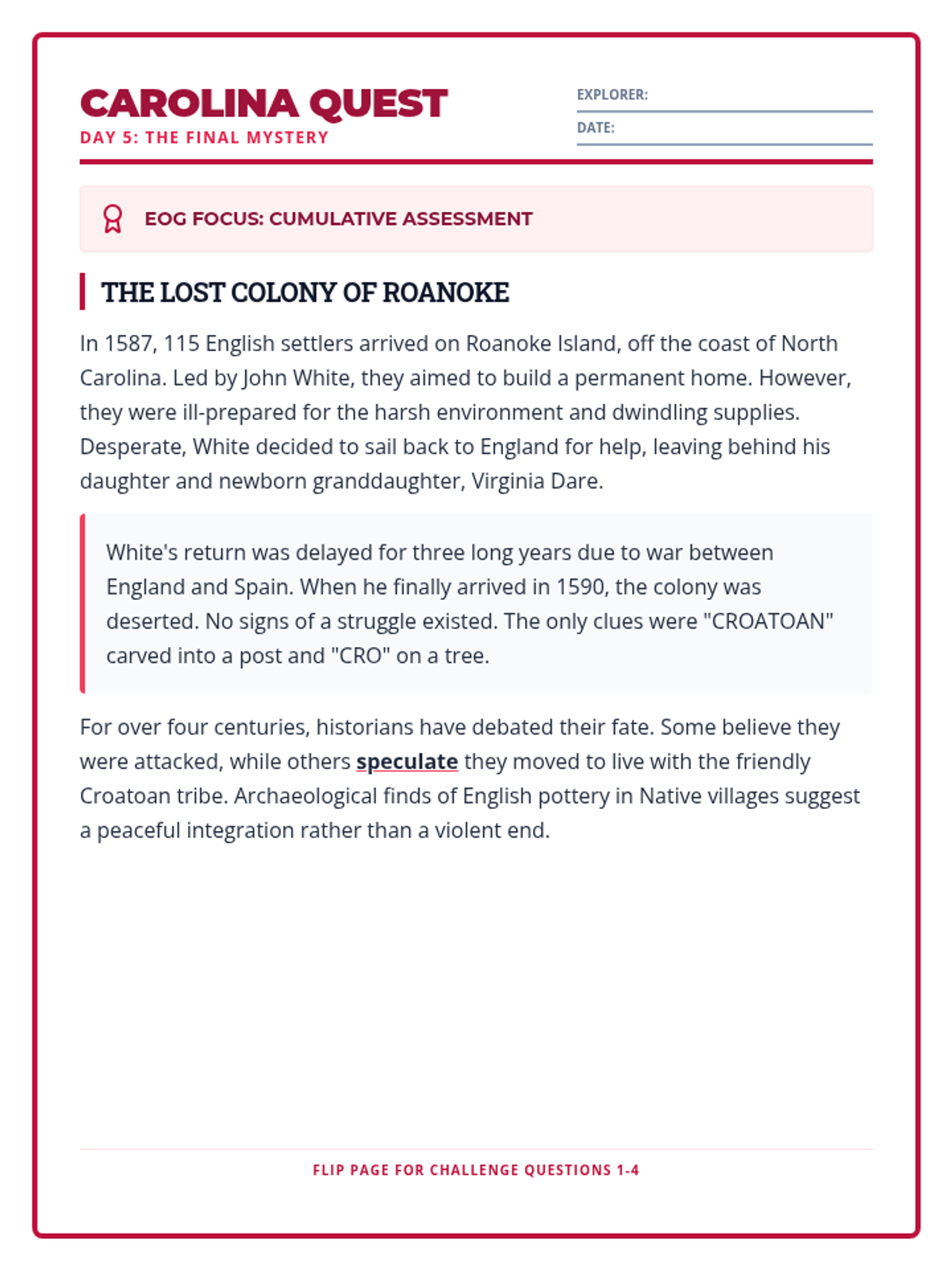 A cumulative EOG-style practice assessment centered on the mystery of the Lost Colony of Roanoke, testing all targeted reading skills.
