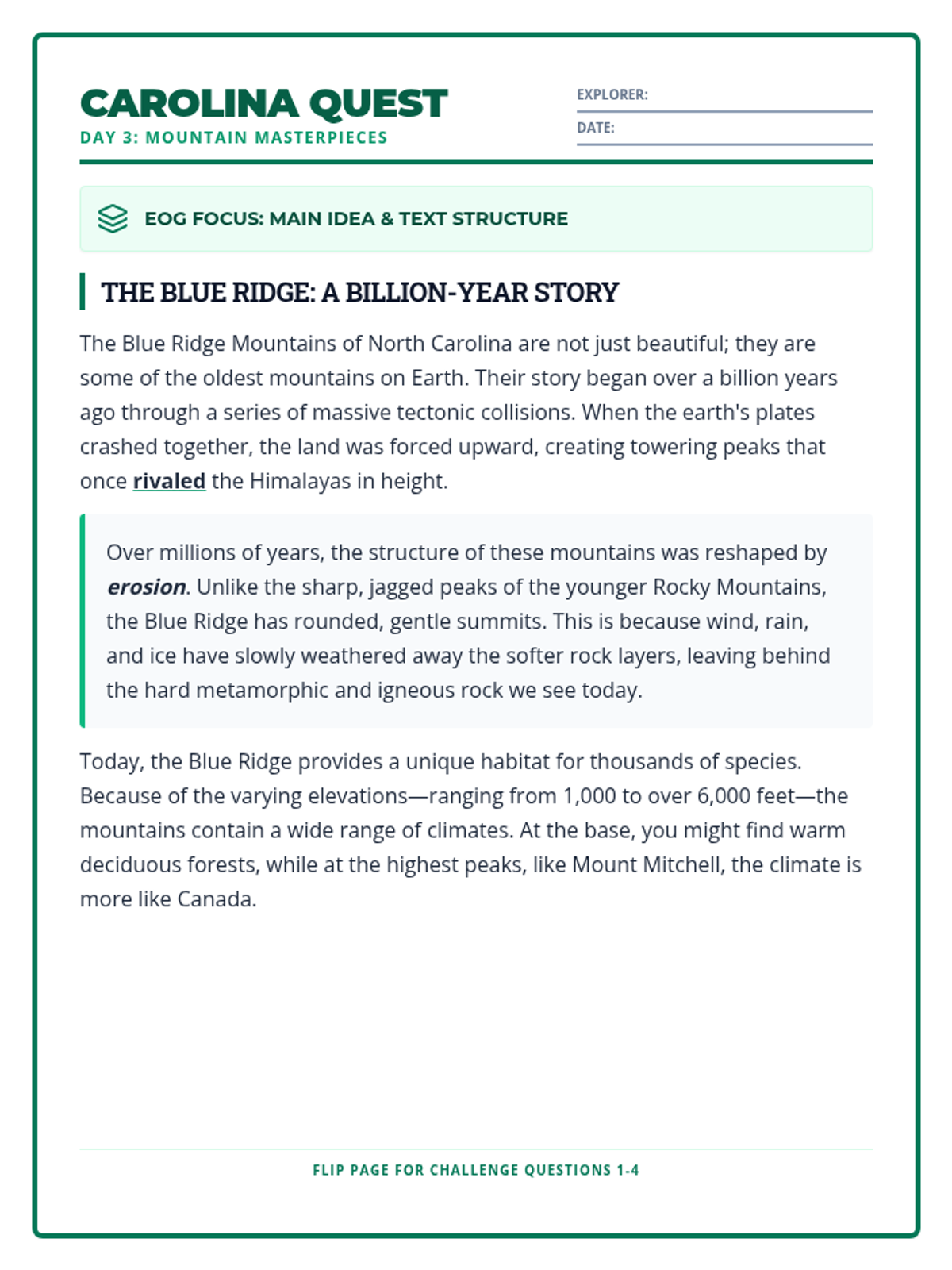 Students examine the formation of the Blue Ridge Mountains to identify main ideas and analyze how the text is structured to convey geological history.