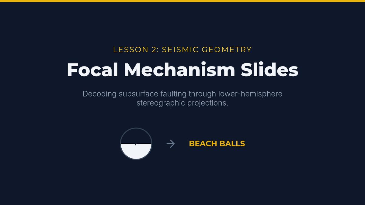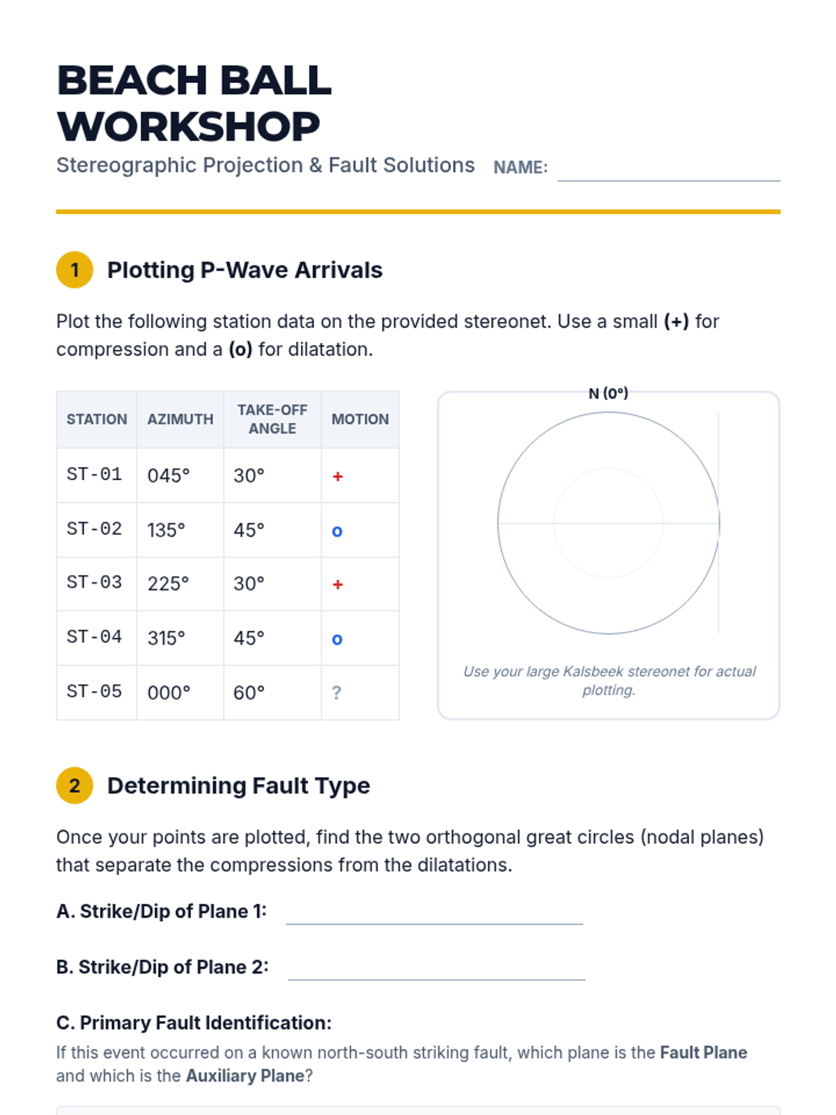A technical workshop on lower-hemisphere stereographic projections. Students learn to interpret P-wave first motions to construct 'beach ball' diagrams and determine the geometry of subsurface faulting.