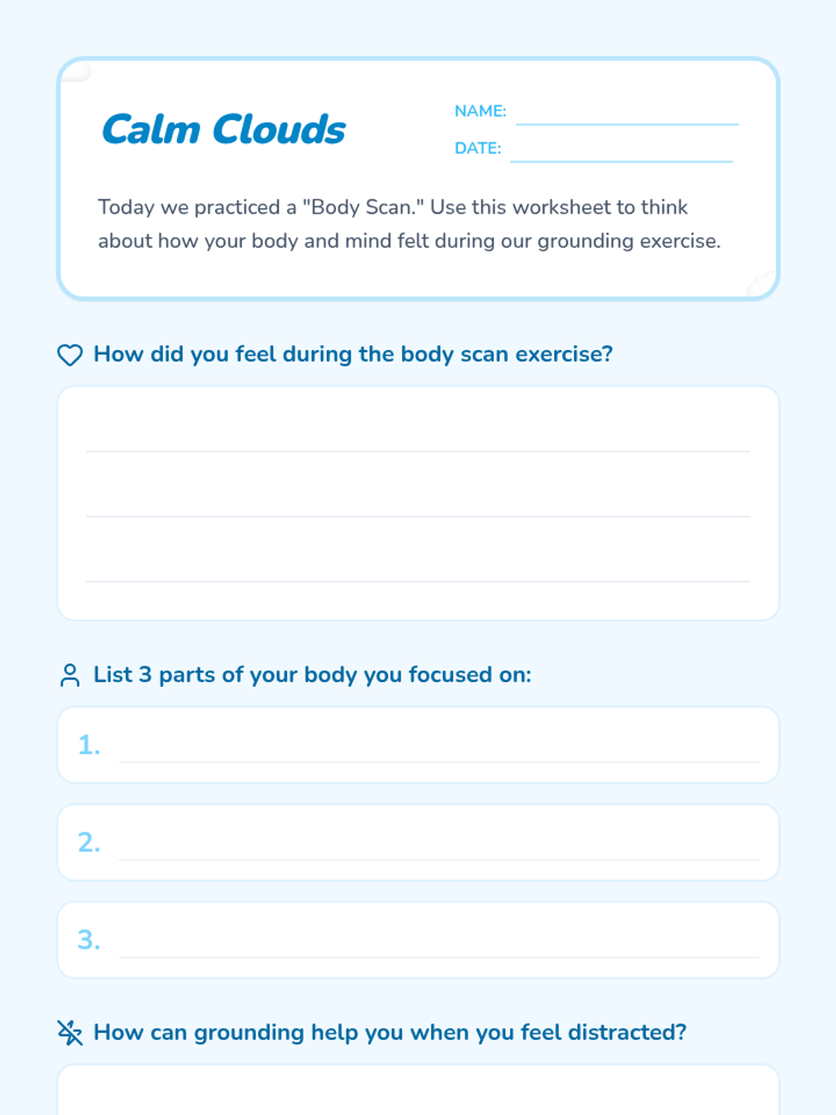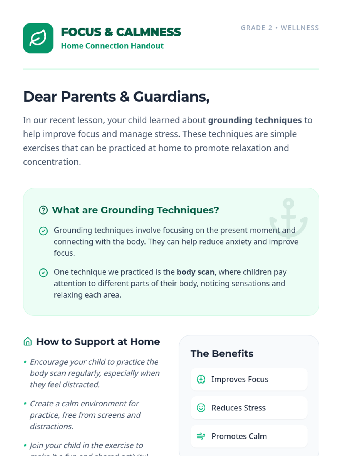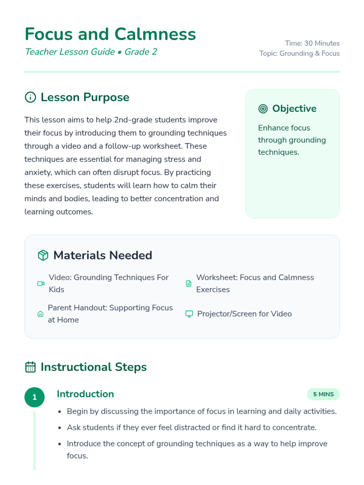 A lesson for 2nd graders to learn grounding techniques like the body scan to improve focus and manage stress. Students will watch a video, engage in discussion, and complete a reflective worksheet.