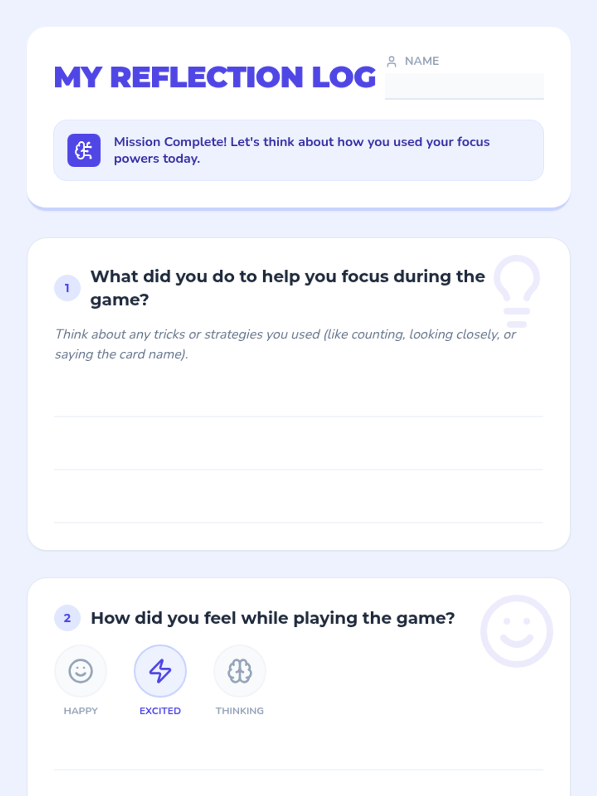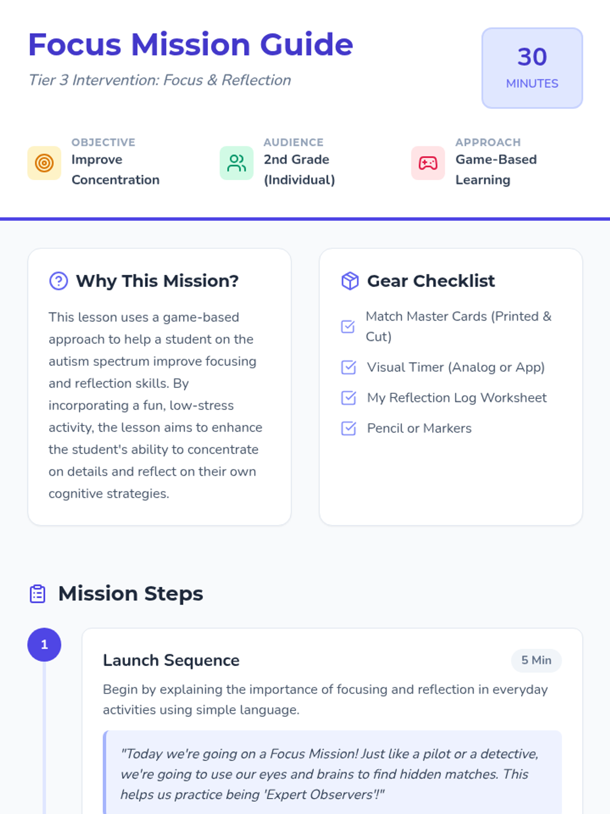 A game-based Tier 3 lesson designed for a 2nd-grade student to improve concentration and reflection skills through a matching game and guided discussion.