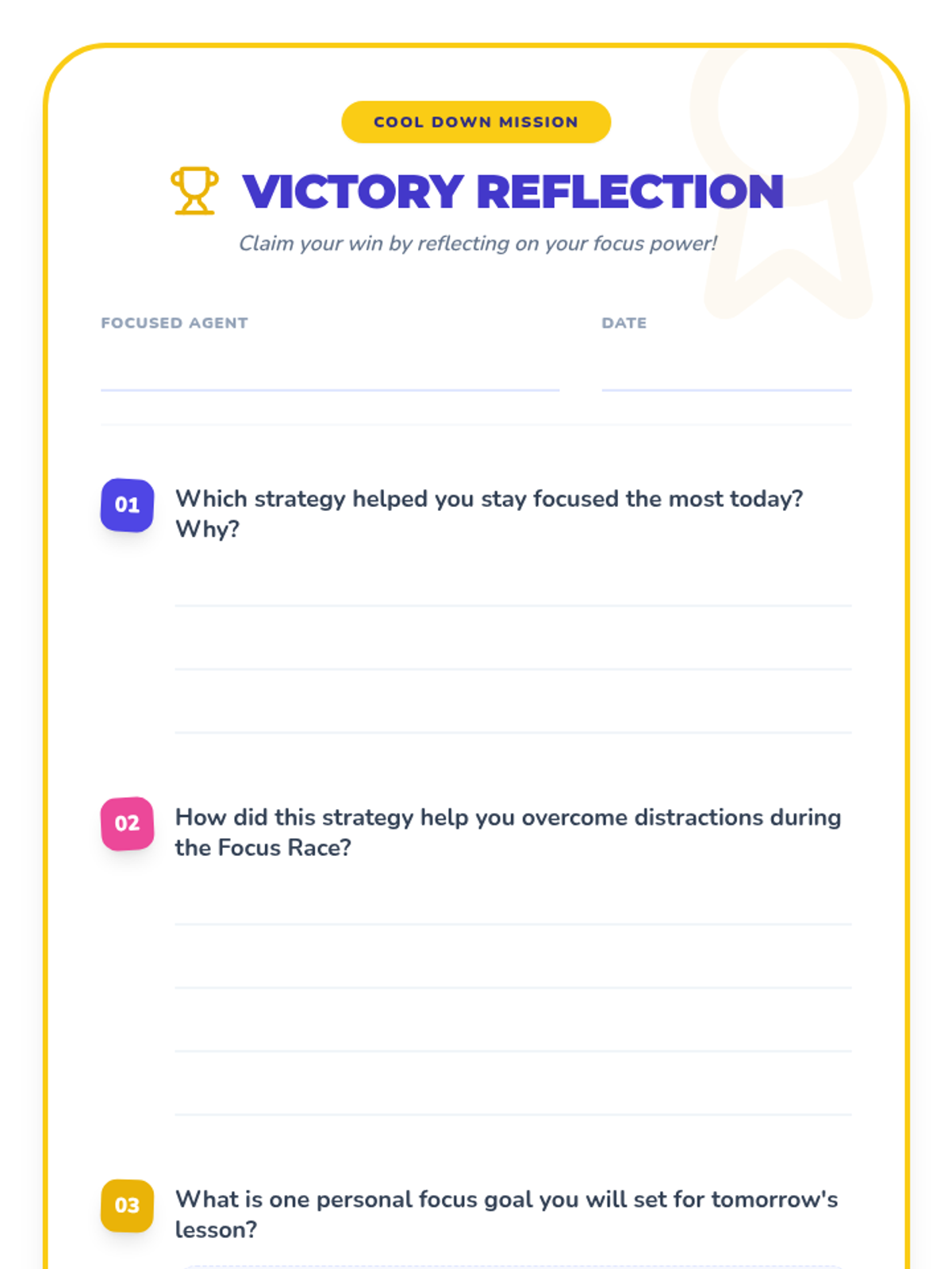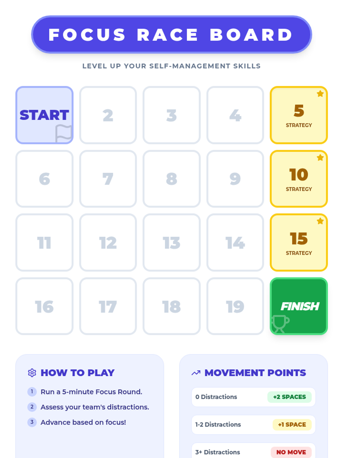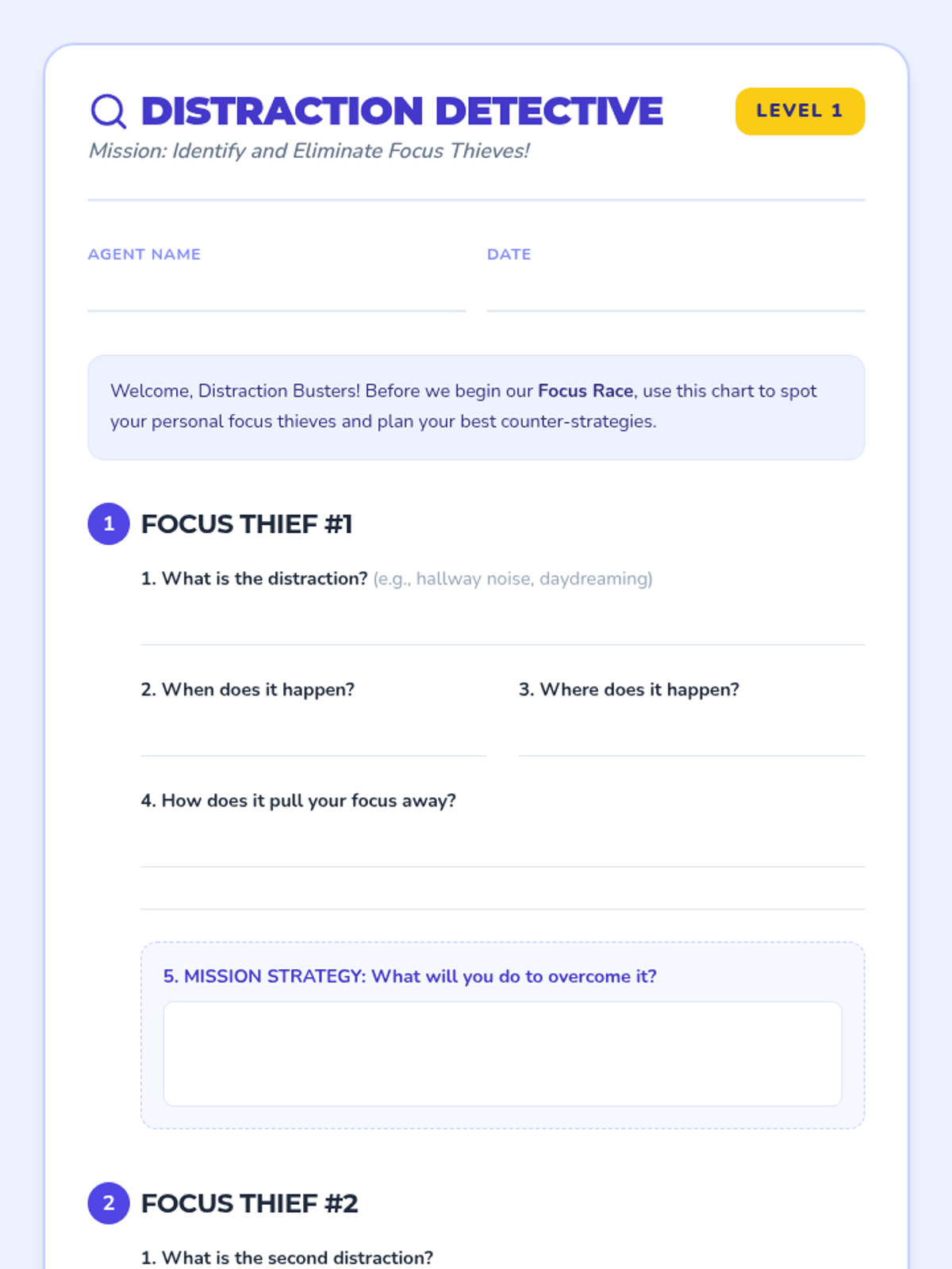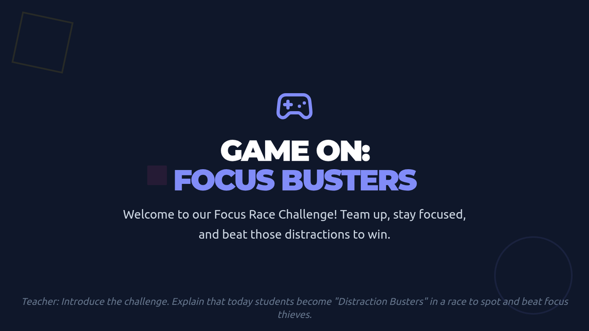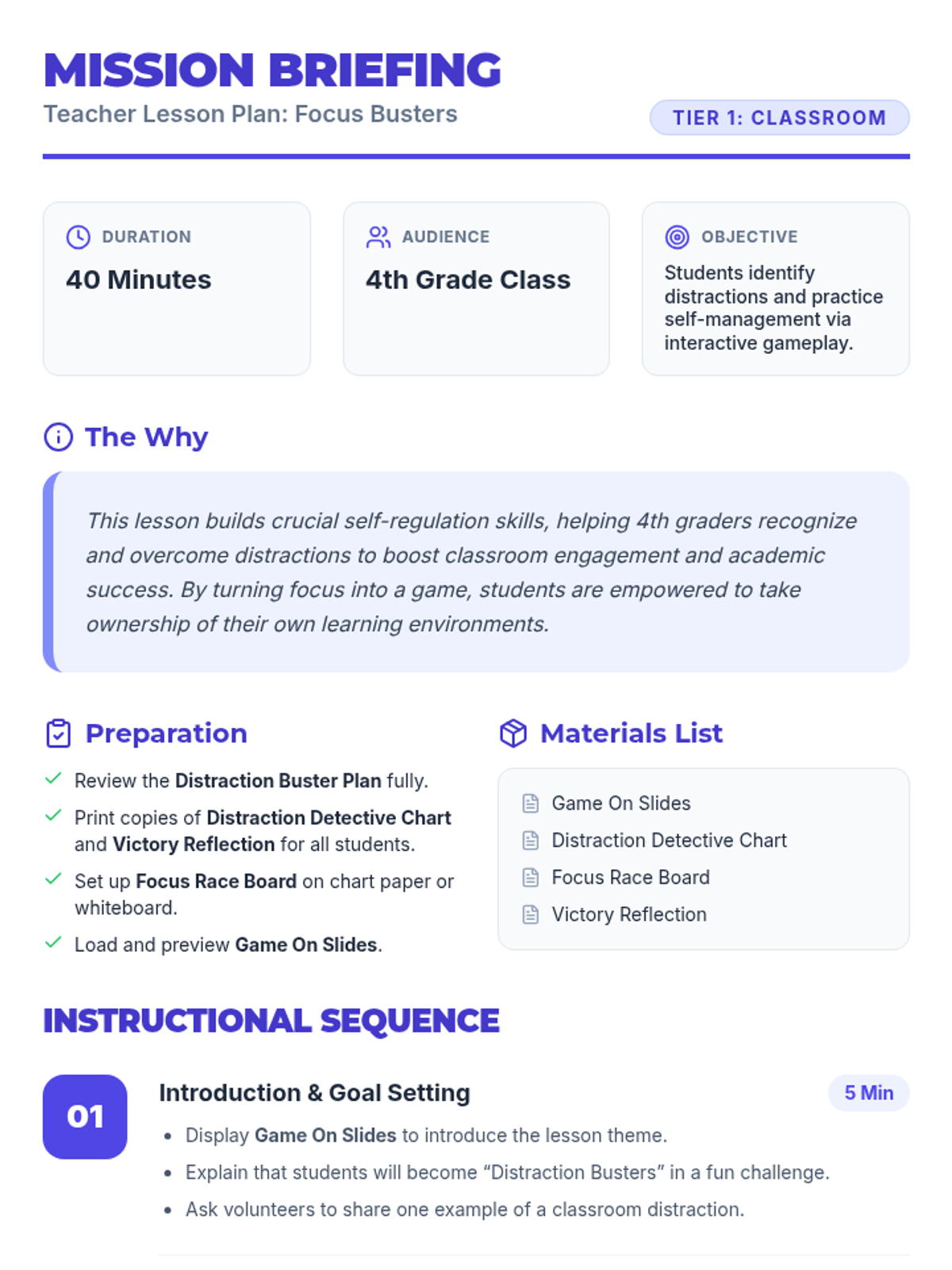 An interactive game-based lesson where 4th graders learn to identify distractions and practice self-management strategies to stay focused during academic tasks.