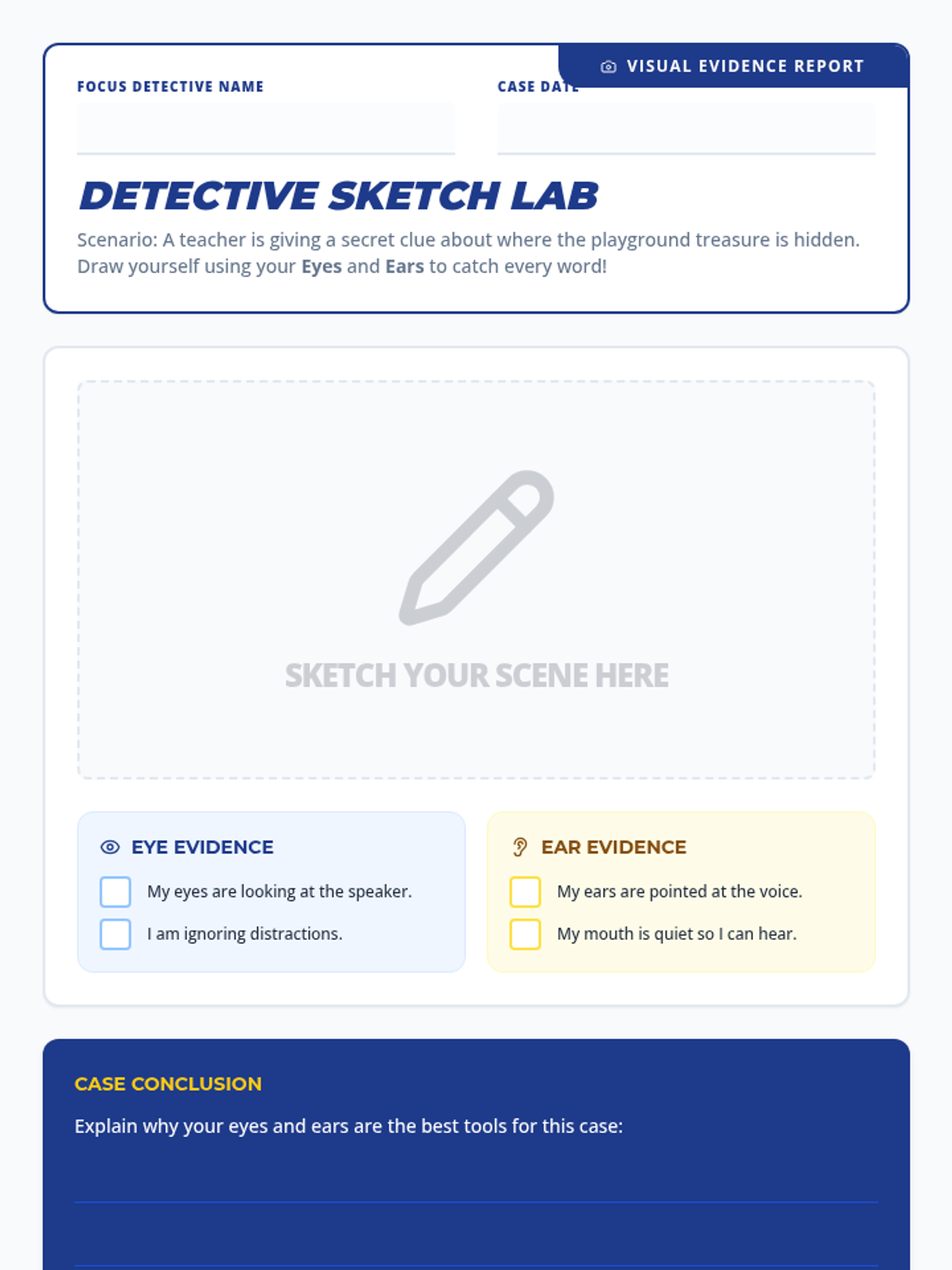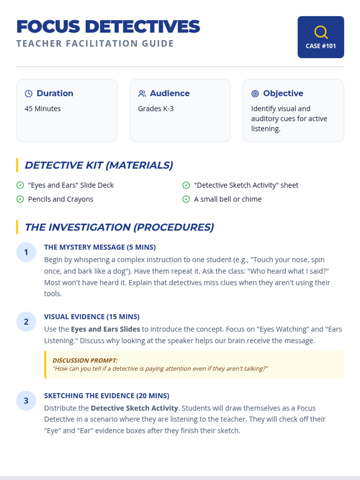 A Social Emotional Learning lesson designed for elementary students to master the art of 'Eyes and Ears' listening through an investigative 'Focus Detectives' theme. students will learn to identify visual and auditory cues for active listening.