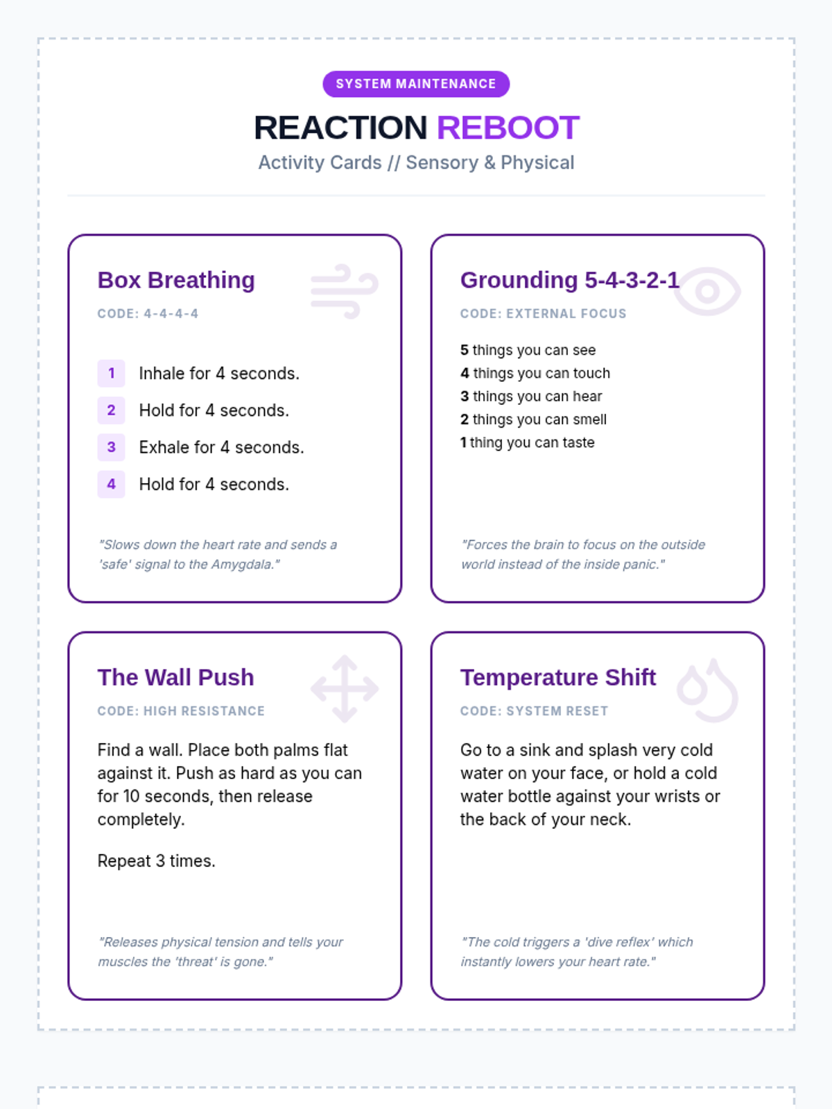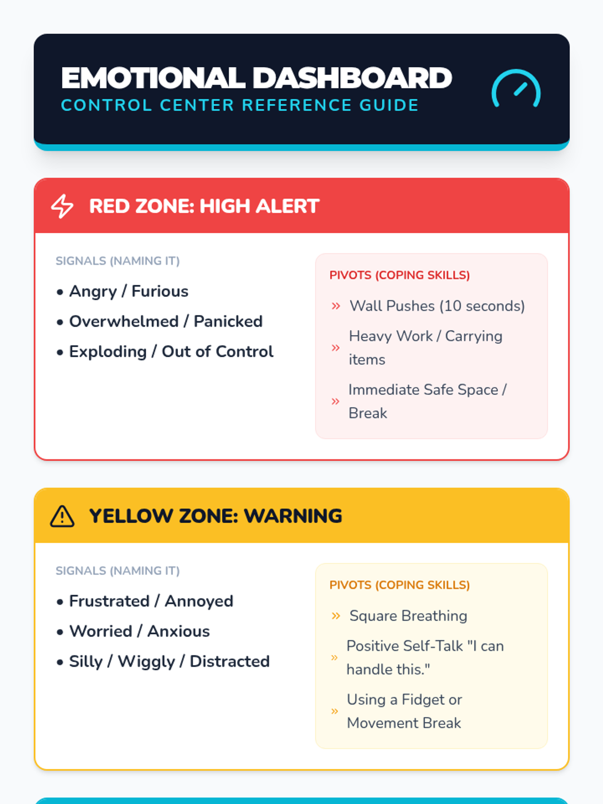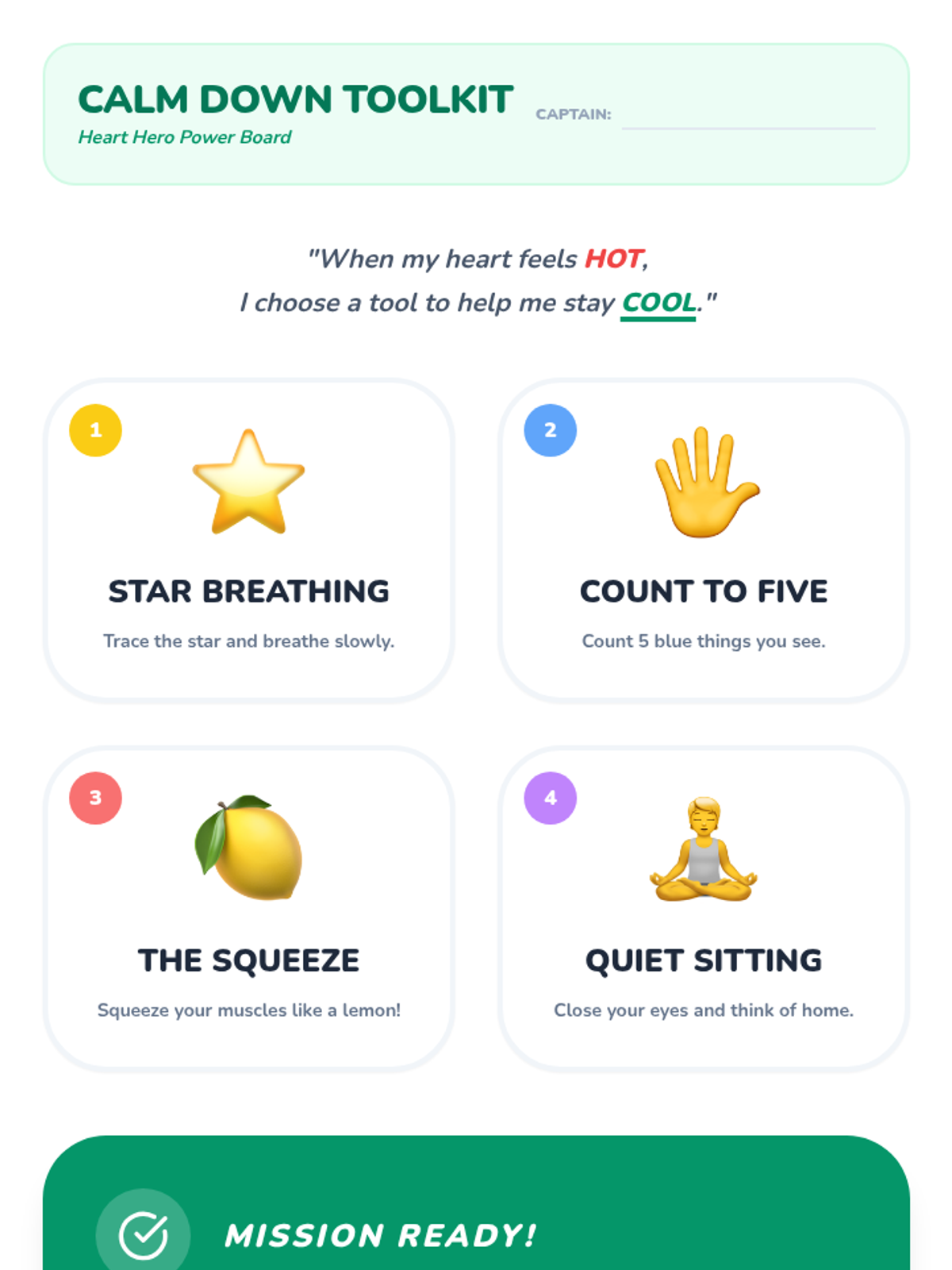 Students learn and practice specific calming strategies and how to transition back to learning after experiencing big emotions.