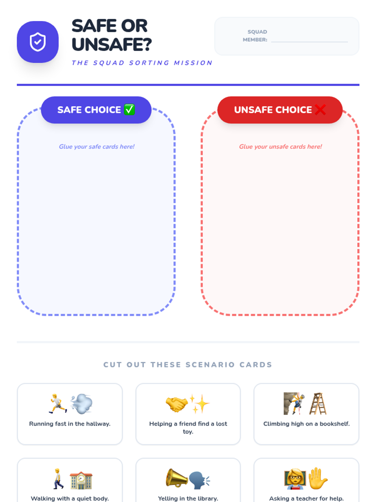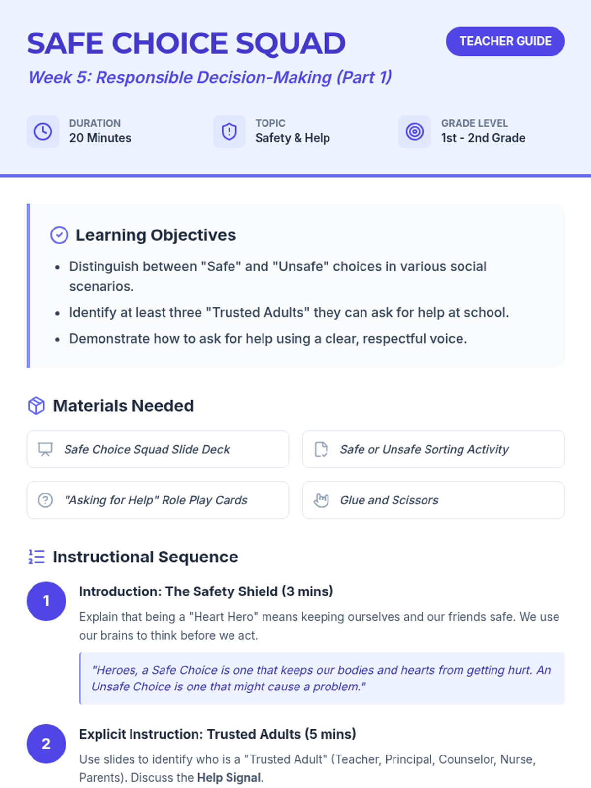 Students identify safe versus unsafe choices and learn when and how to ask a trusted adult for help.