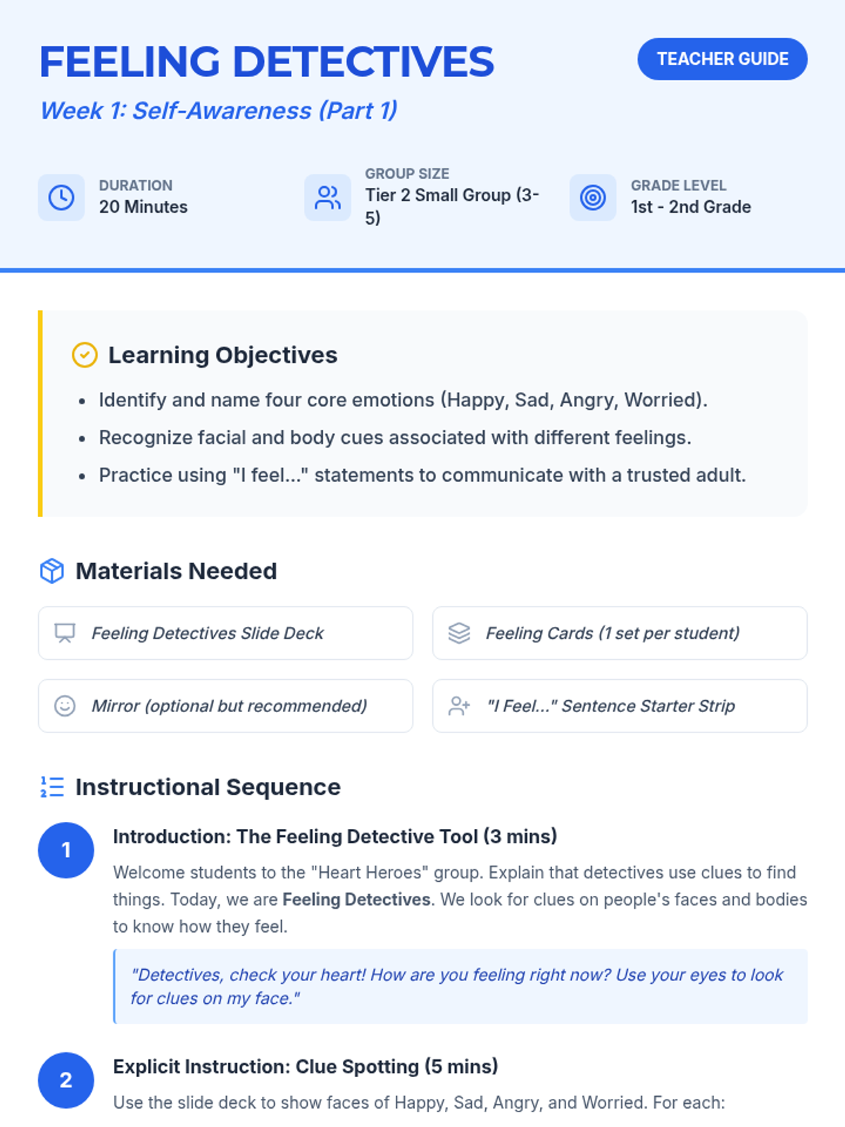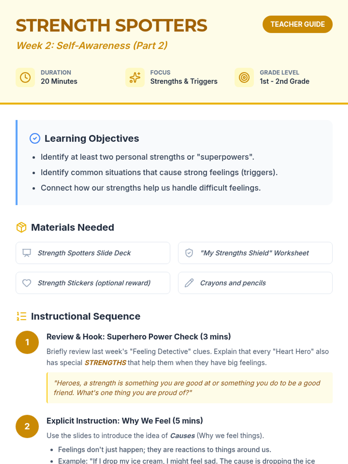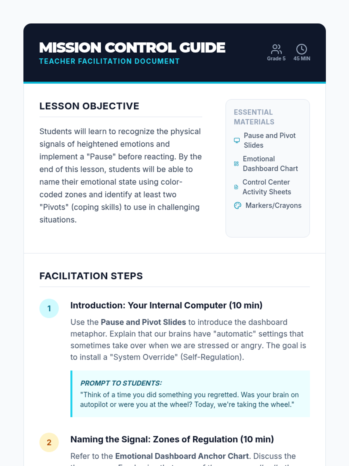 A comprehensive lesson designed for 5th-grade students to master self-regulation by learning to identify emotions and pause before reacting. Includes instructional slides, a visual anchor chart, a guided activity, and a teacher facilitation guide.