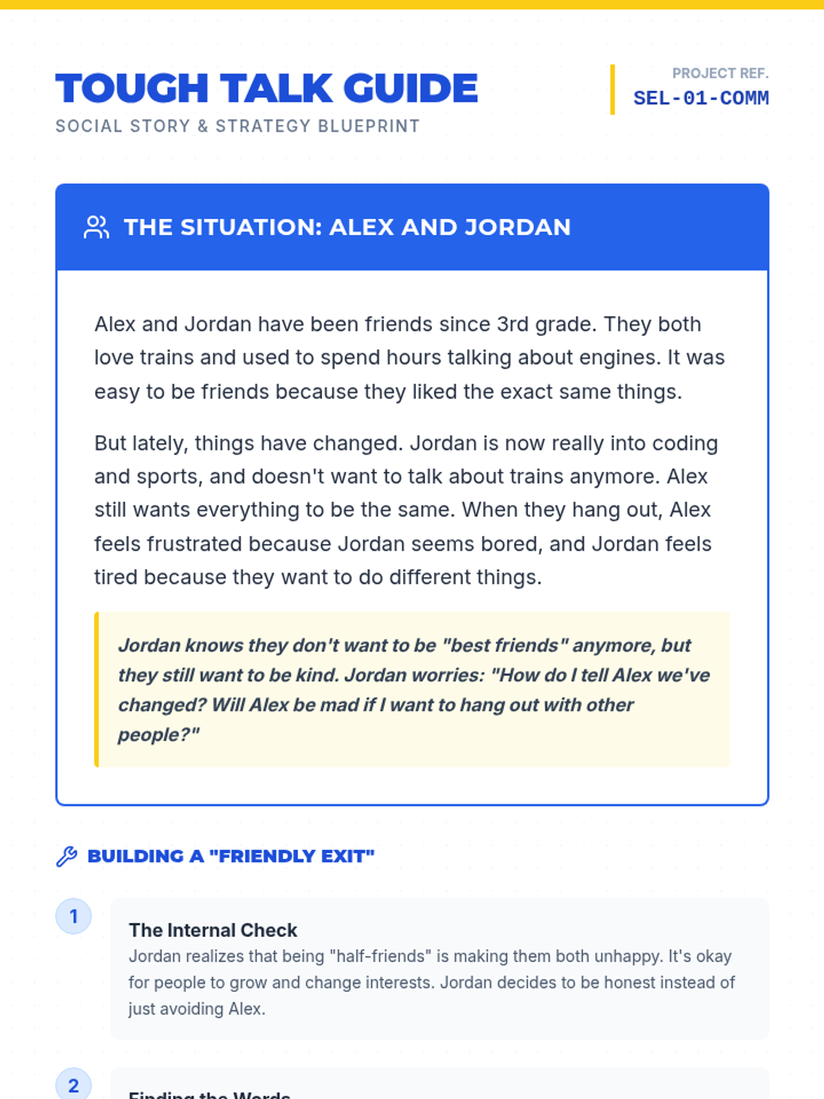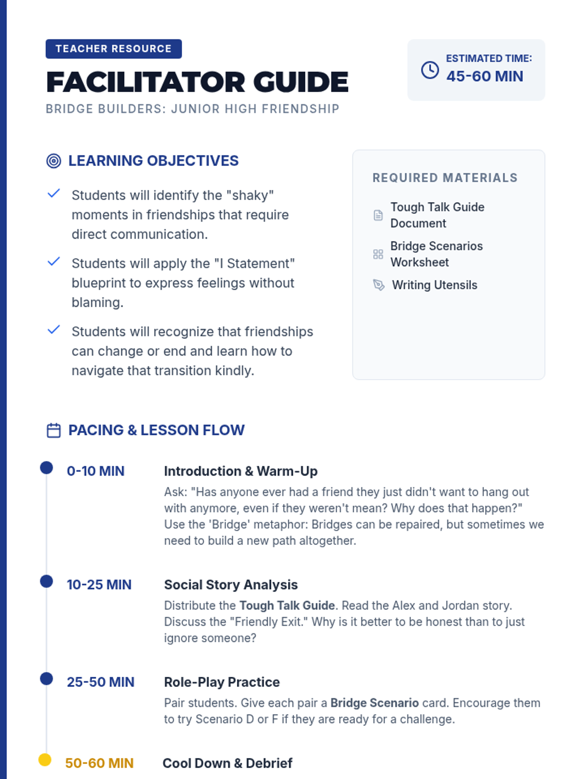 A comprehensive social-emotional learning lesson focused on developing the communication skills needed to navigate difficult conversations in junior high friendships. It includes a social story, role-playing practice, visual aids, and a teacher facilitation guide.