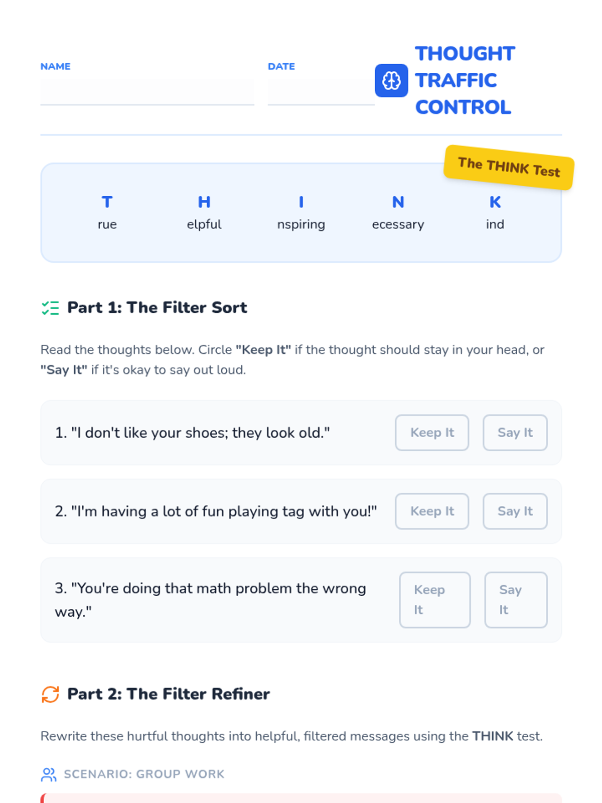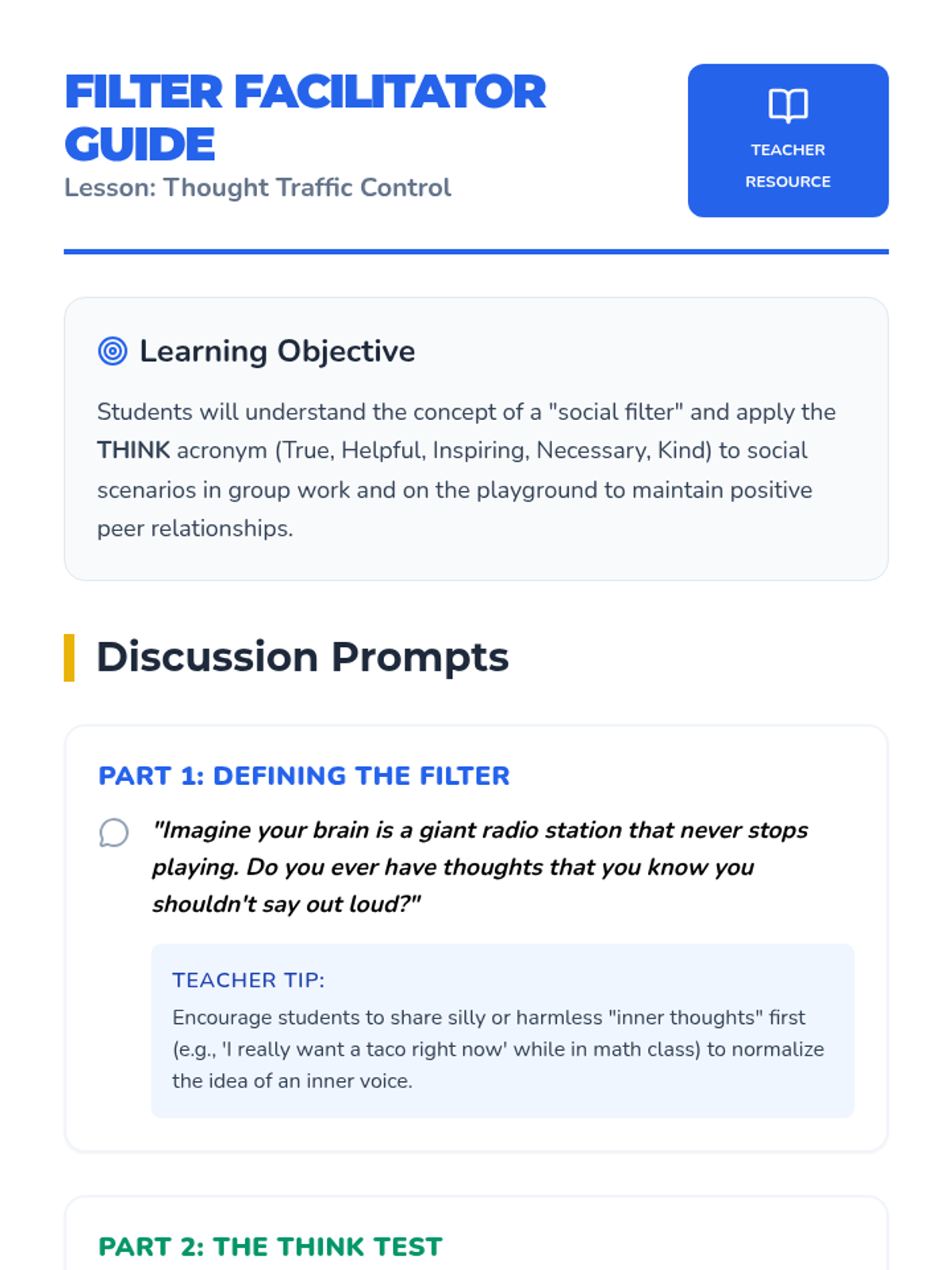 In this lesson, students will learn the 'THINK' acronym to evaluate their thoughts before speaking, specifically focusing on interactions during group work and on the playground.