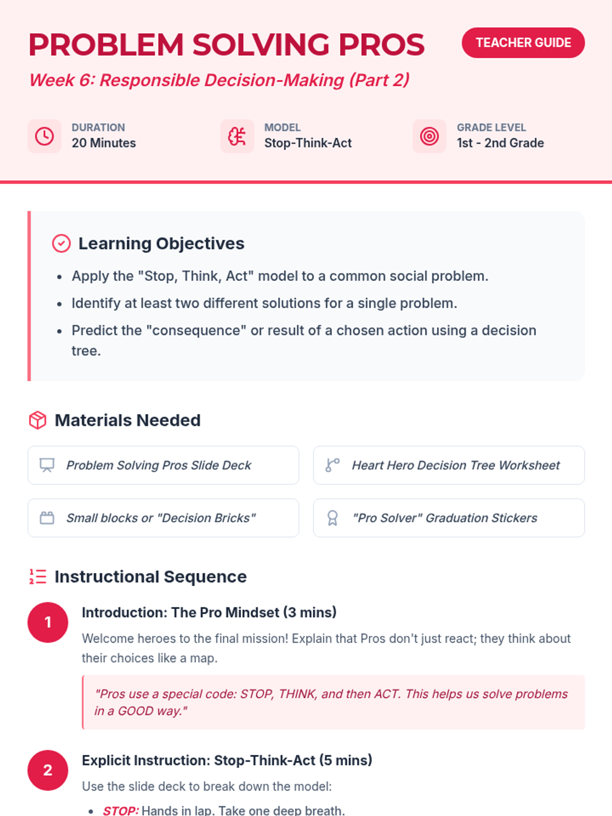 Students apply the 'Stop, Think, Act' model and decision trees to solve common social problems.