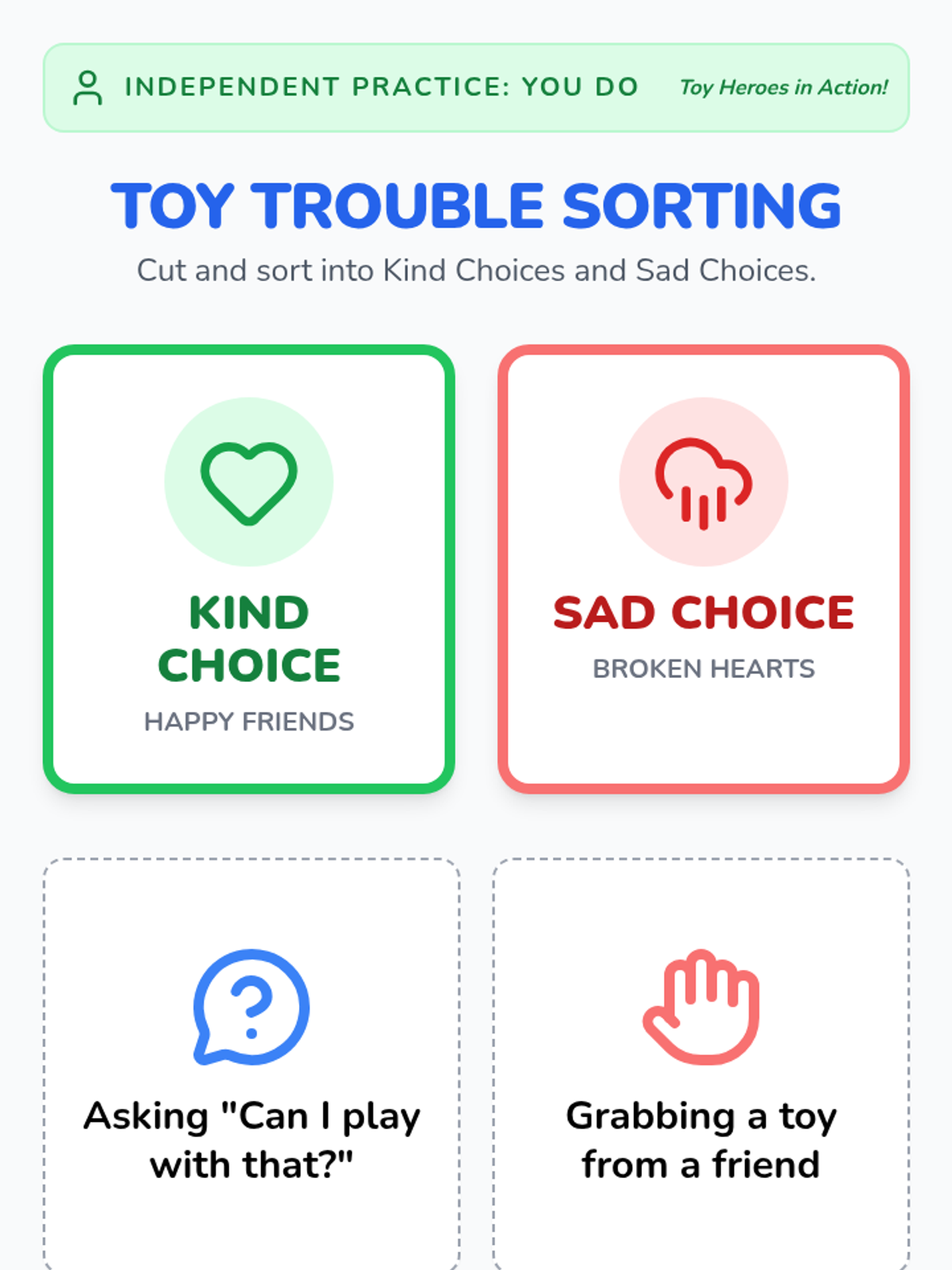A short, engaging 10-minute lesson for Pre-K students focused on respecting others' belongings through visual storytelling and interactive sorting.