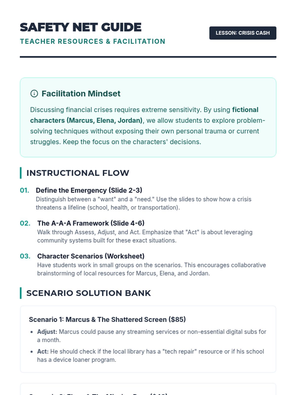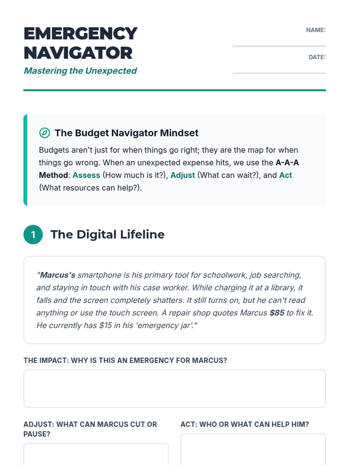 A practical lesson designed to help students experiencing housing instability navigate financial emergencies through scenario-based problem solving and resource mapping.
