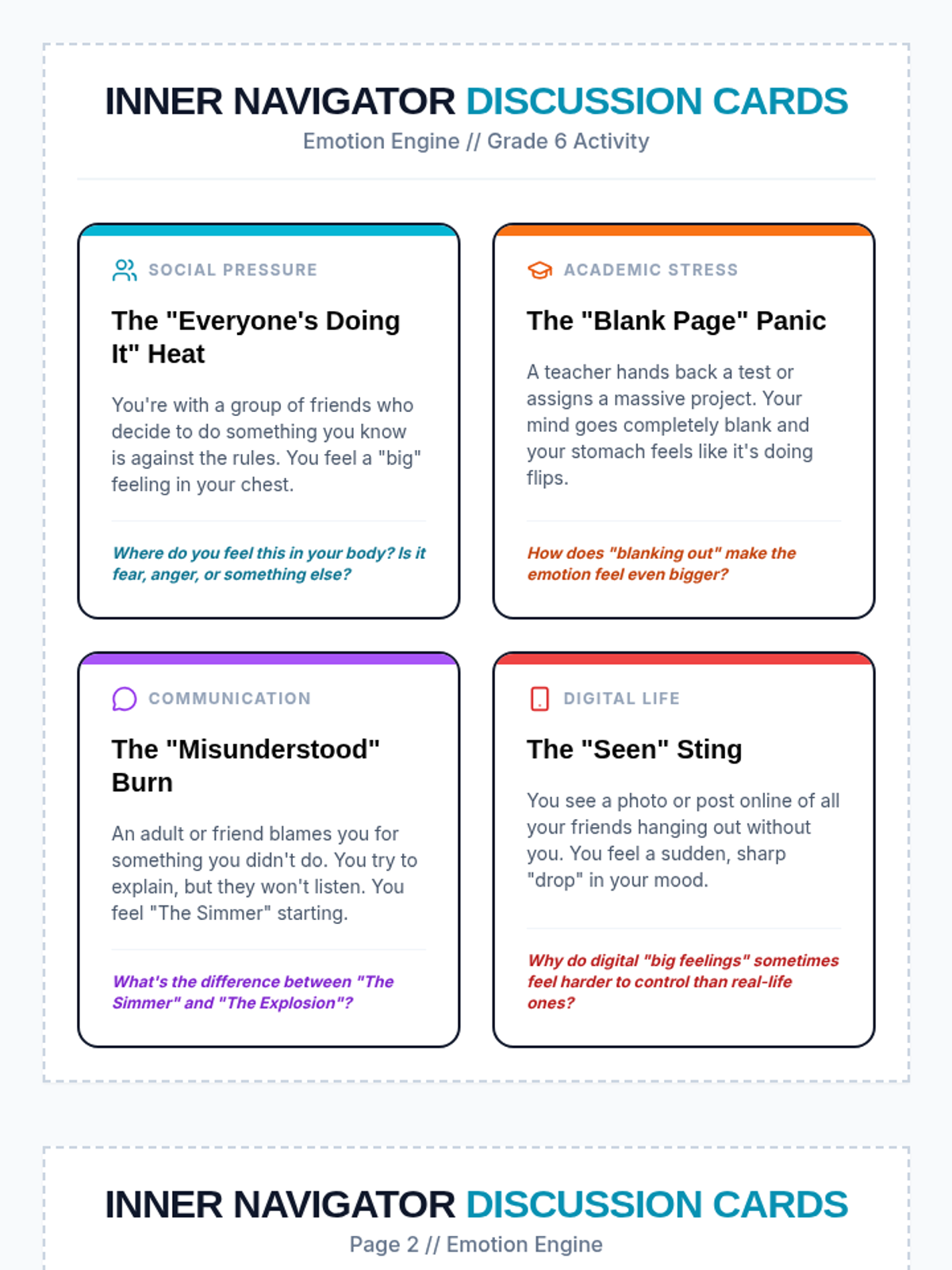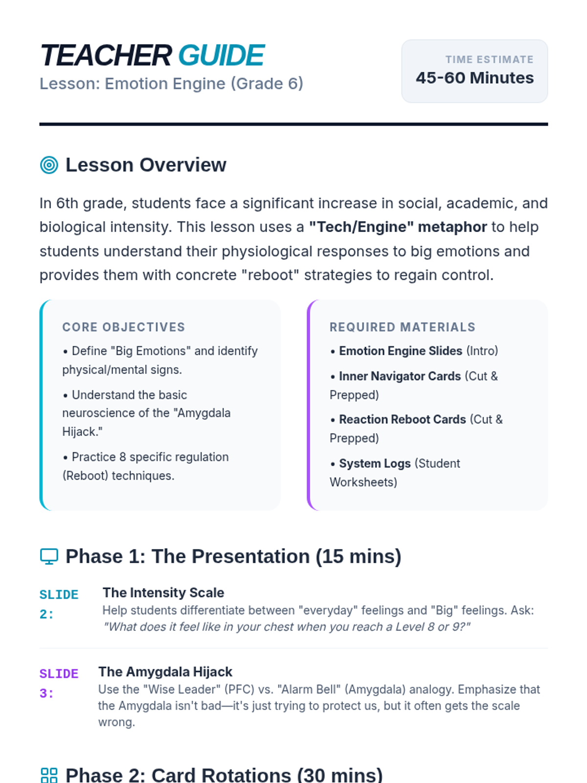 A comprehensive lesson for 6th graders to identify, understand, and regulate intense emotions through interactive discussions and tactile activity cards.