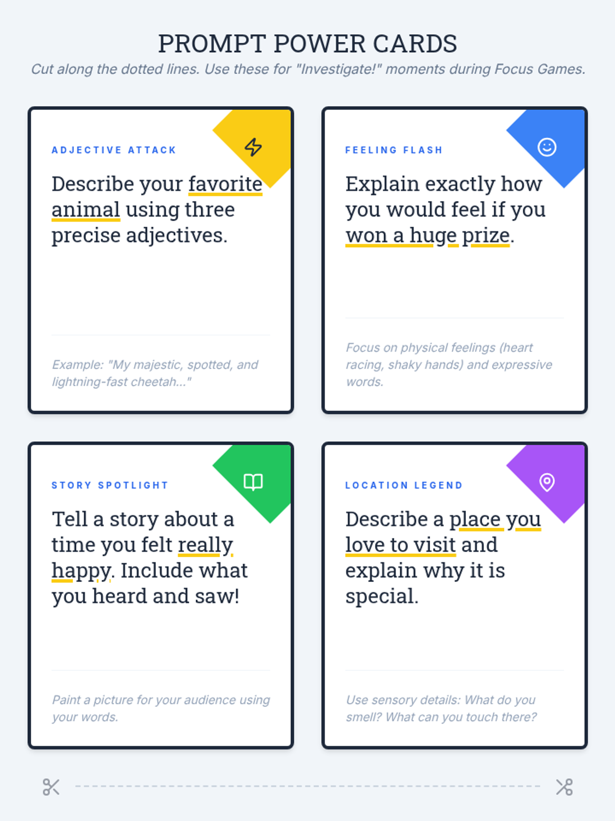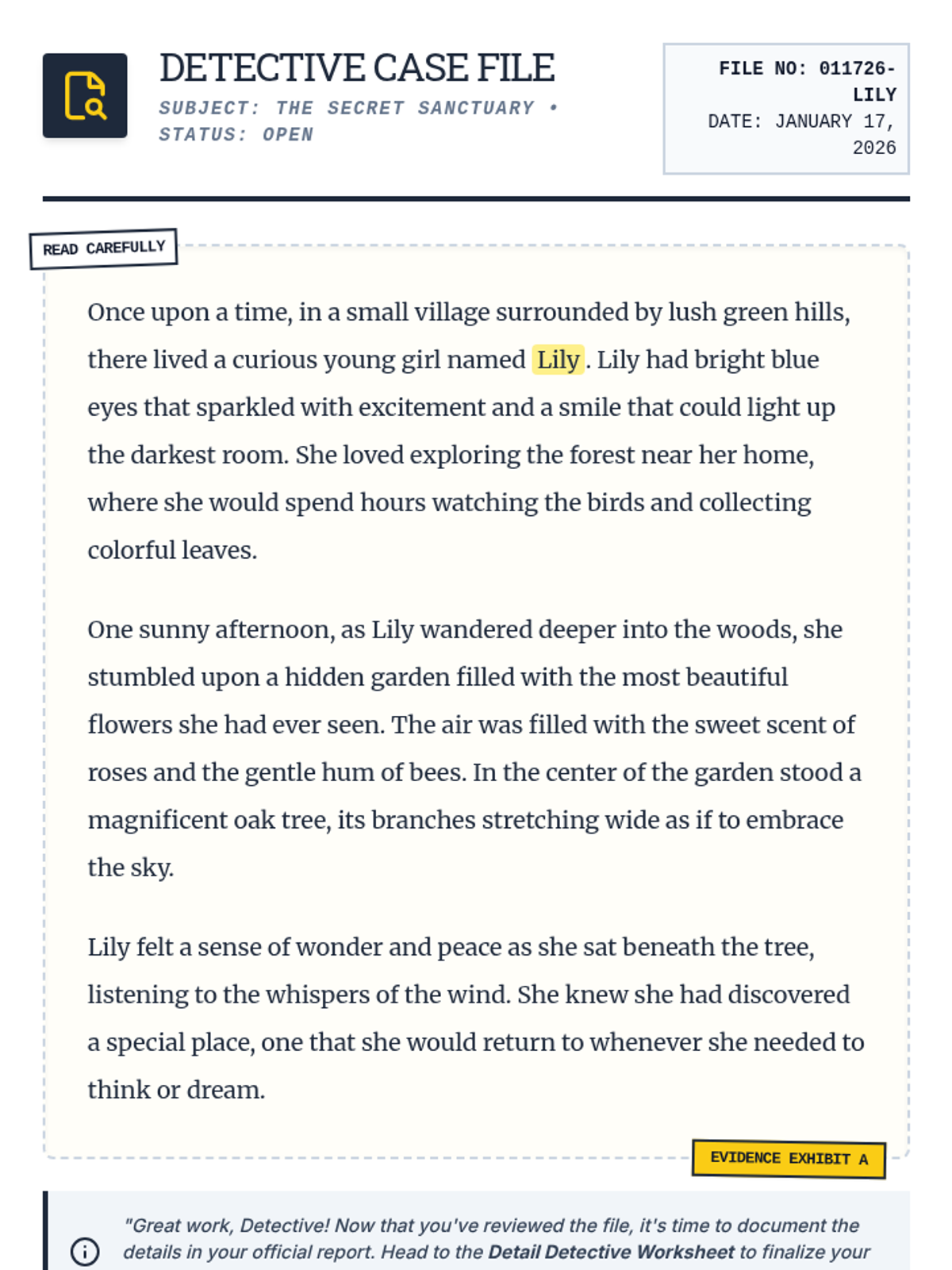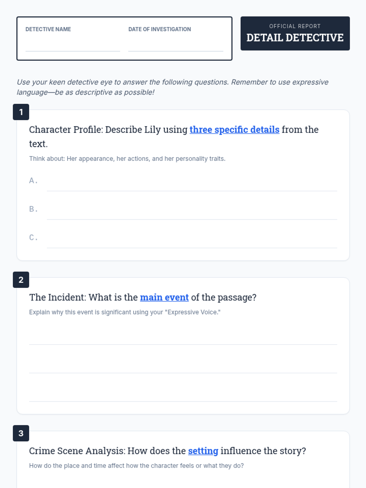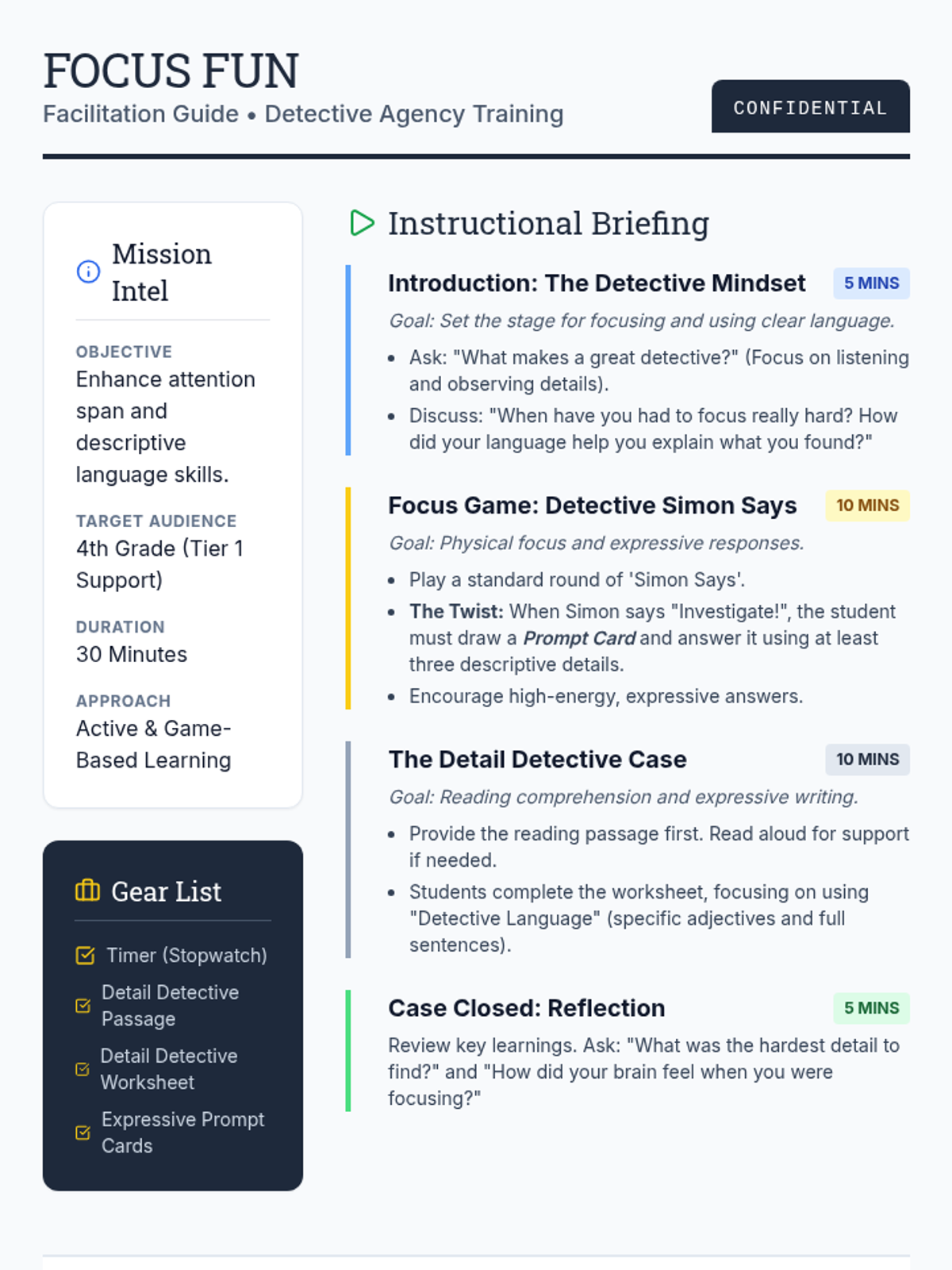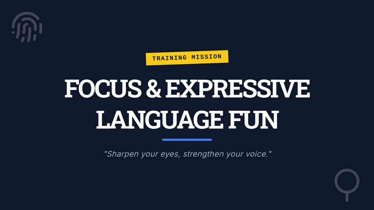A high-energy lesson designed to sharpen focus and expressive language through game-based learning and text analysis, themed around a detective agency.