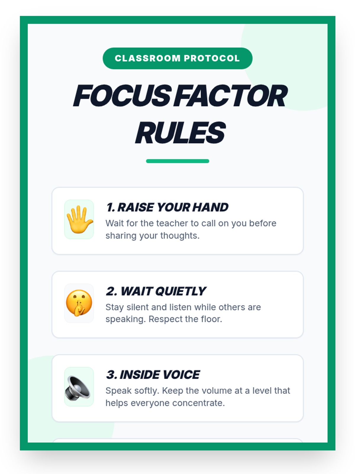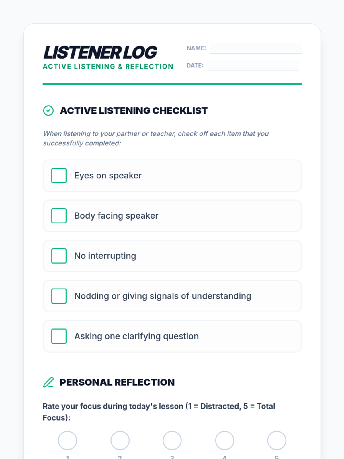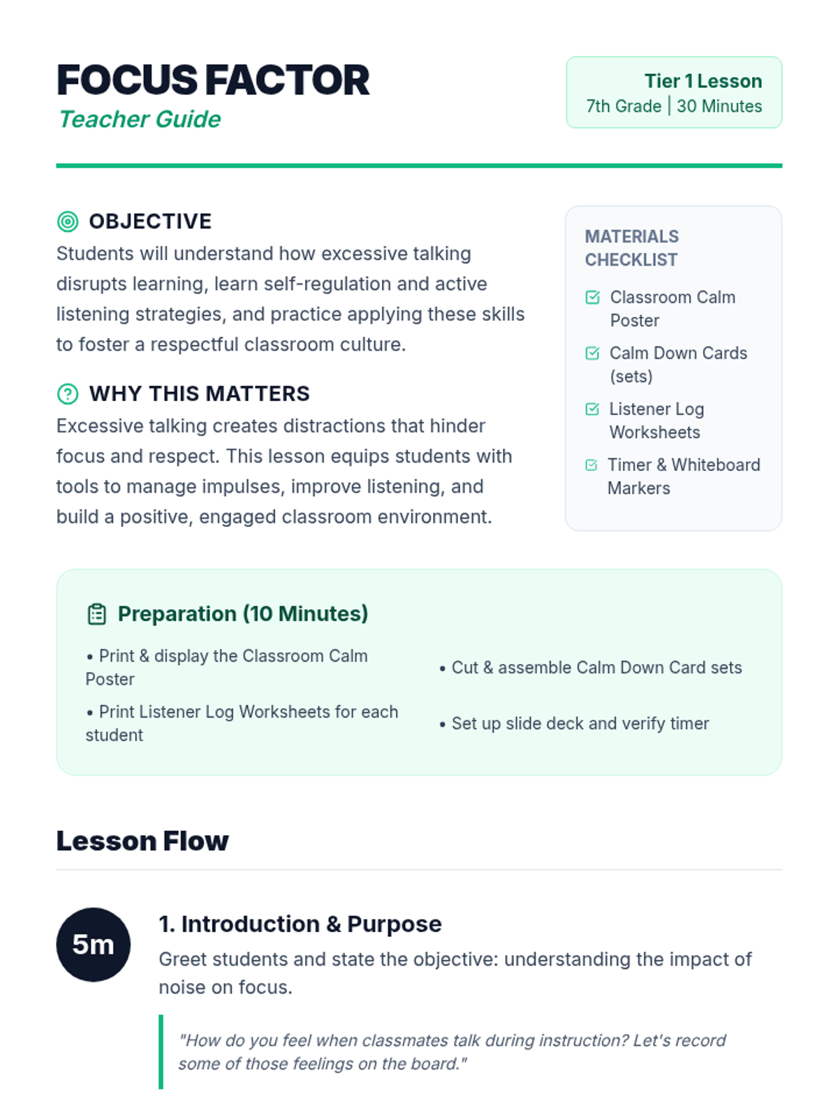 A 30-minute Tier 1 lesson for 7th graders focused on reducing classroom distractions through self-regulation and active listening. Students learn the impact of excessive talking and practice concrete strategies to improve focus and respect.