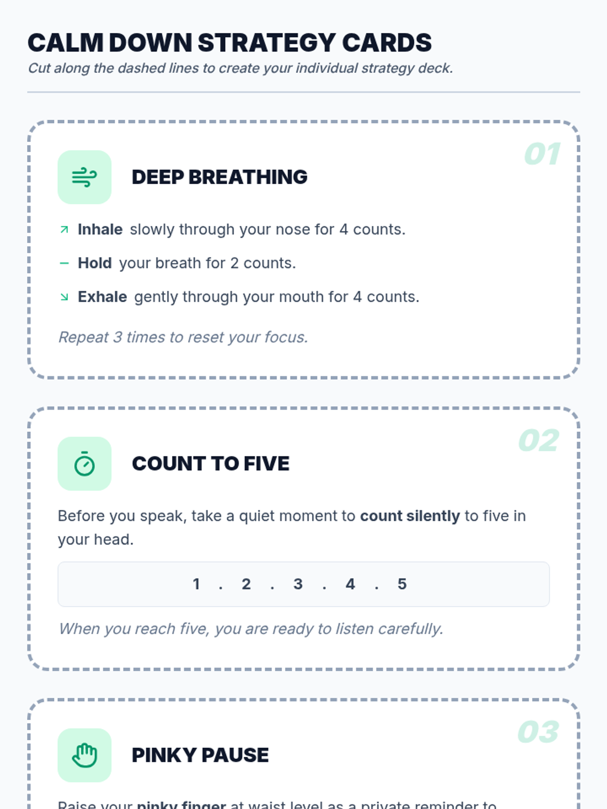 Introduces physical and environmental coping strategies, including deep breathing, grounding techniques, and healthy lifestyle habits.