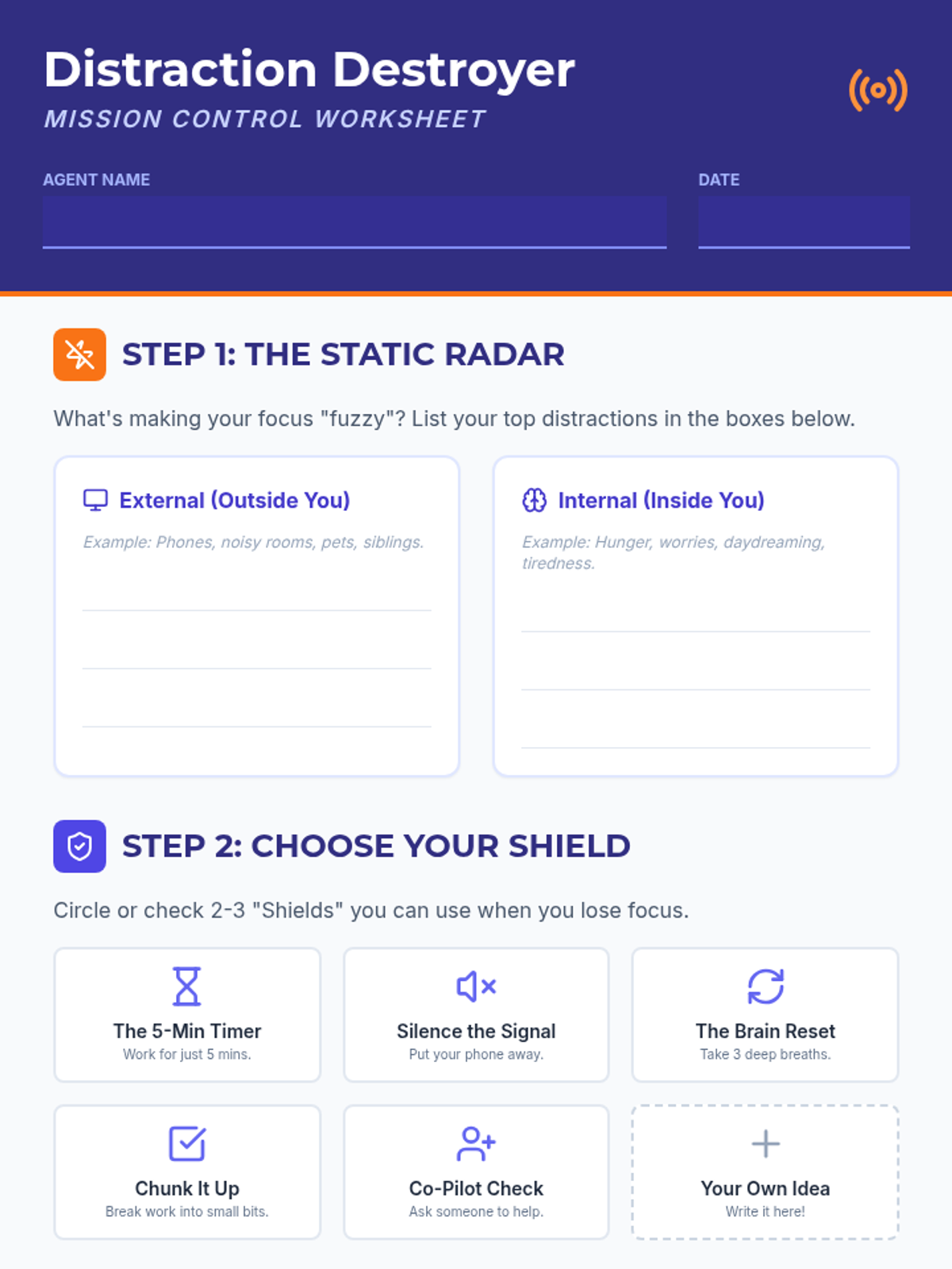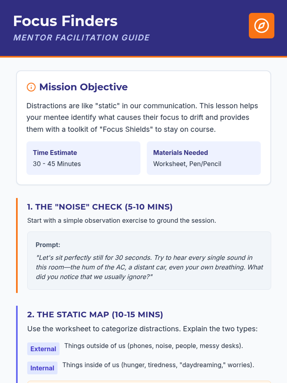 A mentor-led lesson designed to help mentees identify personal distractions and develop practical 'Focus Shield' coping strategies to stay on track.