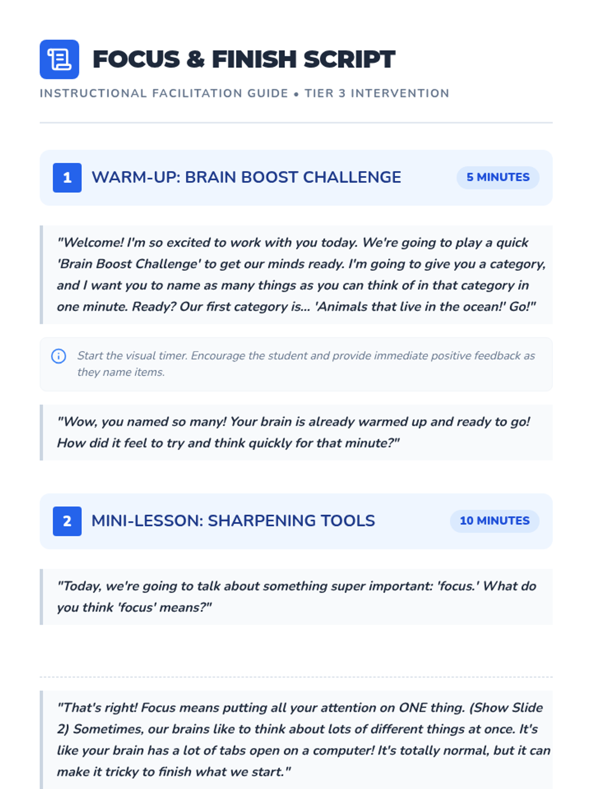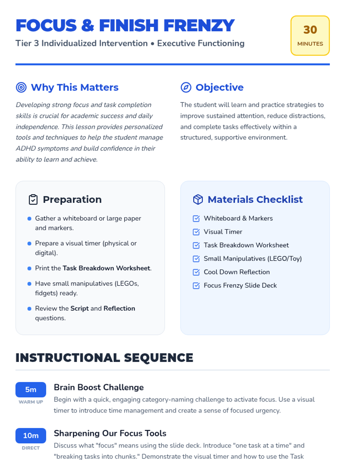 A 30-minute, individualized Tier 3 lesson for 3rd-grade students focused on executive functioning, sustained attention, and task completion strategies for ADHD support.