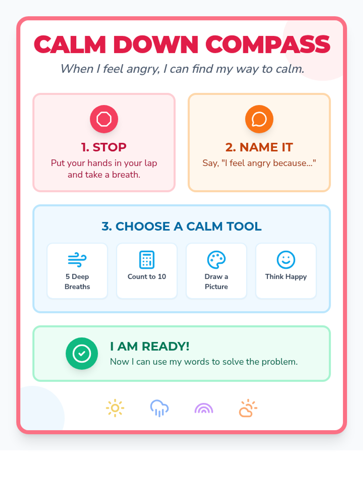 Introduces young learners to self-regulation strategies through highly visual anchor charts and simple cool-down techniques.