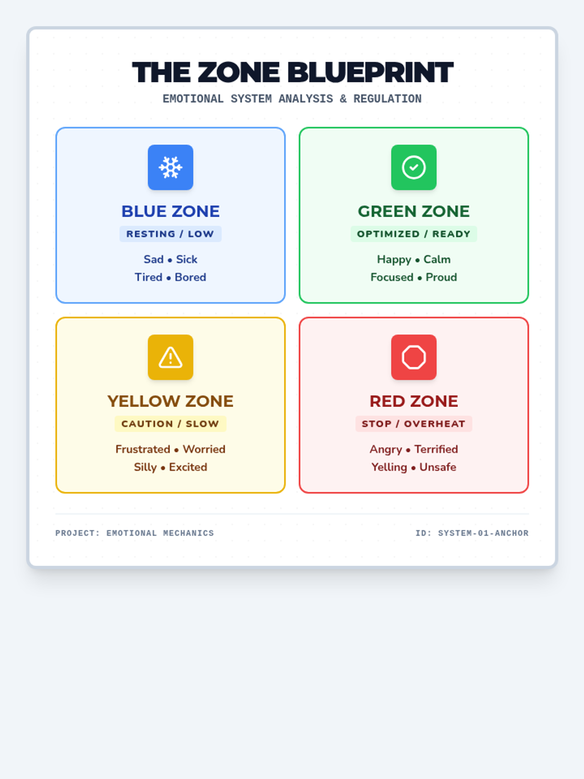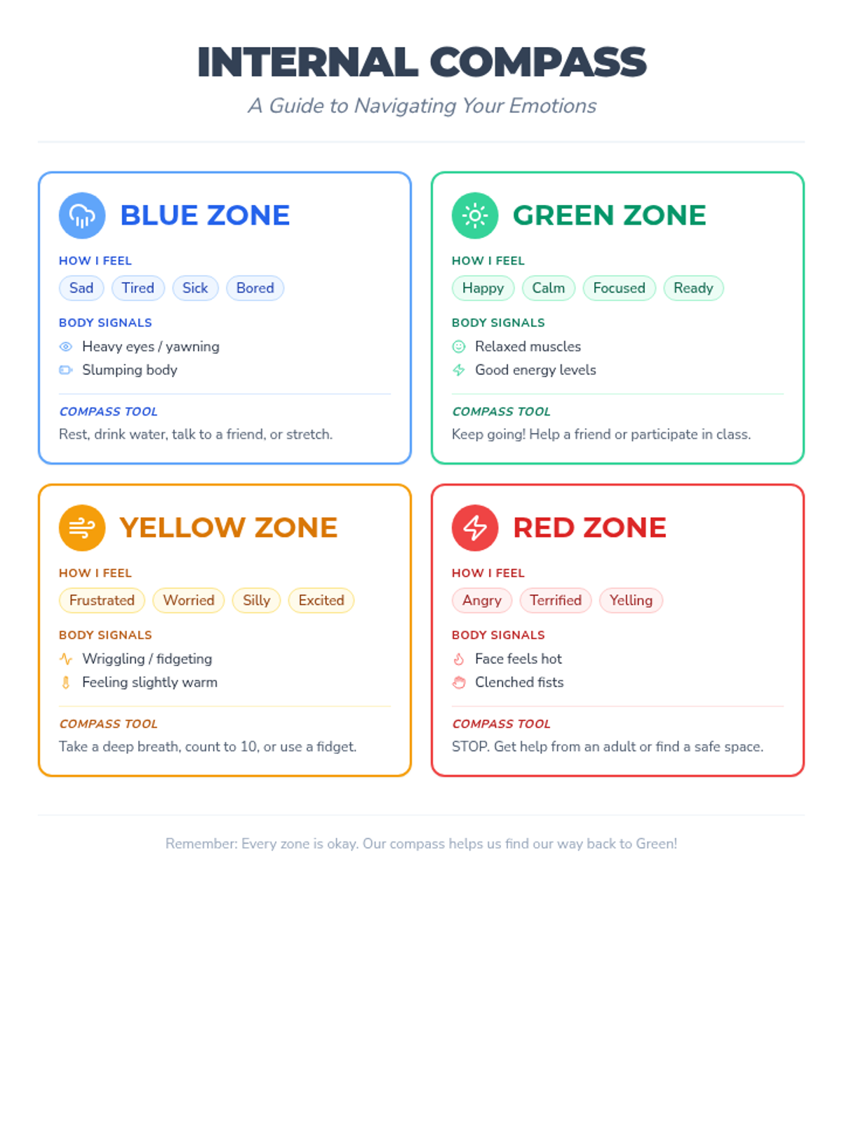 Students will learn to identify the four emotional zones (Blue, Green, Yellow, Red) and recognize their own physical and emotional cues for each.