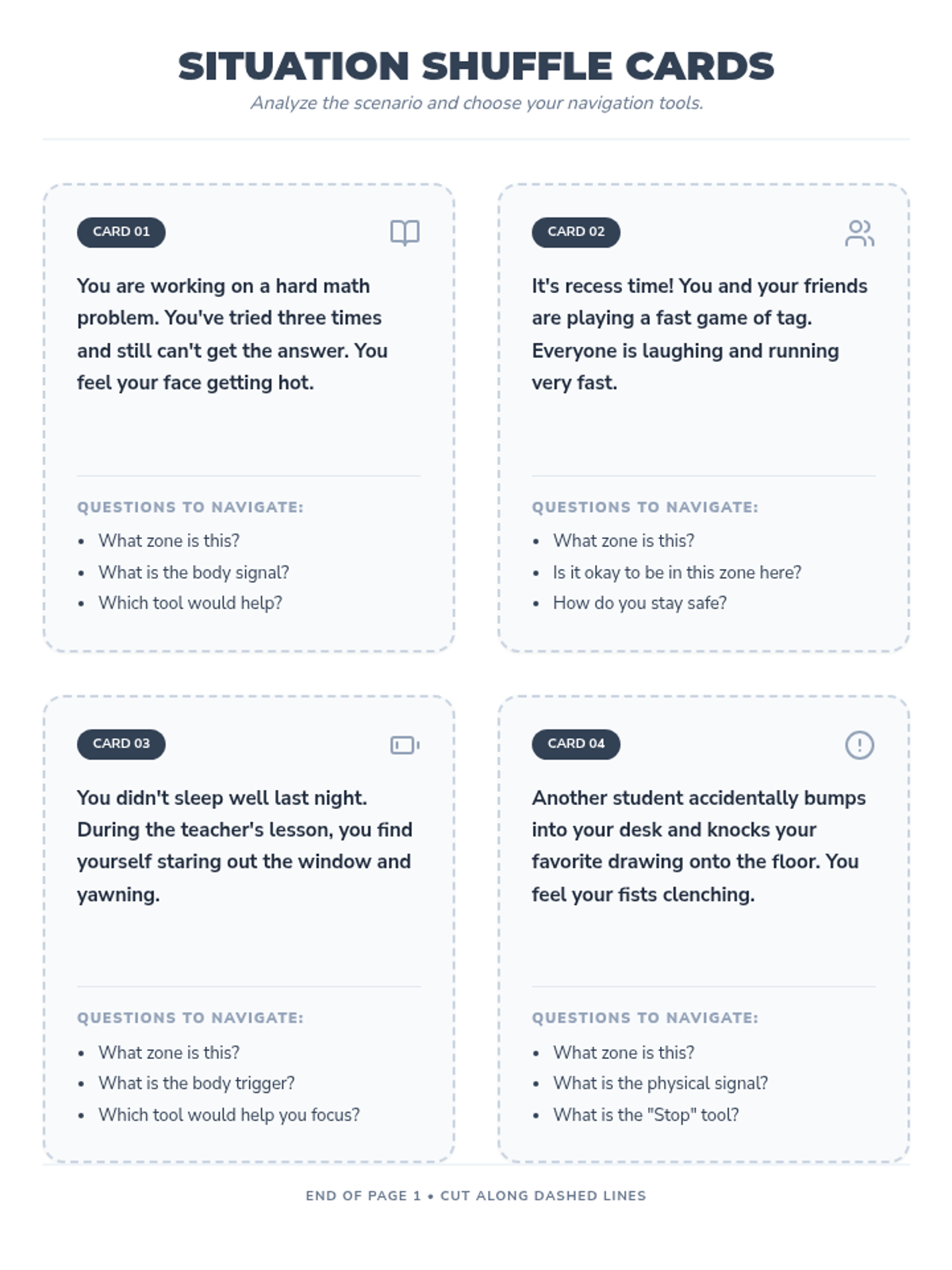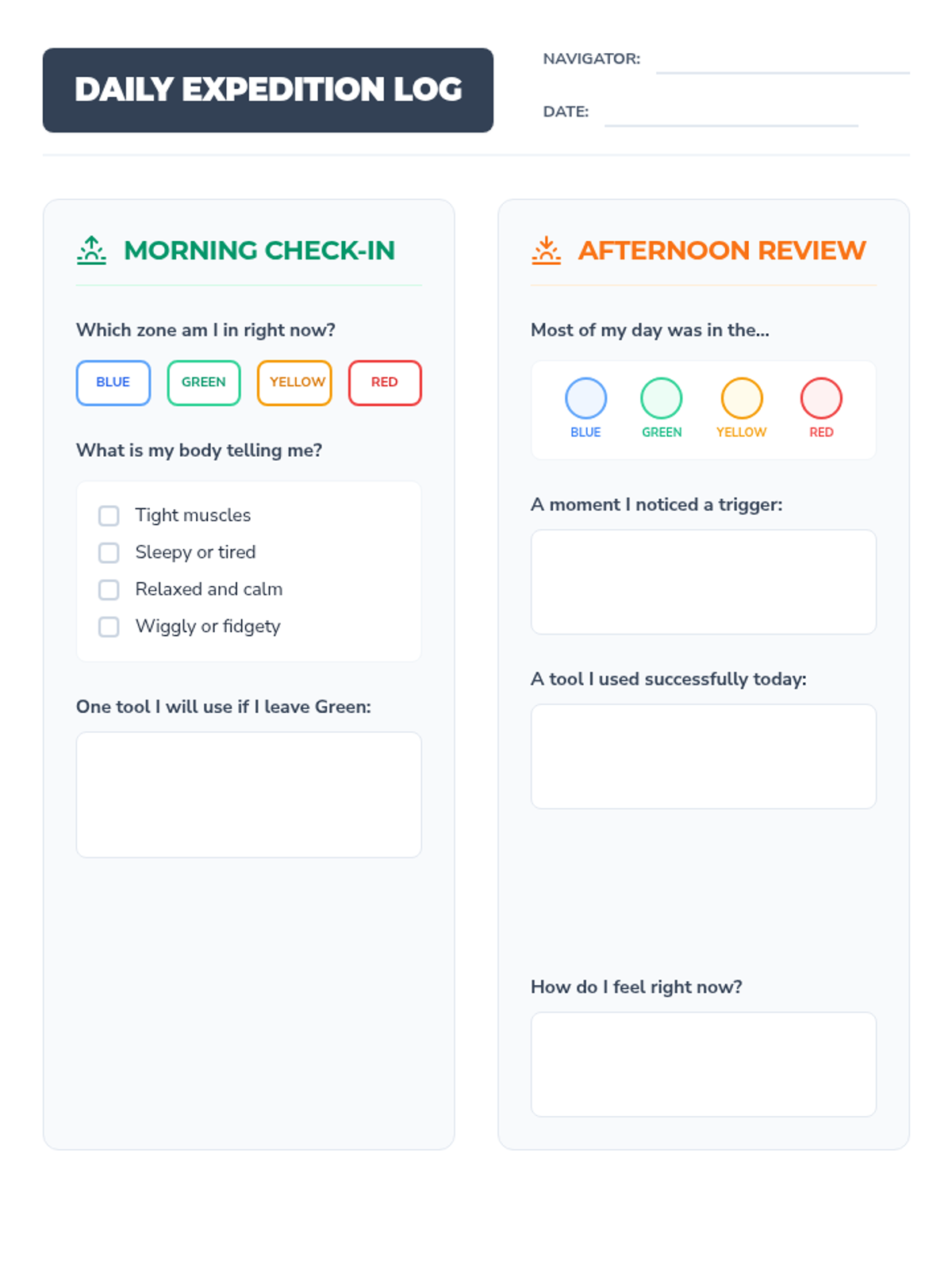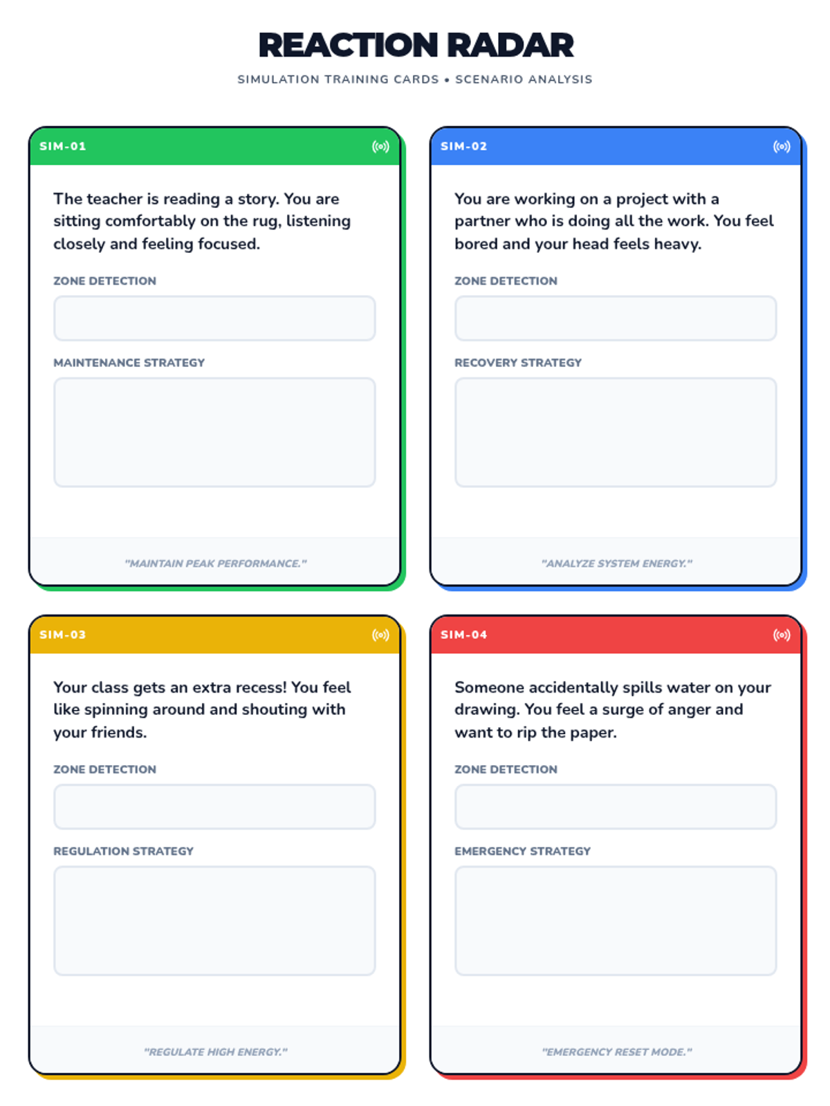 A comprehensive set of tools for students to identify their emotional states, recognize physical triggers, and build a personalized toolbox of coping strategies using the four color-coded zones.