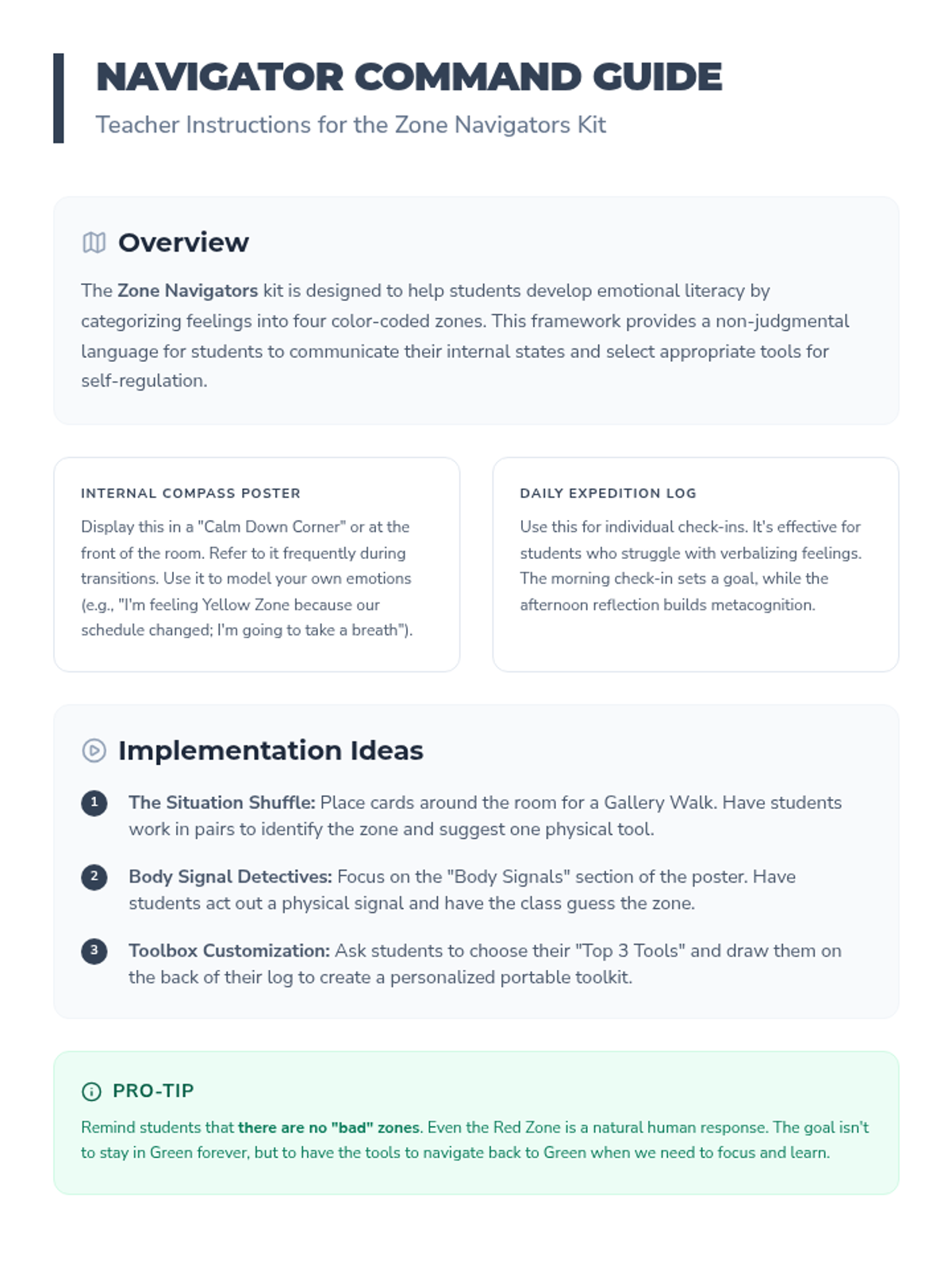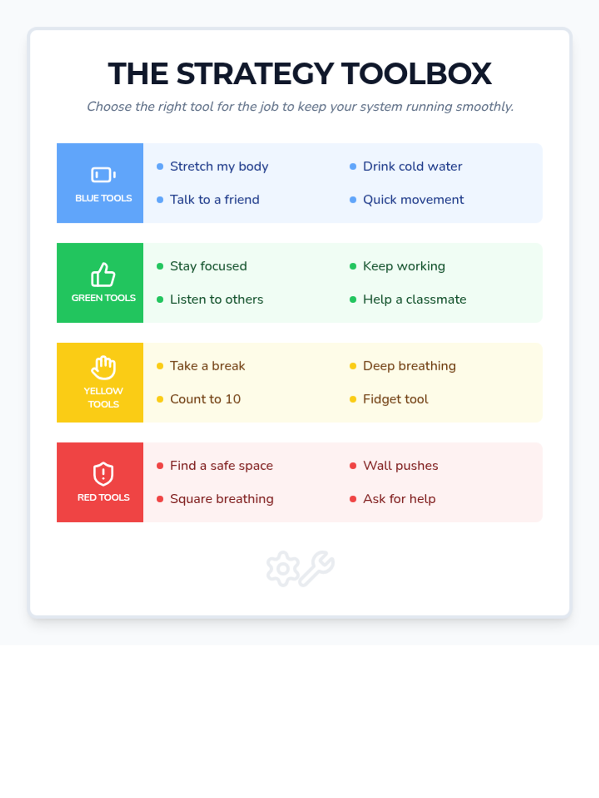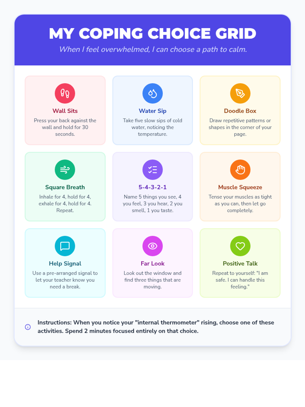 A comprehensive set of tools for students to identify their emotional states, recognize physical triggers, and build a personalized toolbox of coping strategies using the four color-coded zones.
