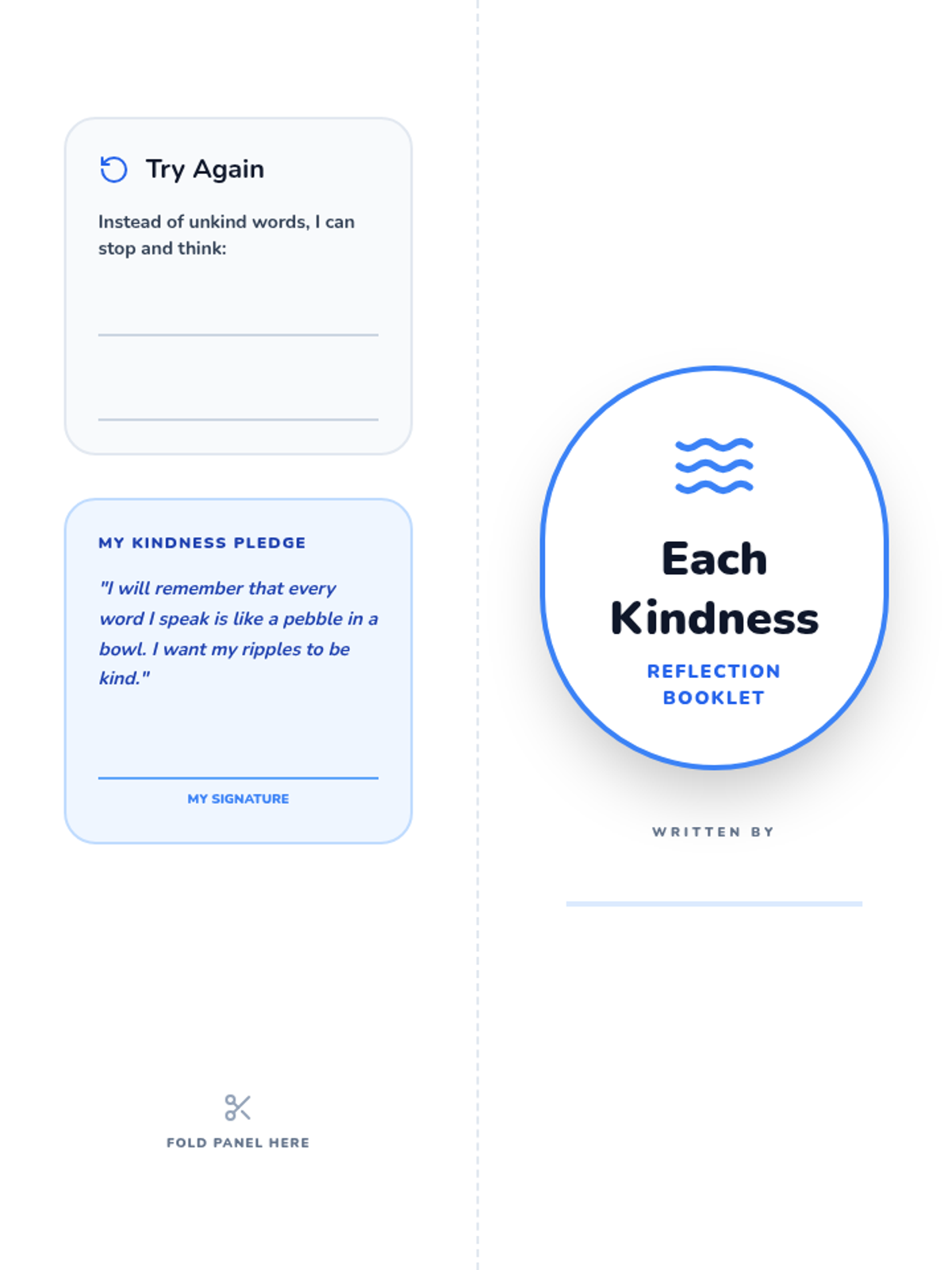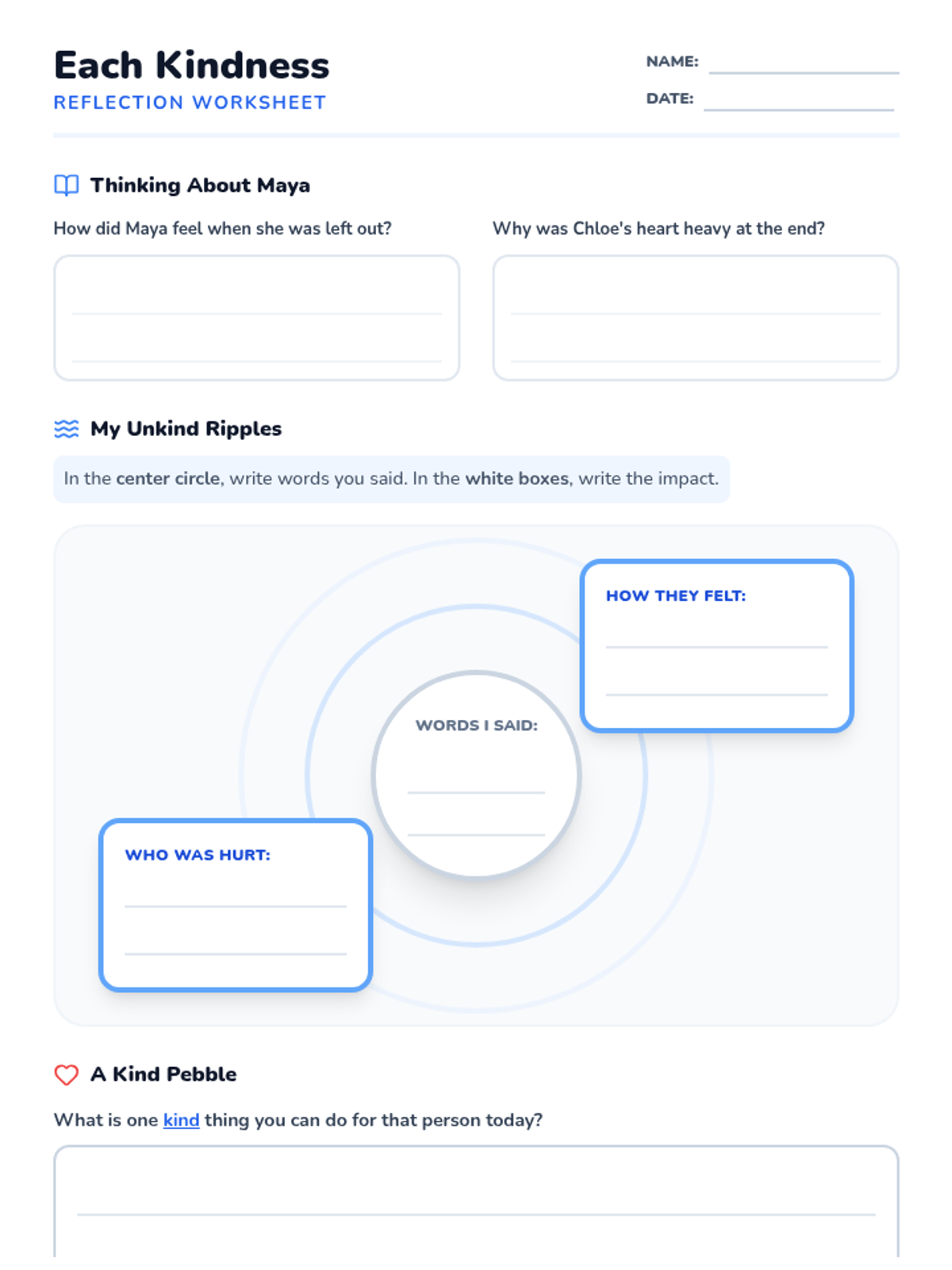 A set of reflective materials based on the book 'Each Kindness' to help students understand the impact of their words and develop empathy for others.