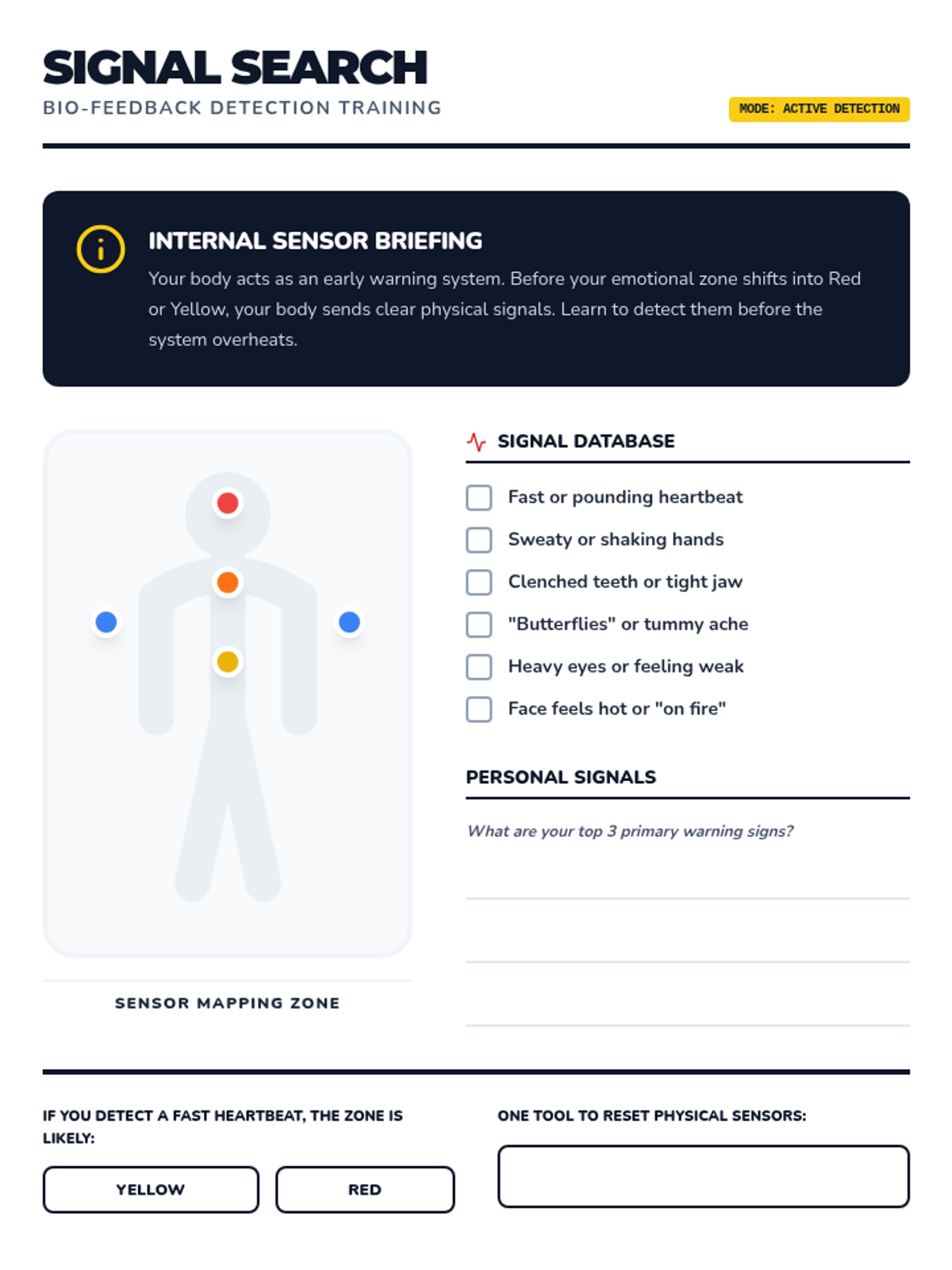 Focused on identifying the physical and emotional 'early warning signs' of dysregulation, such as anxiety and frustration.